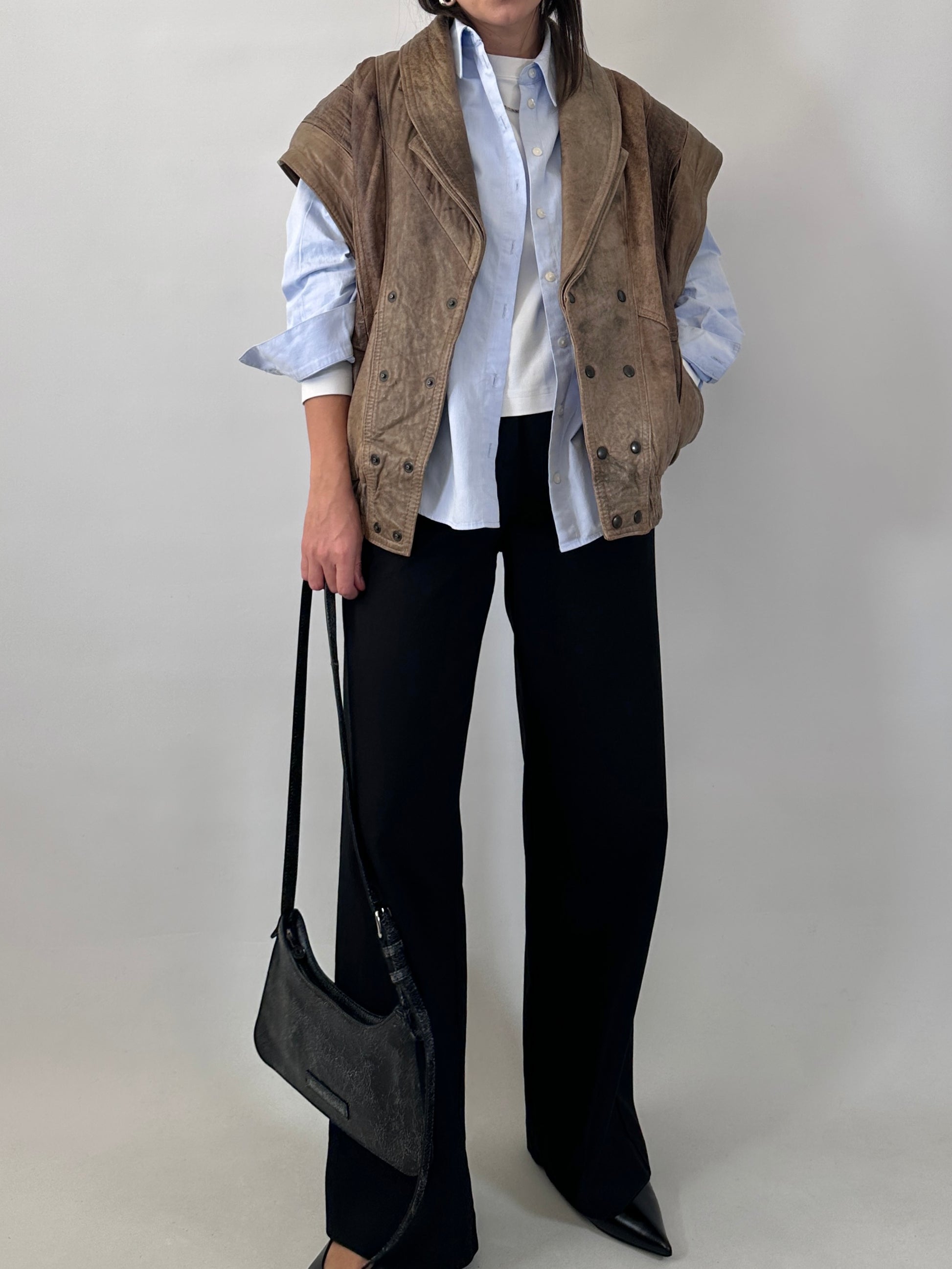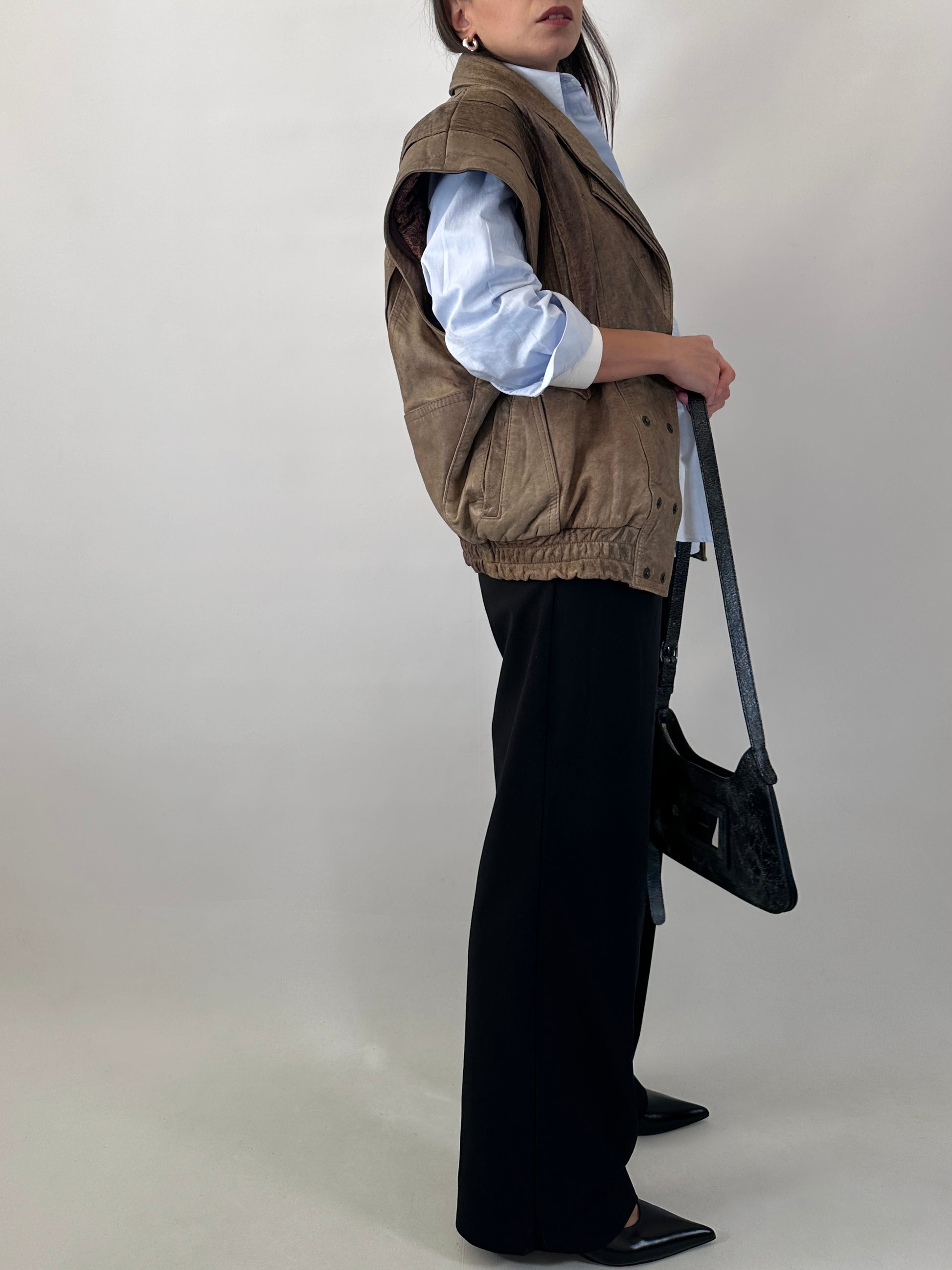 Bomber vintage anni 80 in vera pelle effetto vissuto. Abbottonatura frontale con bottoni automatici, doppiopetto, collo sciallato, elastico sul fondo. Le maniche sono rimovibili per trasformarlo in gilet e utilizzarlo in diversi periodi dell’anno per diverse occasioni d’uso.