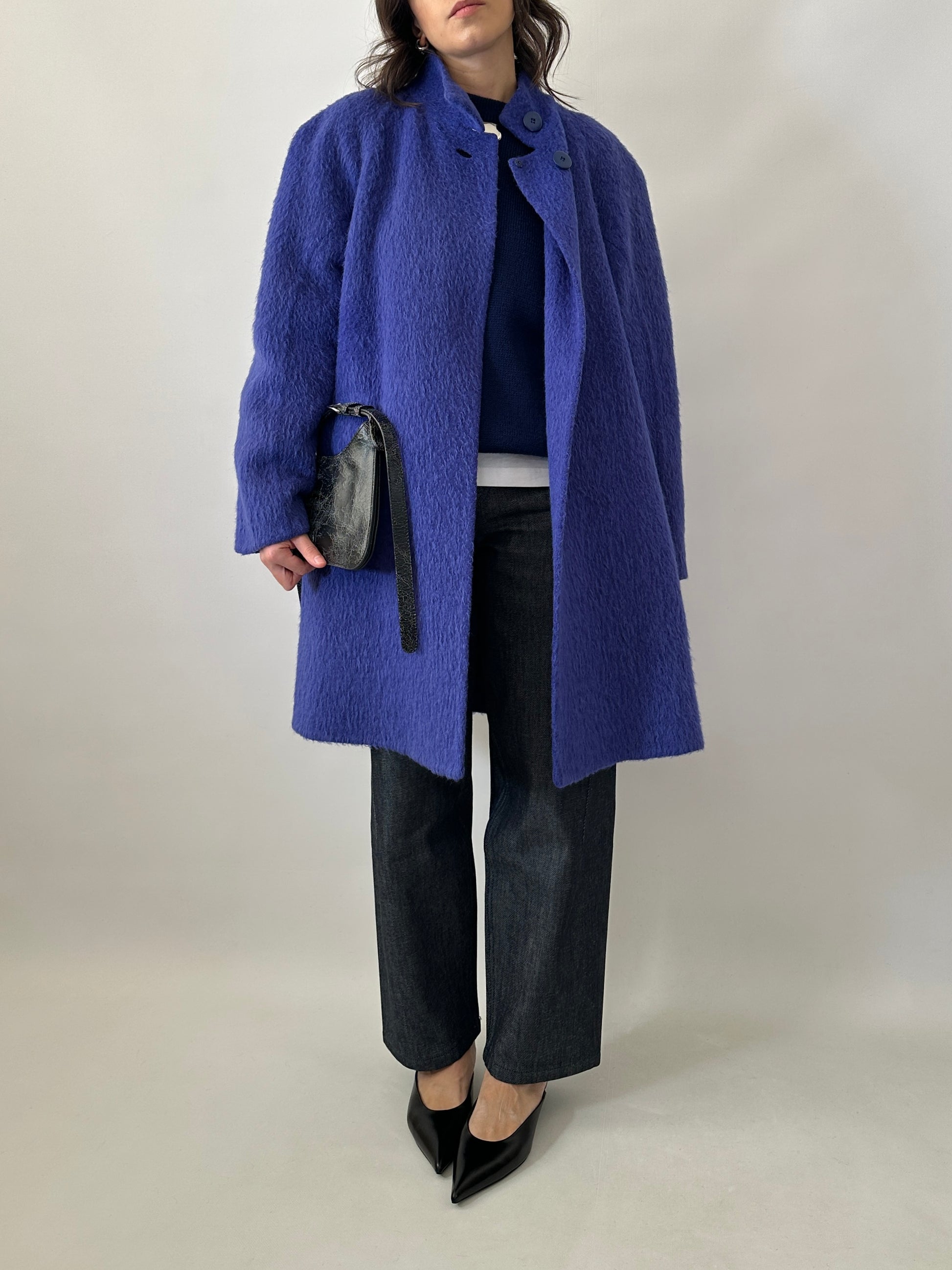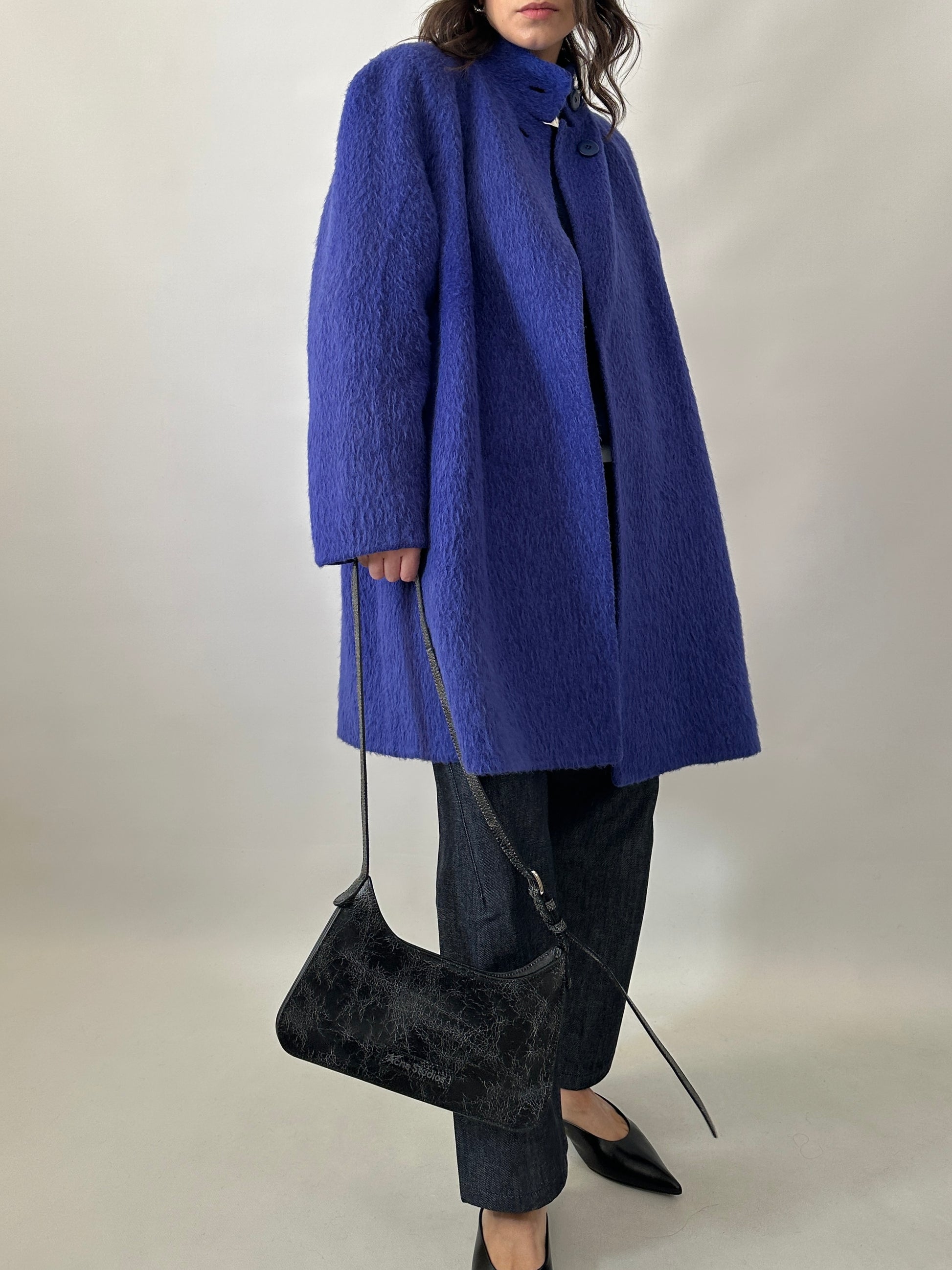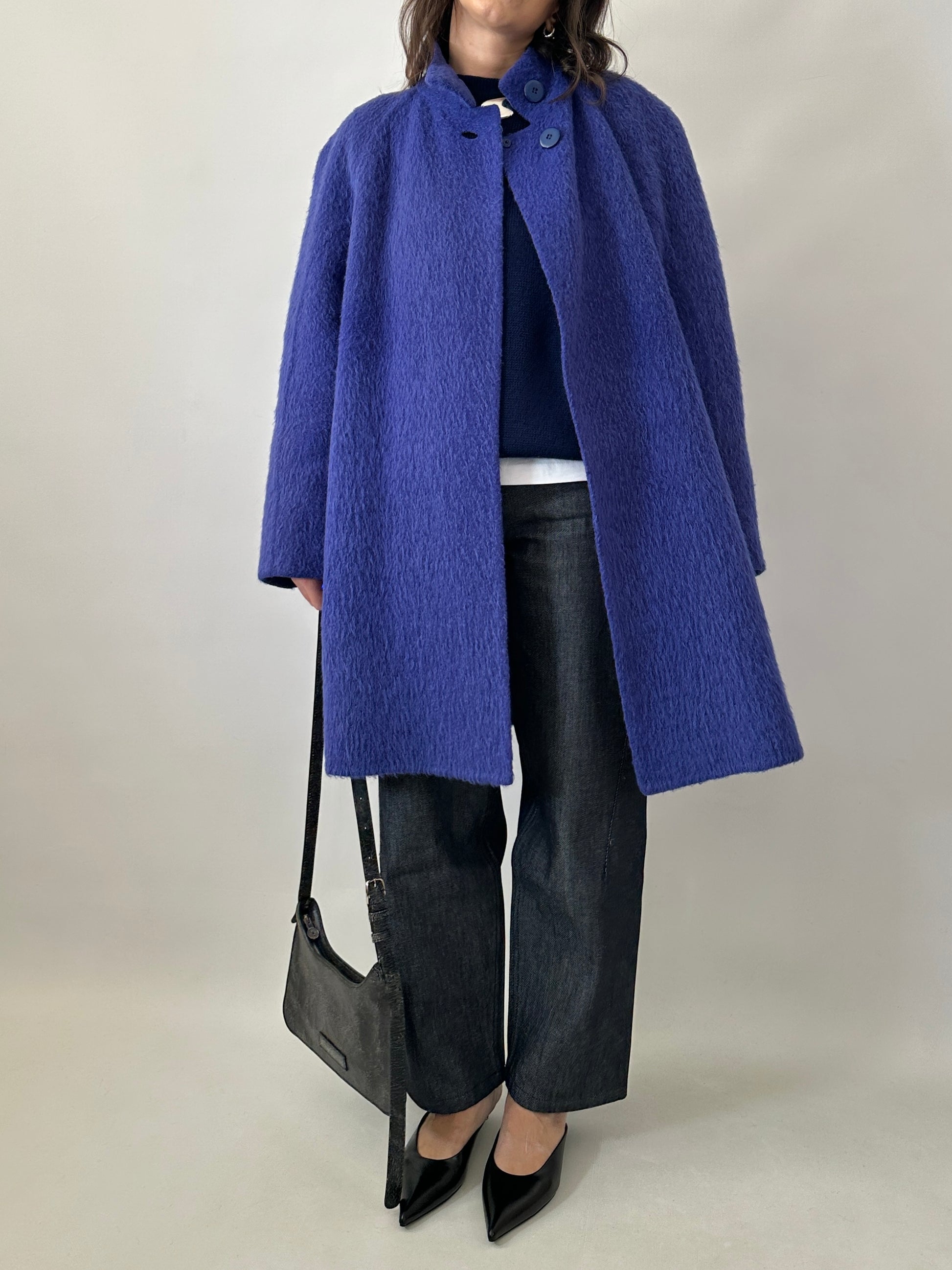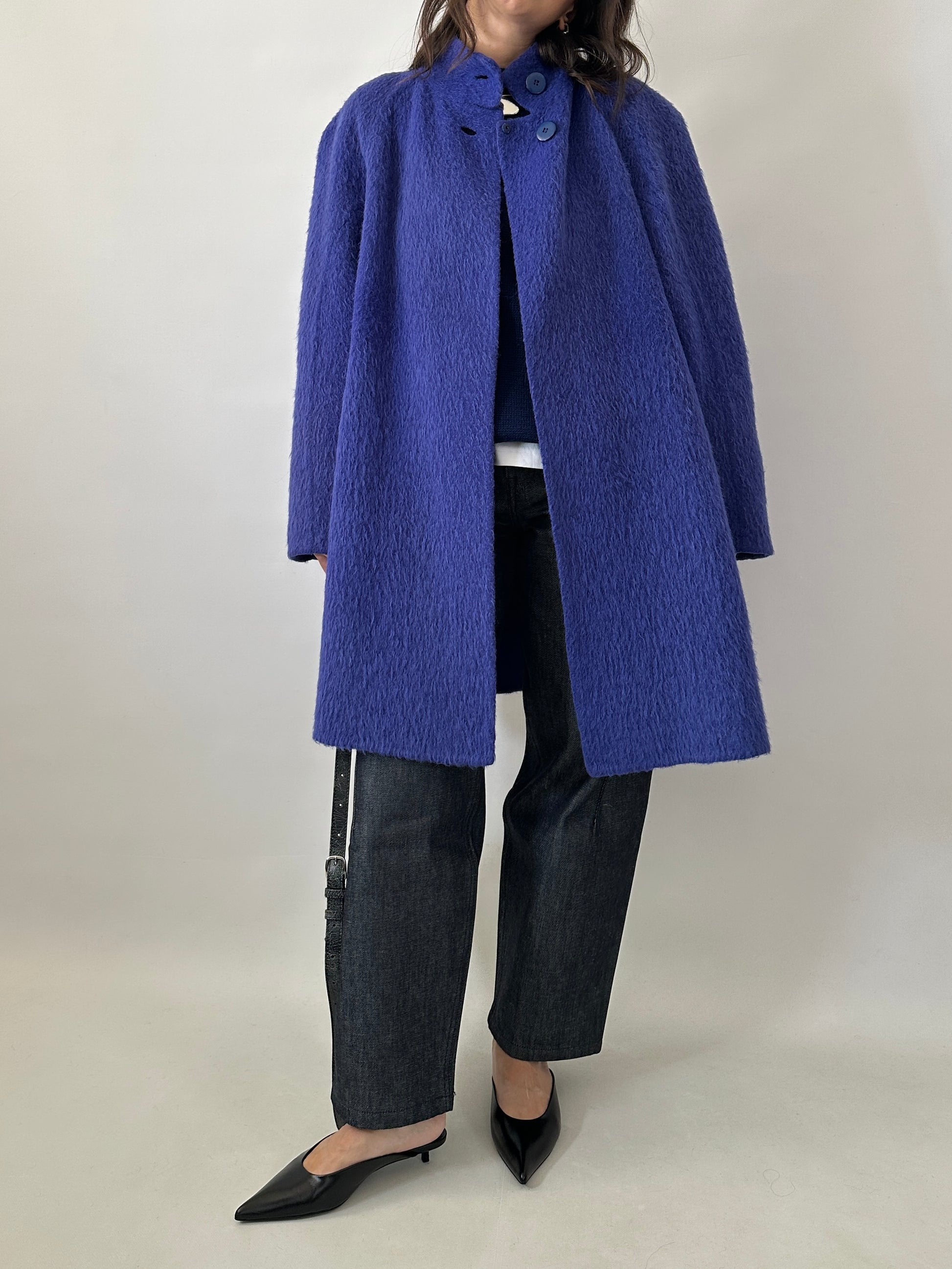 Cappotto vintage Agnona in lana d’alpaca del Perù, caratterizzato da una linea ampia, svasata e fluida tipica degli anni ’80. Il taglio presenta spalle arrotondate e morbide senza imbottitura. La texture del tessuto è corposa e soffice al tatto, con una superficie vaporosa e pelosa, caratteristica tipica dell’alpaca a pelo lungo. Collo alto e chiusura con due bottoni tono su tono che lasciano il davanti leggermente aperto e valorizzano la linea scultorea del capo. Sfoderato. Un pezzo d’archivio iconico per qualità, costruzione e presenza.