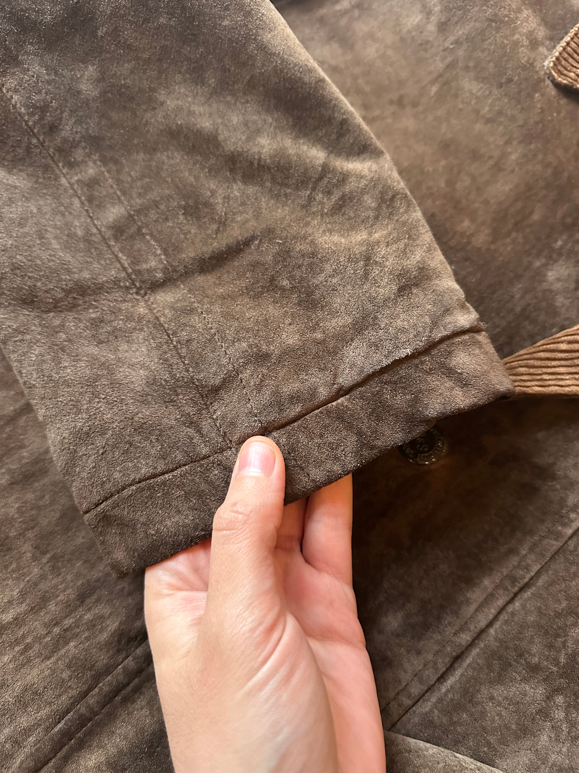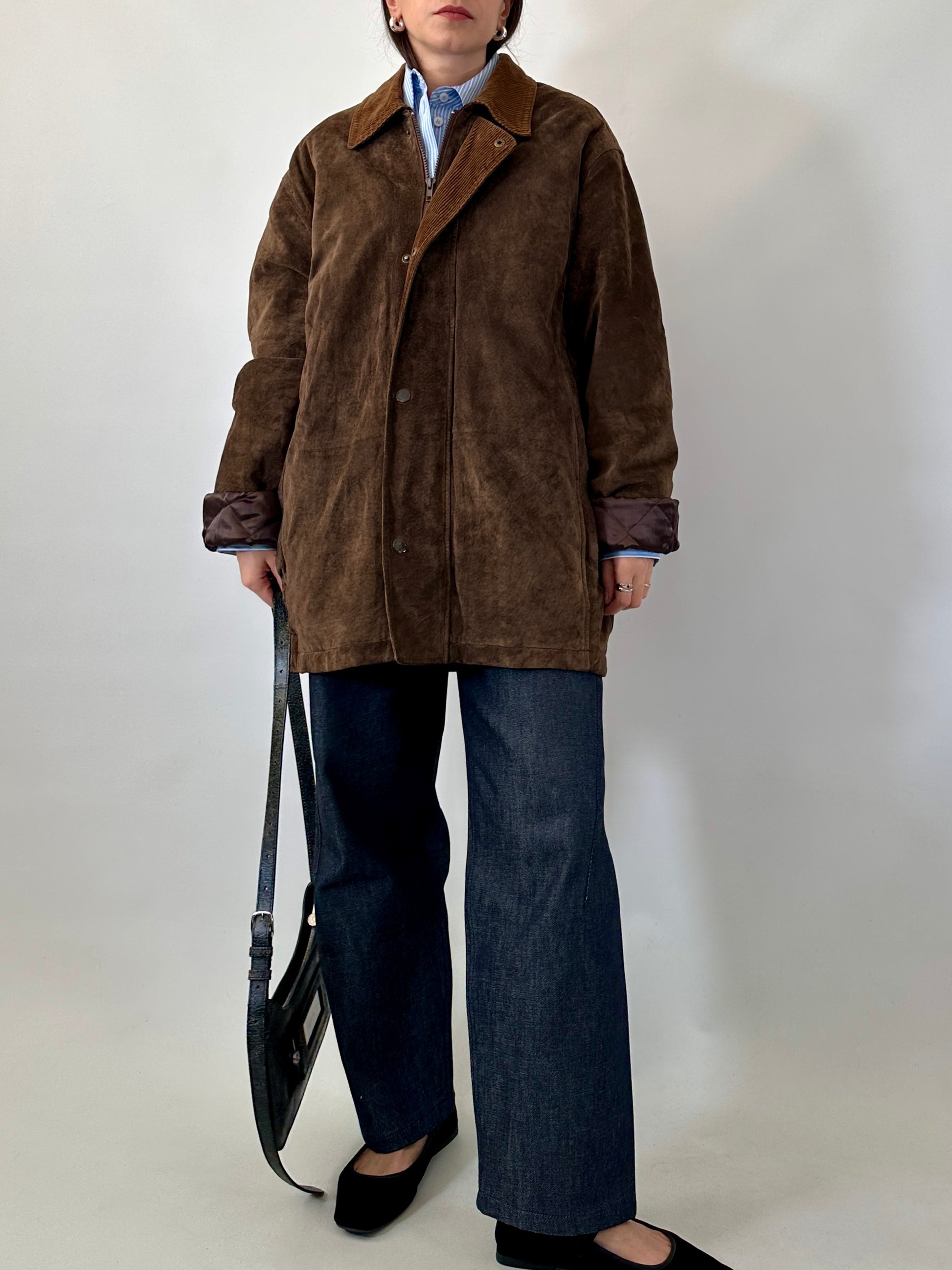 Giacca vintage in vera pelle scamosciata marrone, con chiaro richiamo allo stile English country delle giacche da campagna britanniche. Il colletto in velluto a costine rimanda ai modelli classici di ispirazione Barbour, mentre la struttura morbida e l’interno leggermente trapuntato la rendono un capo avvolgente, pratico e dall’eleganza senza tempo.