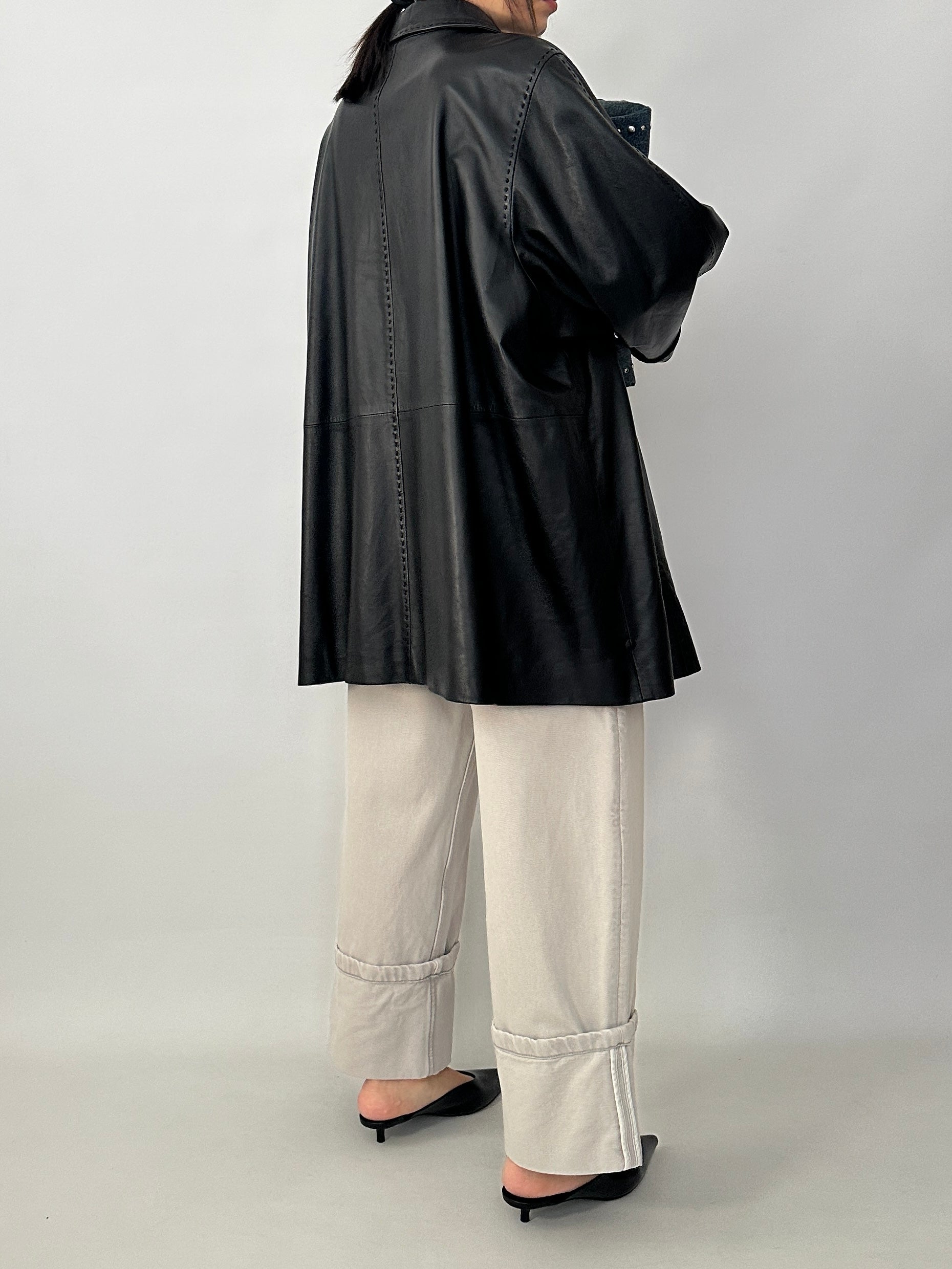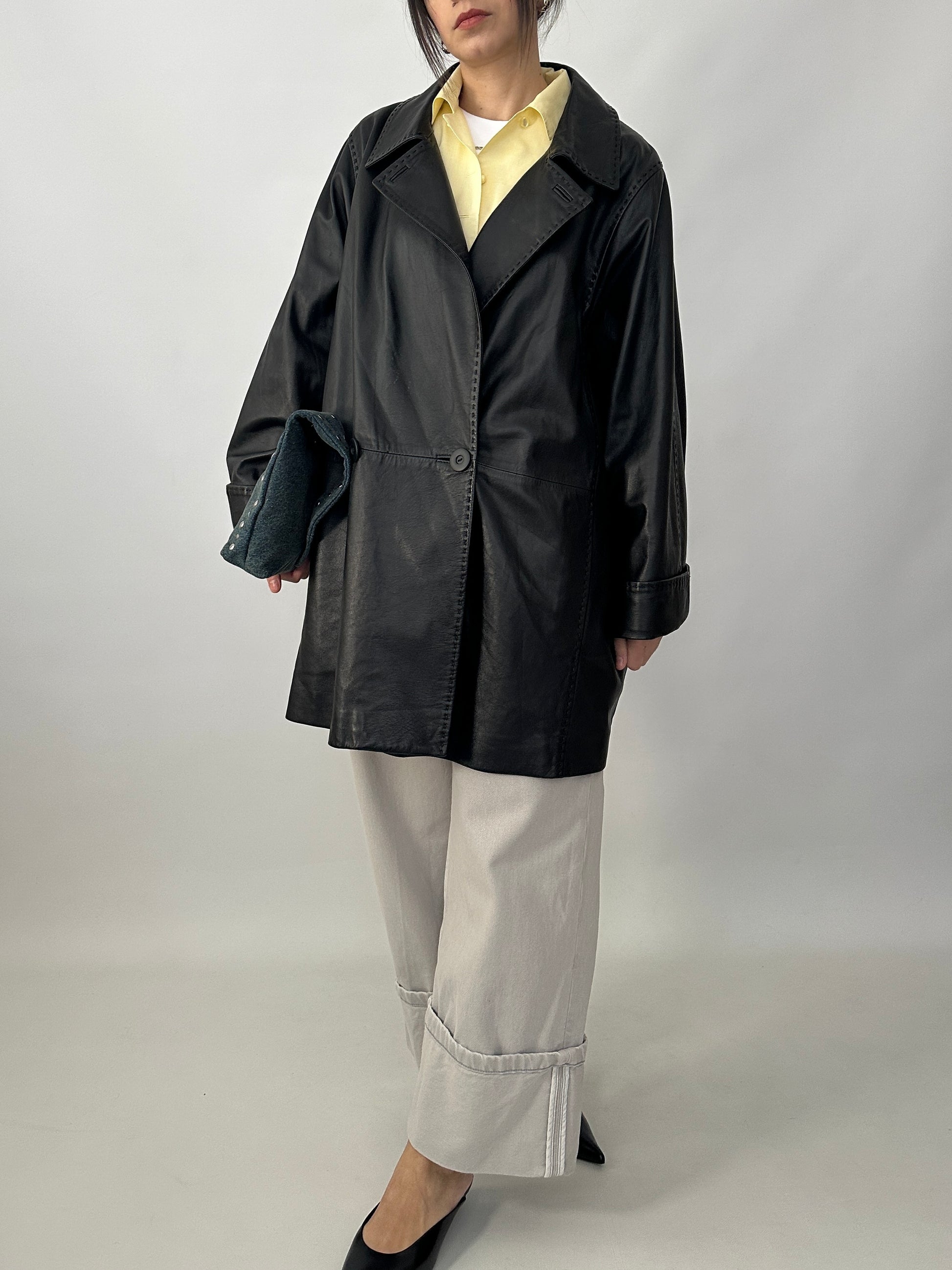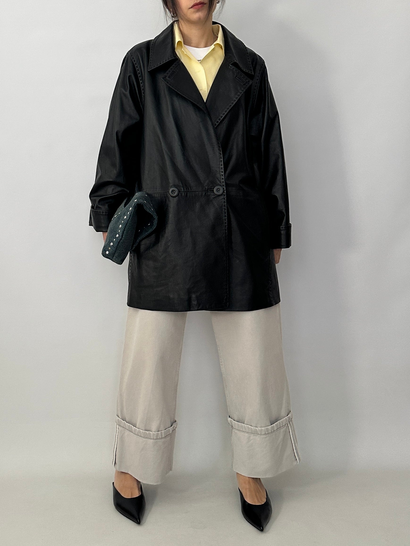 Meravigliosa giacca tipo caban in morbidissima nappa. Doppiopetto, rever classico, risvolto sulla manica. Bellissime le impunture lungo tutti i profili.
