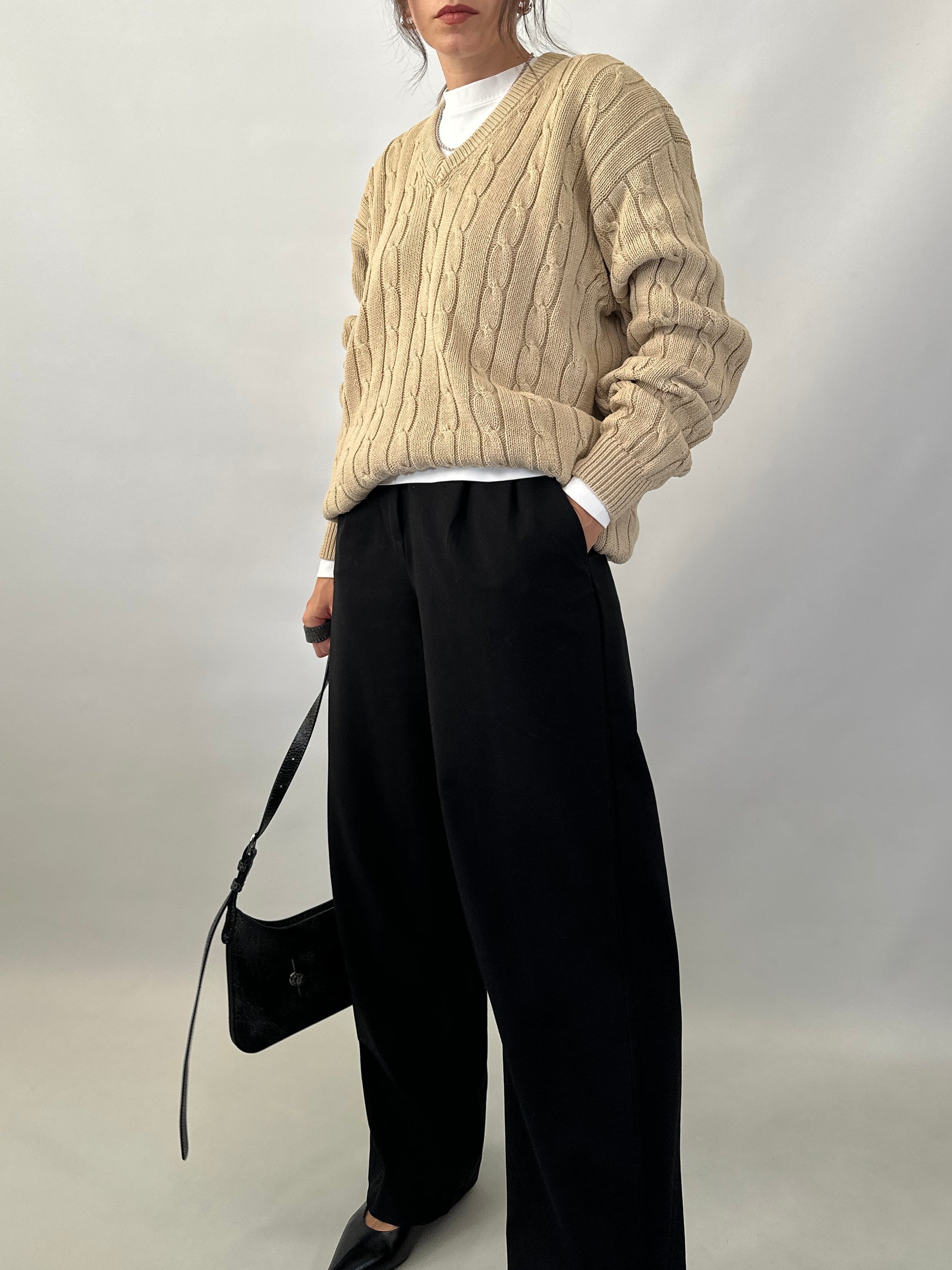 Pullover in cotone. Lavorazione a trecce, scollo a V, fit rilassato, con spalle scese e bordi a costine.