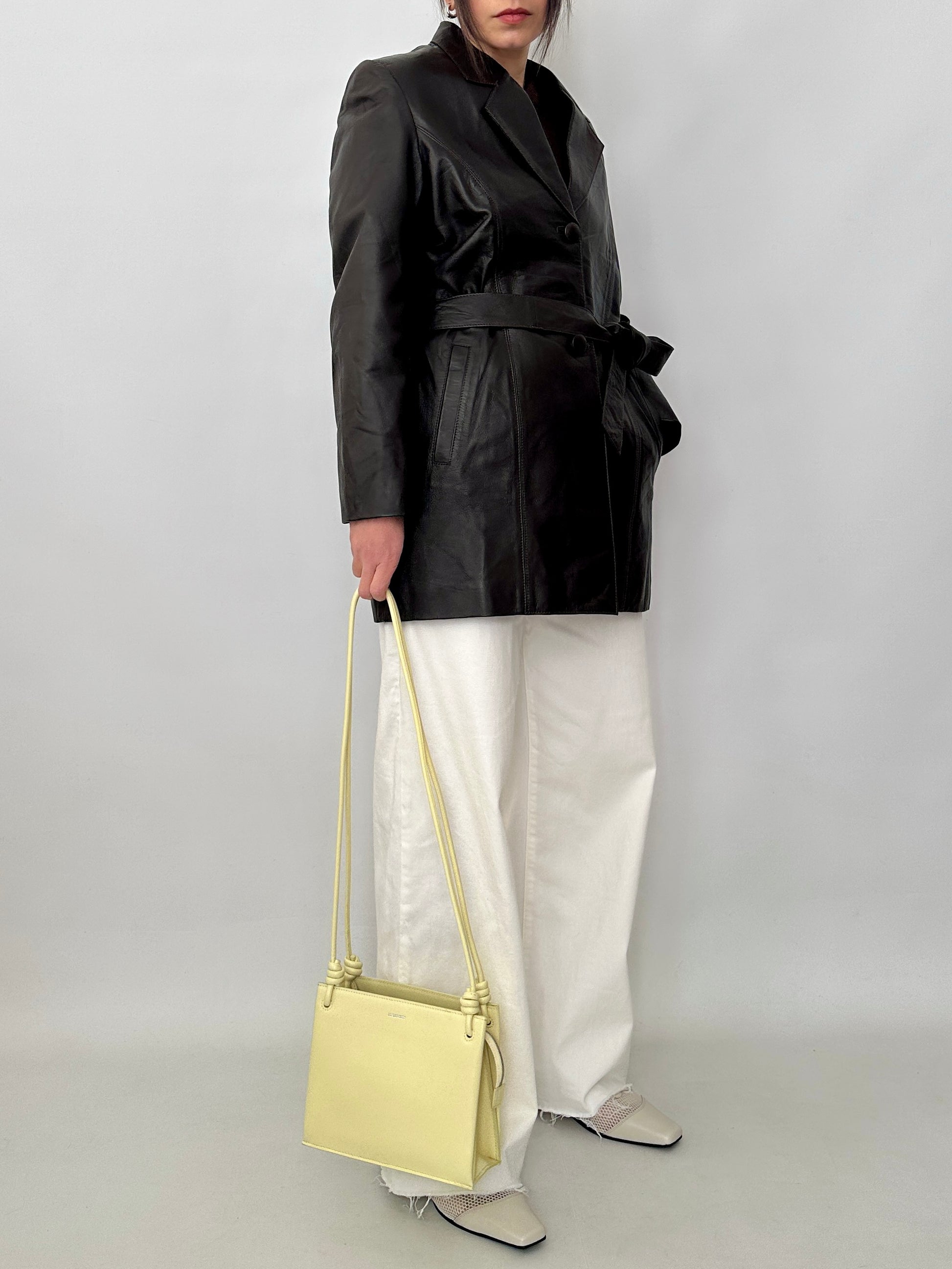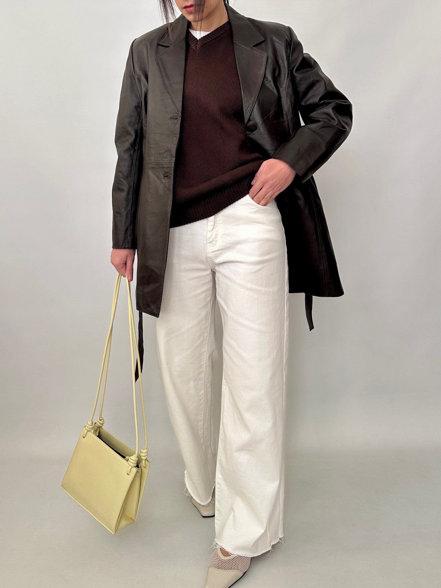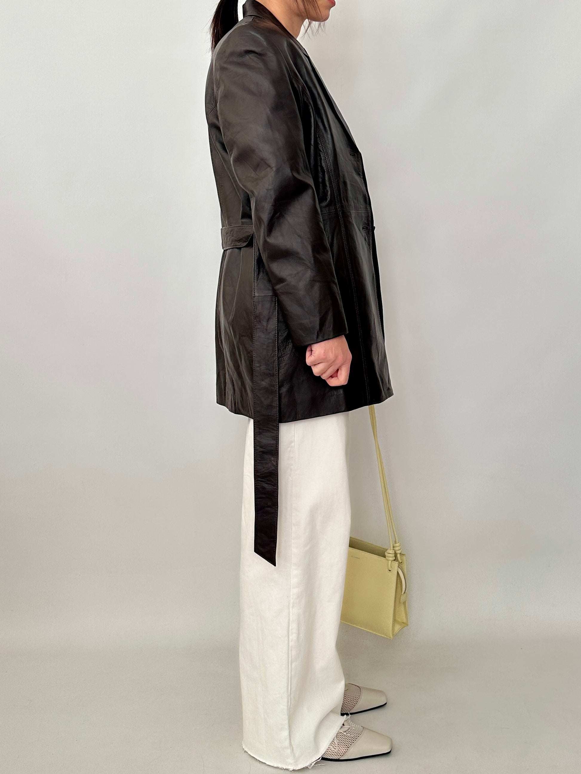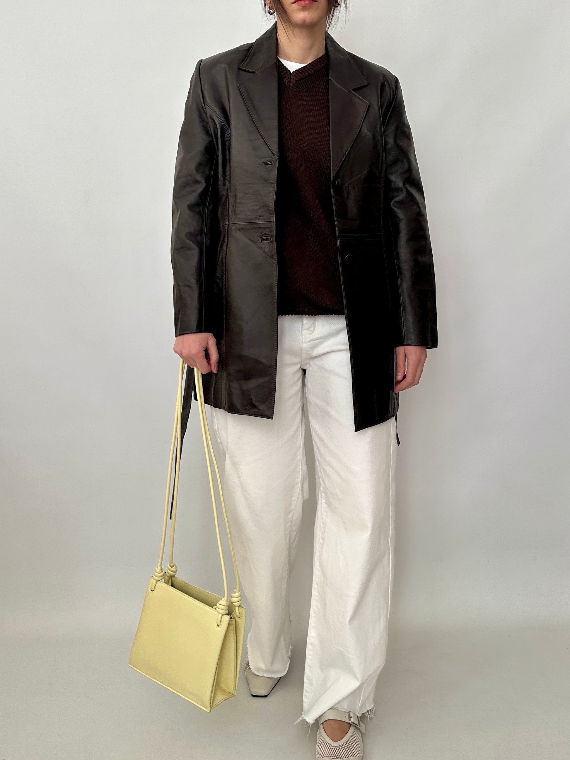 Giacca in vera pelle color marrone cioccolato. Revers classico, monopetto, cintura in vita. Taglio dritto. Non c’è etichetta della taglia. Ok da XS a M a seconda della vestibilità desiderata. Confrontate le misure di seguito.
