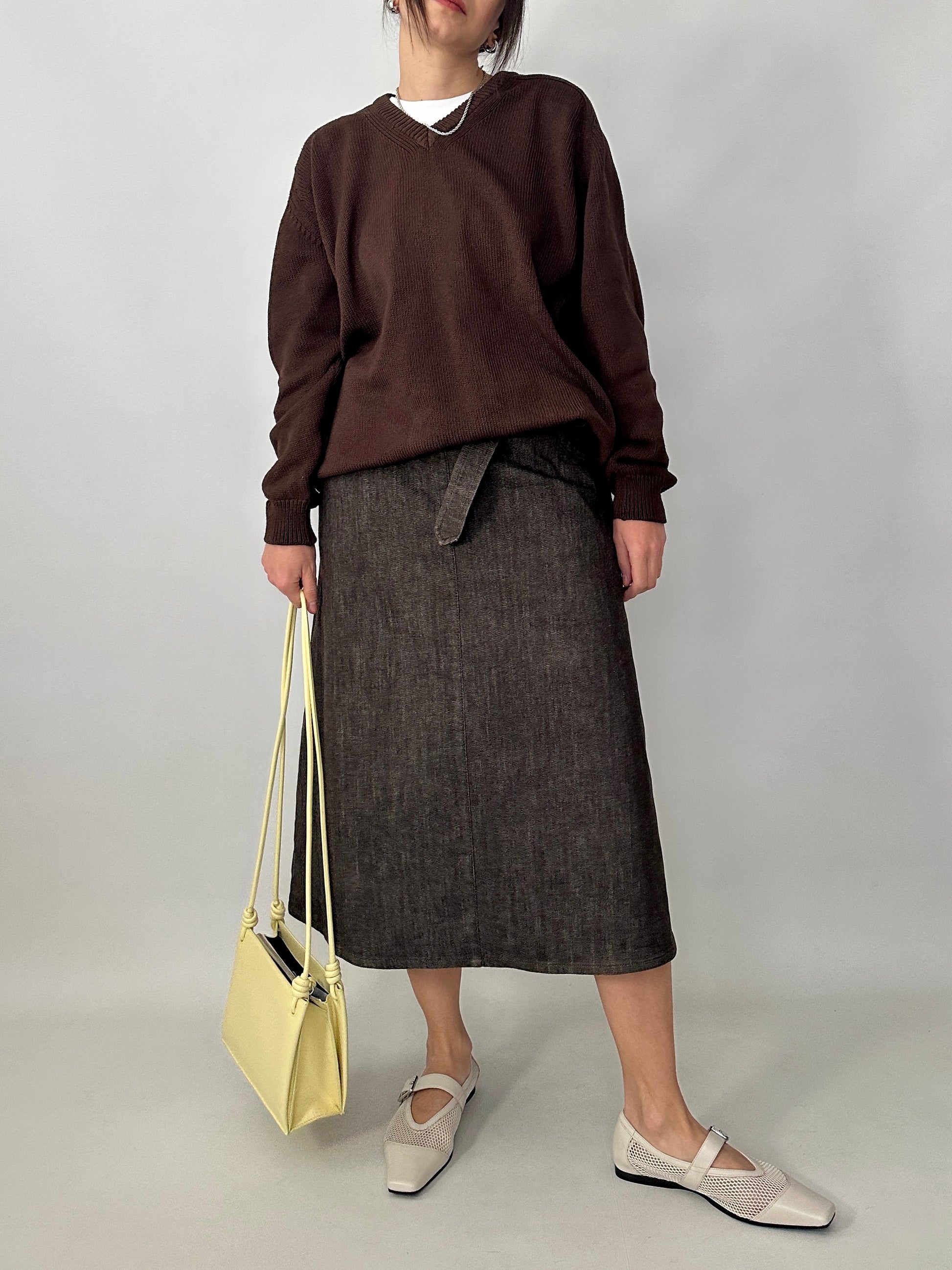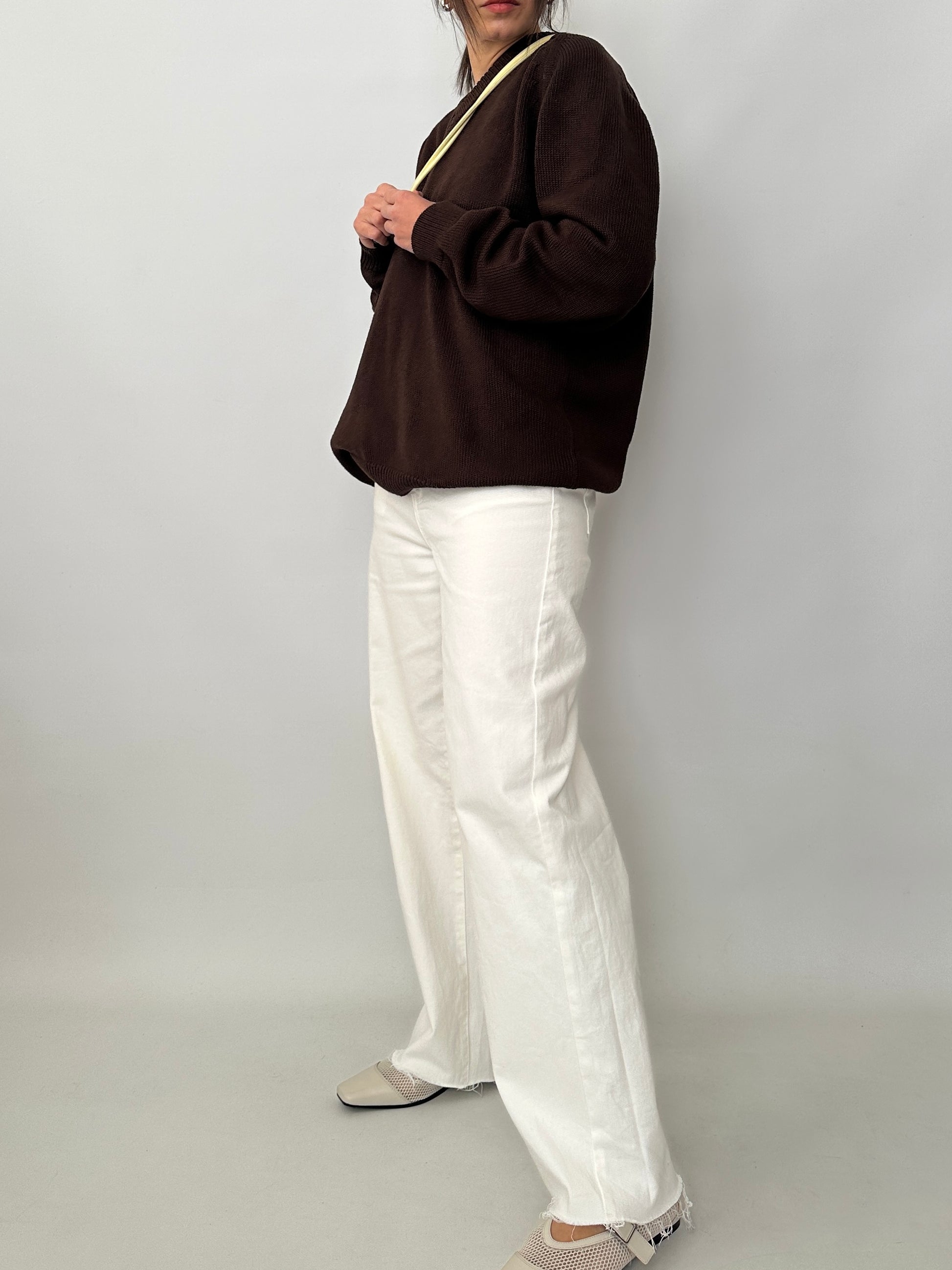 Maglione color marrone cioccolato. Scollo a V. Non ci sono etichette. Probabilmente da uomo e in cotone. Bellissimo portato oversize. Lo vedete su una taglia S per 162 cm. Ok da S a L a seconda della vestibilità desiderata.