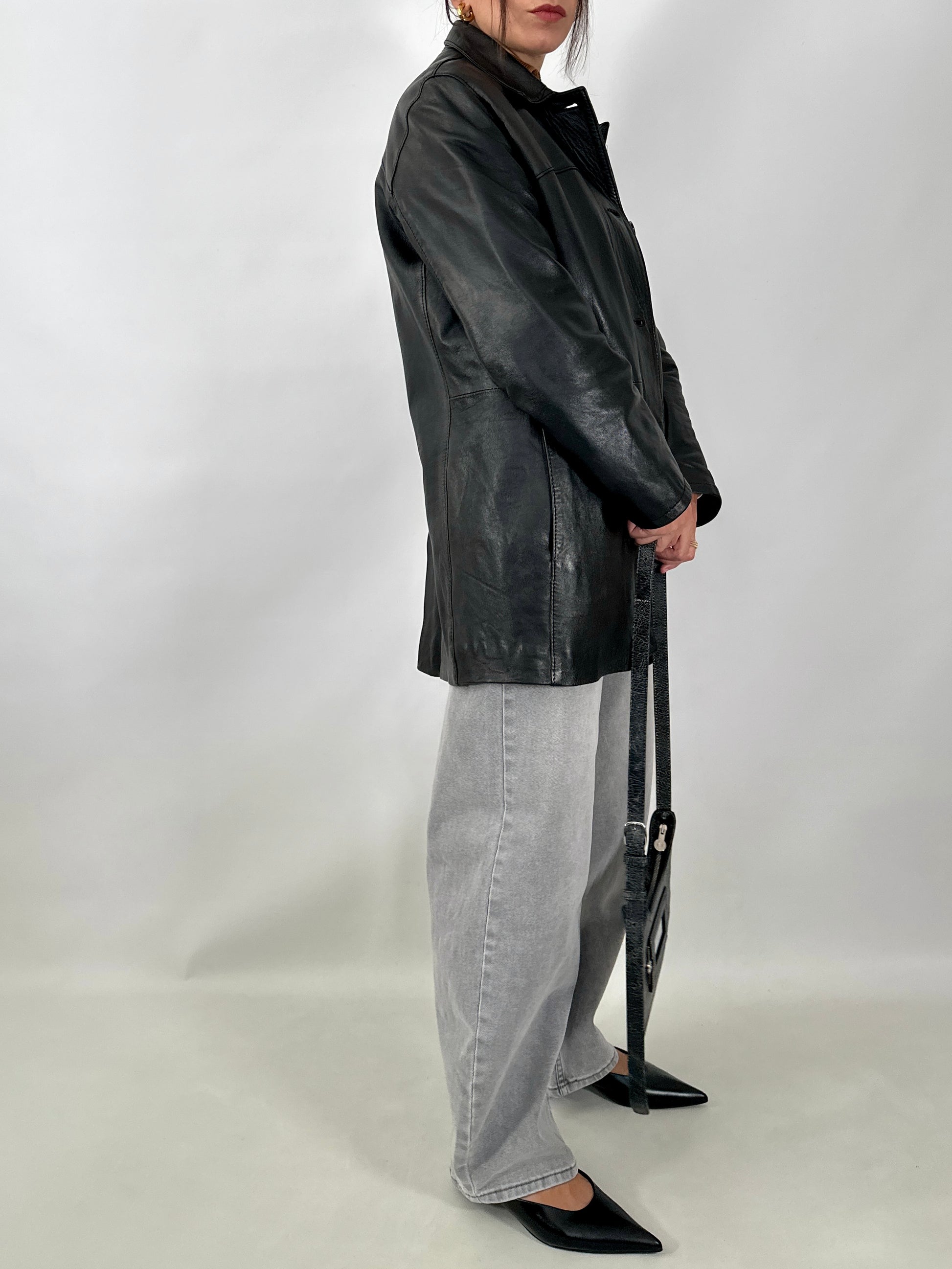 Taglio classico, colletto a punta, chiusura con bottoni, tasche nascoste, spacco posteriore.