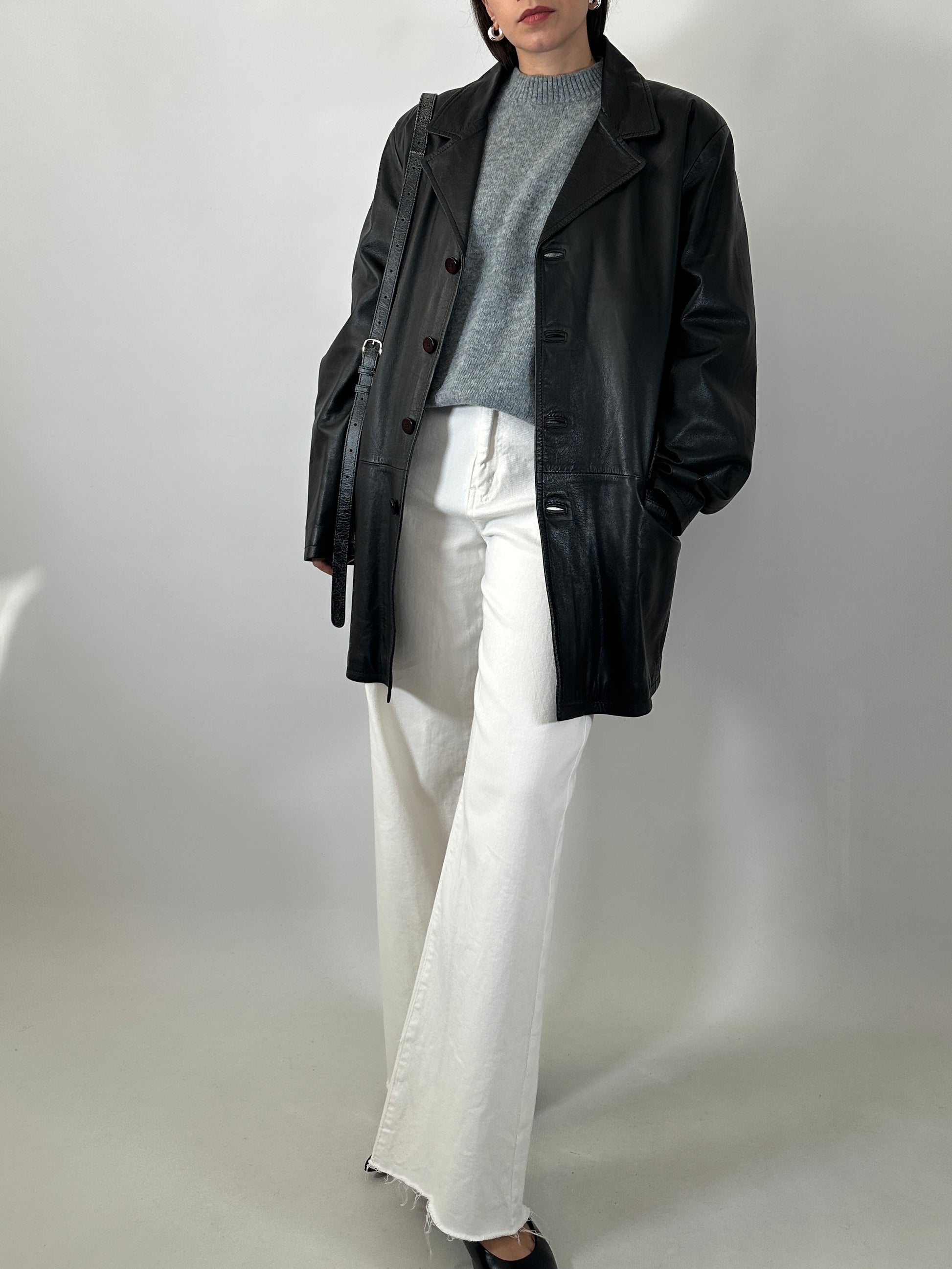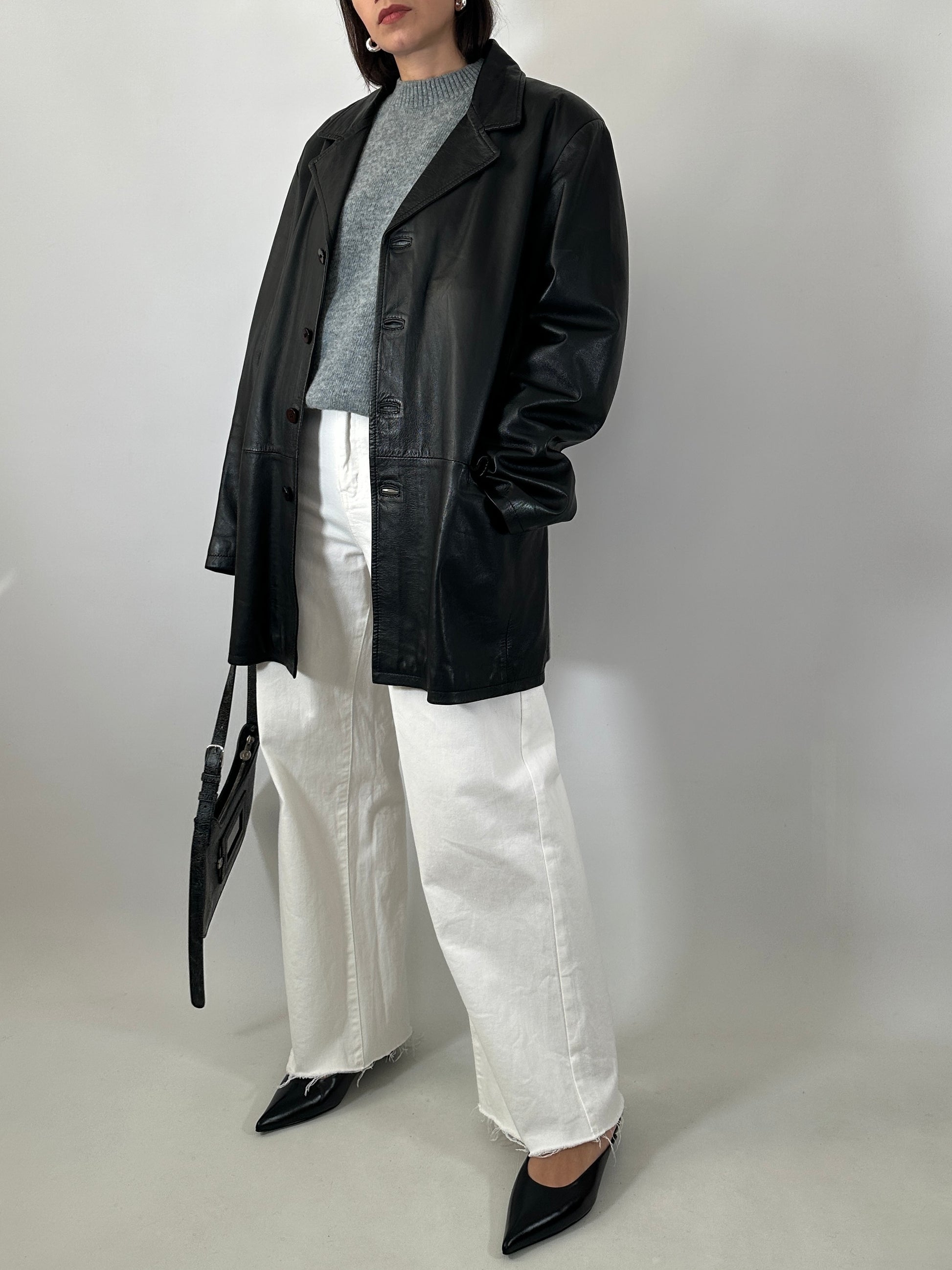 Giacca vintage in morbidissima vera pelle. Taglio classico, rever, monopetto con quattro bottoni, due tasche con patta. Vestibilità dritta, regolare. Lunghezza ai fianchi. Made in Italy.