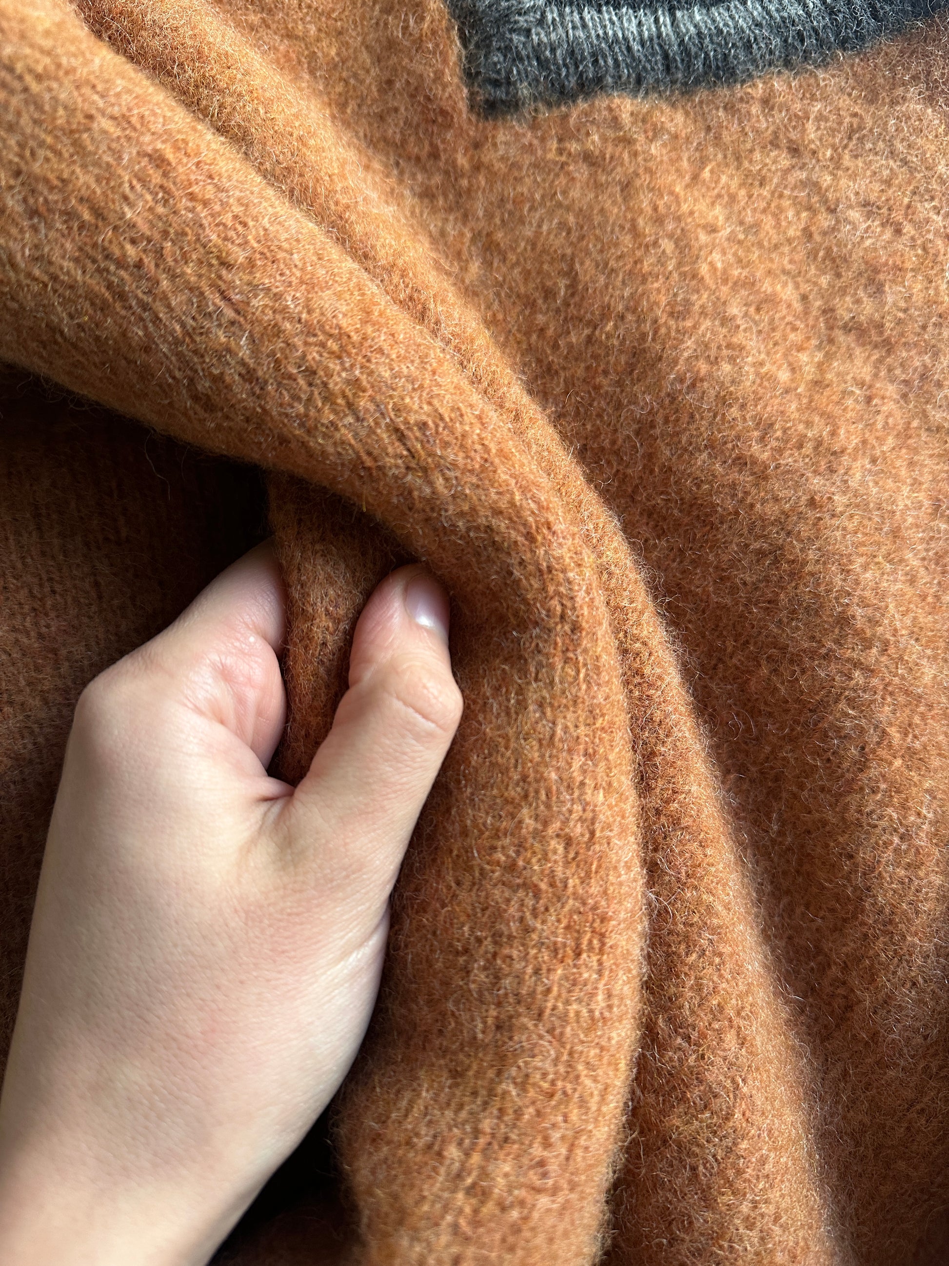 La texture piena e il colore caldo creano un look cozy e outdoor, tipico della maglieria tecnica di quel periodo.