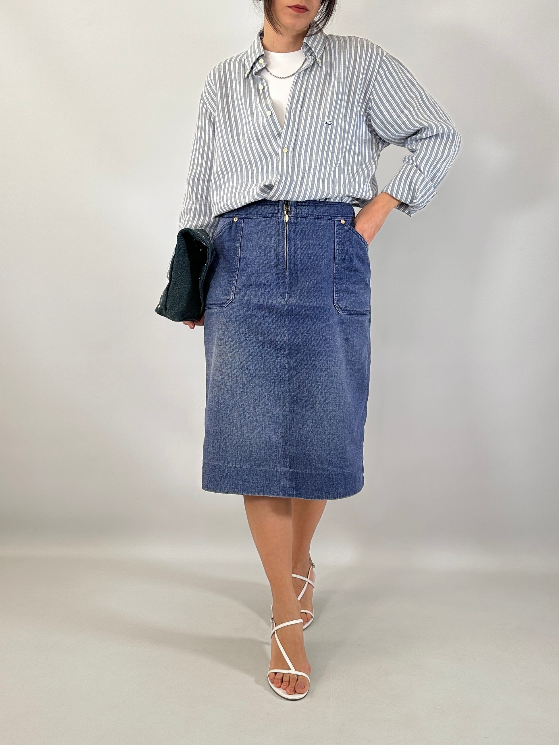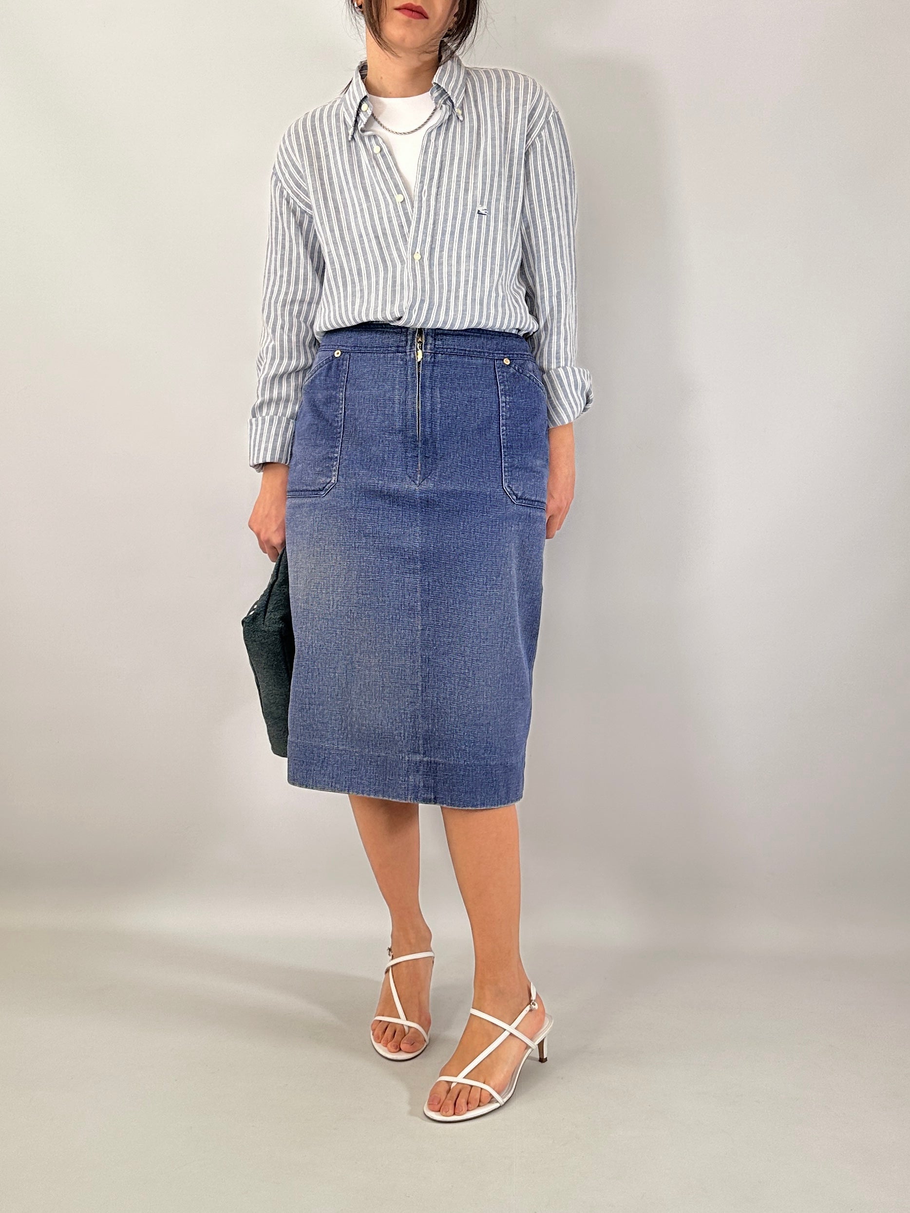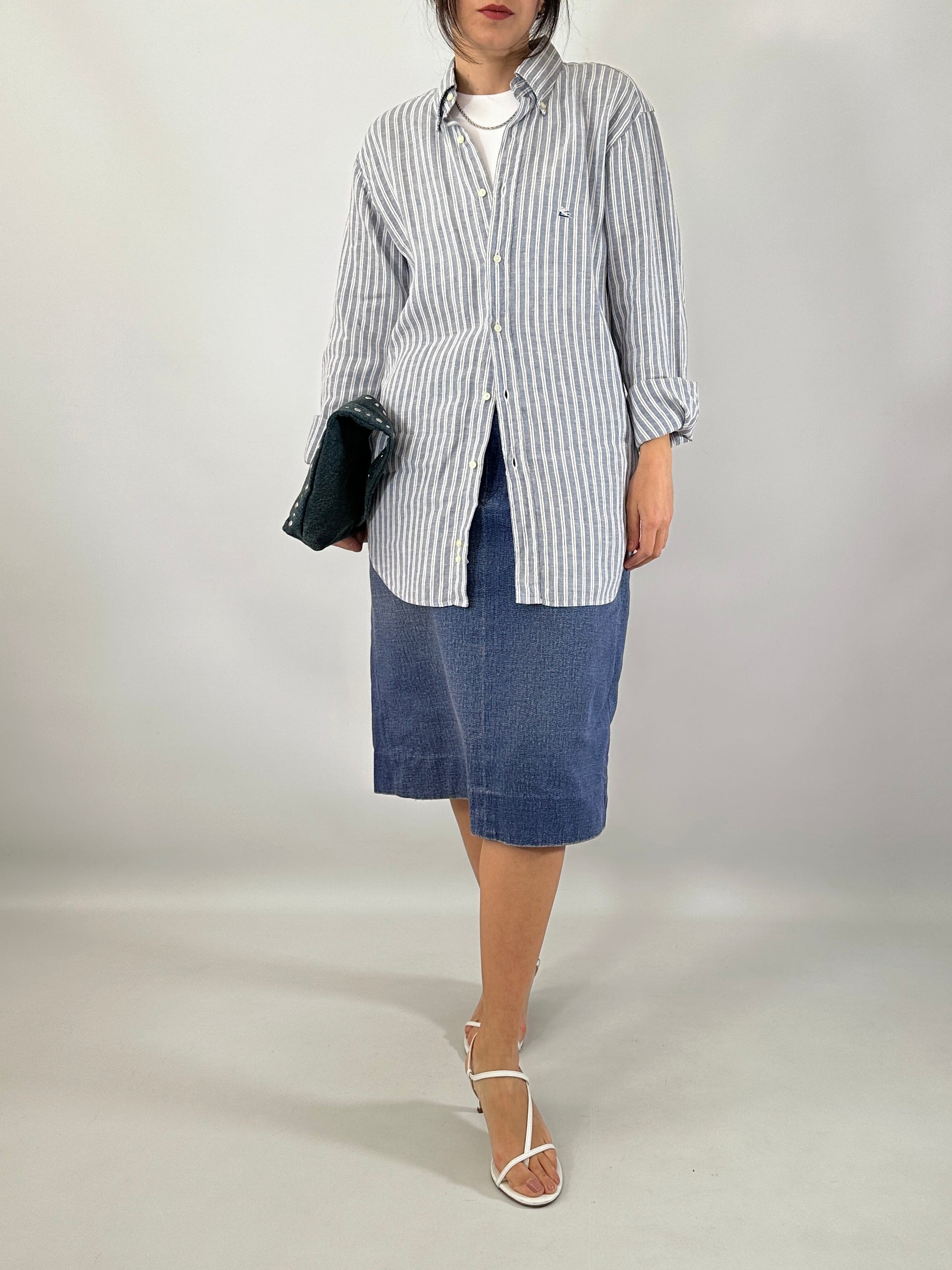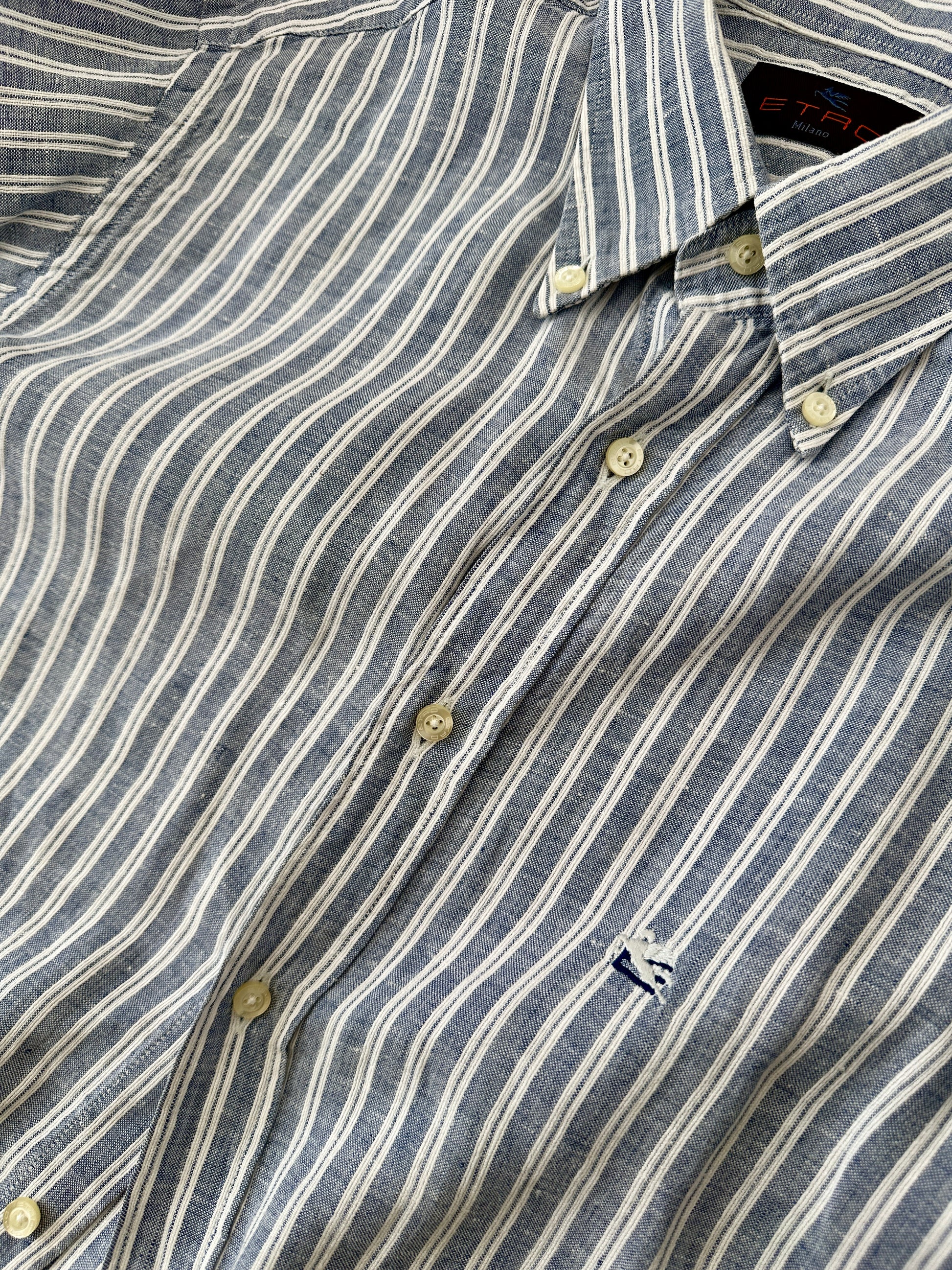 Camicia button-down firmata Etro, a righe bianche e blu, logo sul petto, bottoni logati.