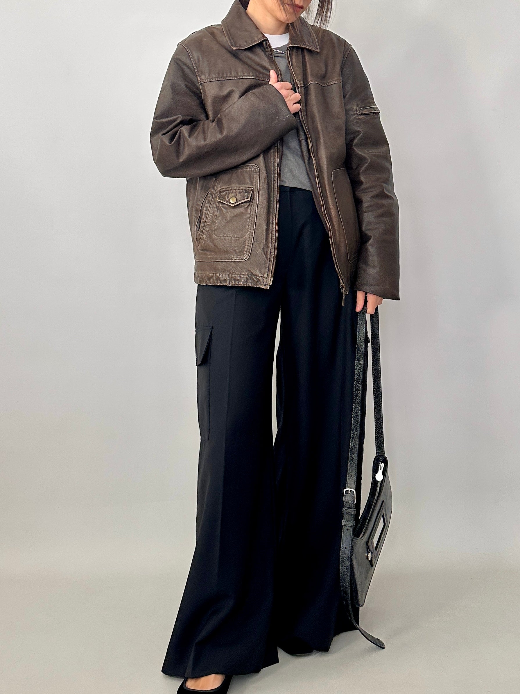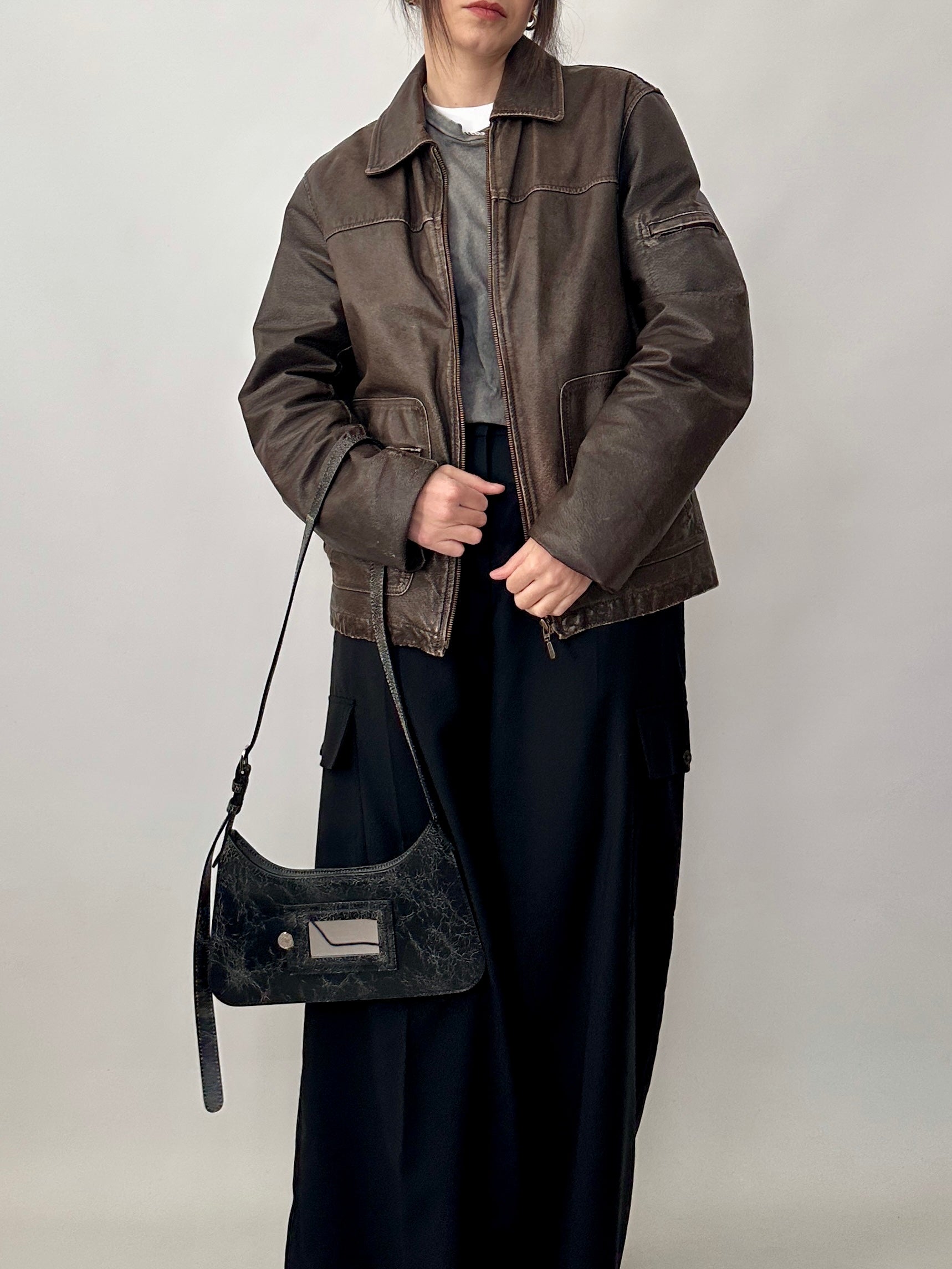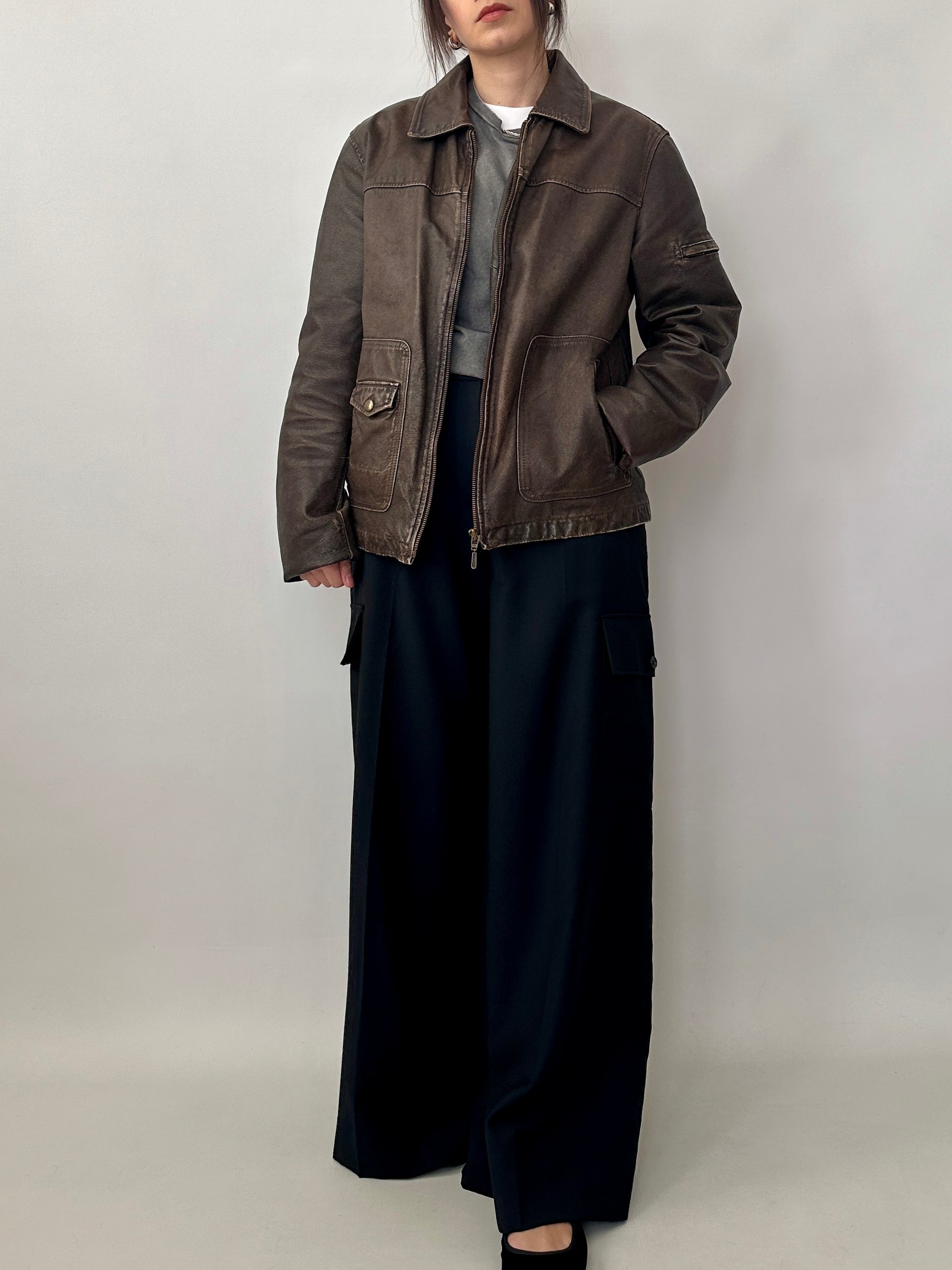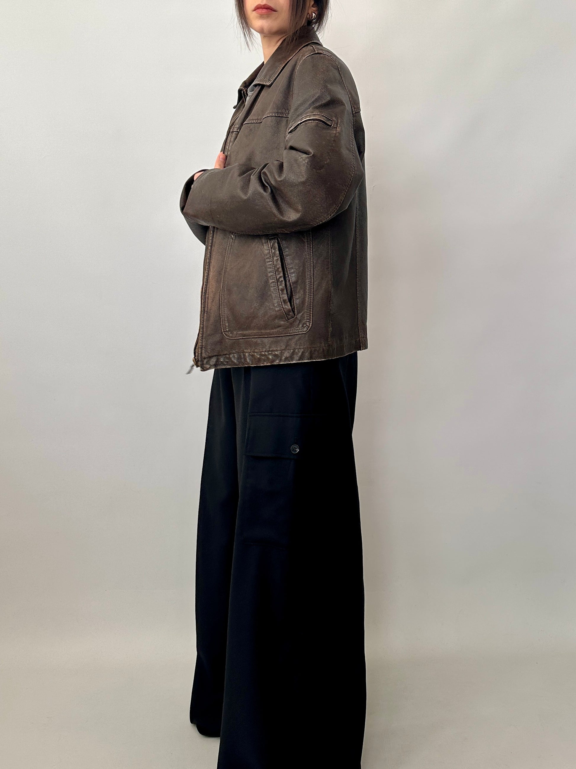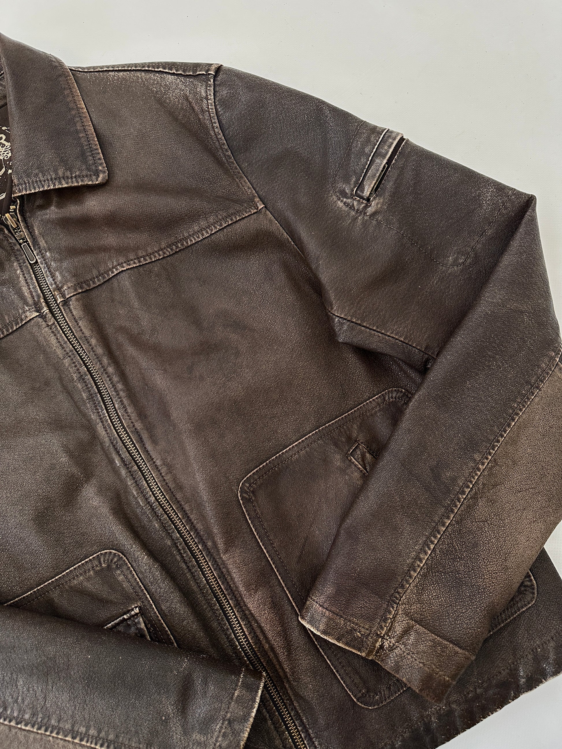 Giubbotto in vera pelle effetto distressed nei toni del marrone. Collo camicia, zip centrale, tasche, una tasca con zip sul braccio. Vestibilità dritta.