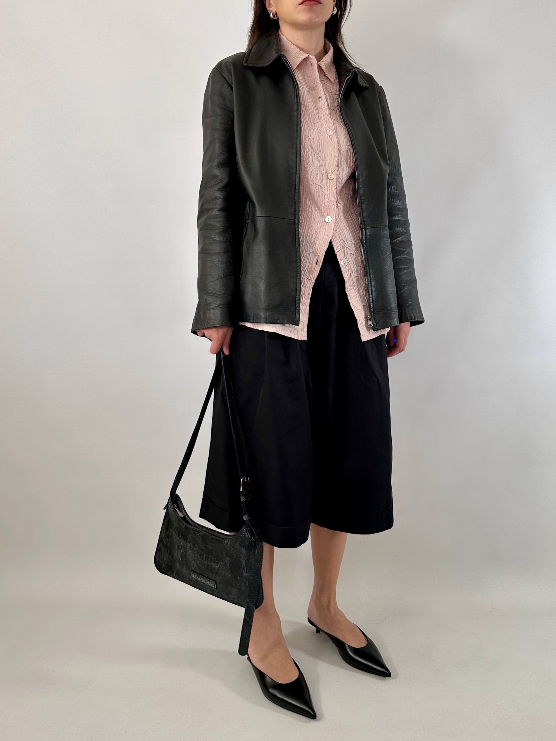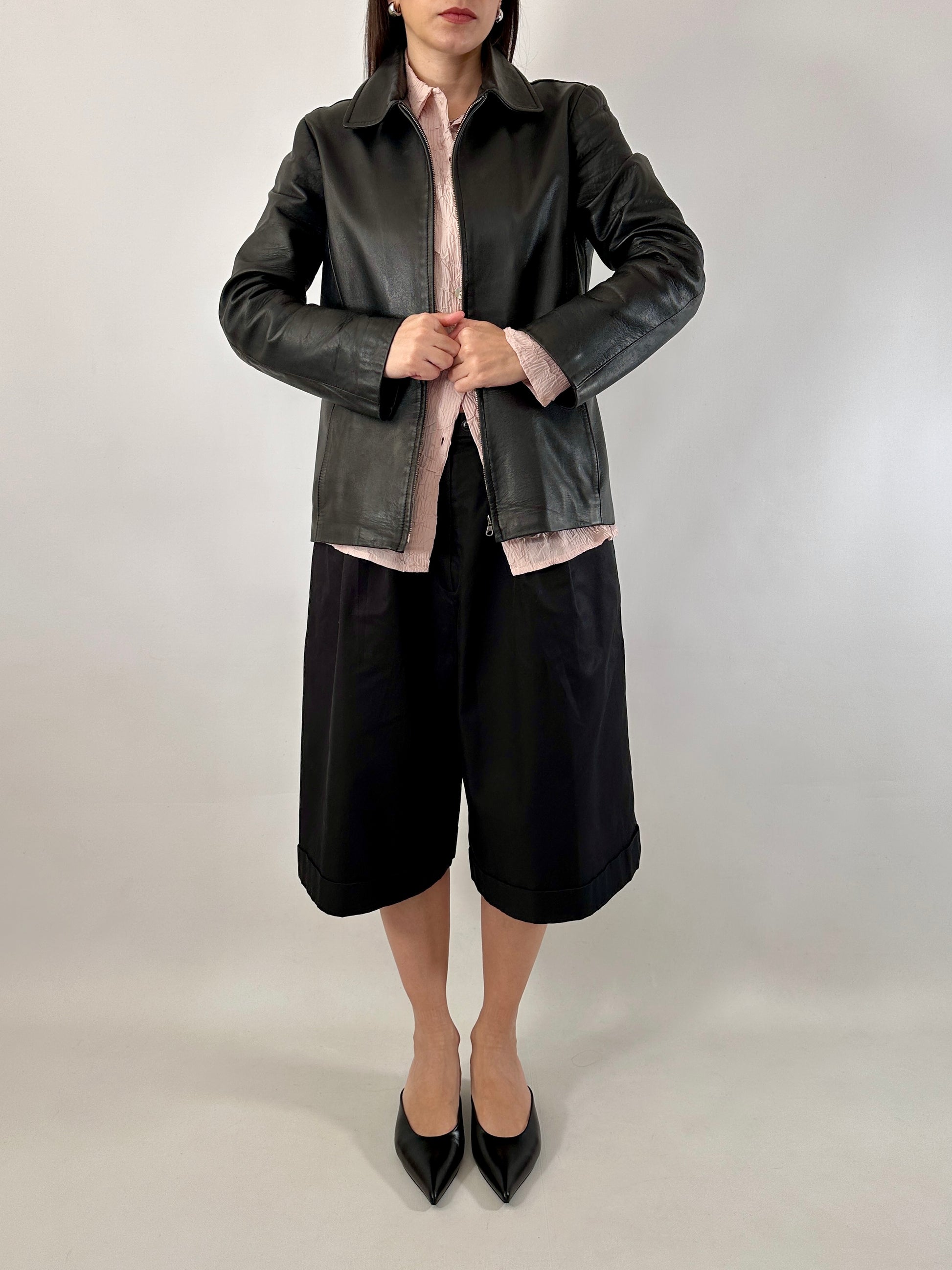 Giacca vintage in vera pelle. Collo a camicia, zip centrale, tasche nascoste. Colore nero.