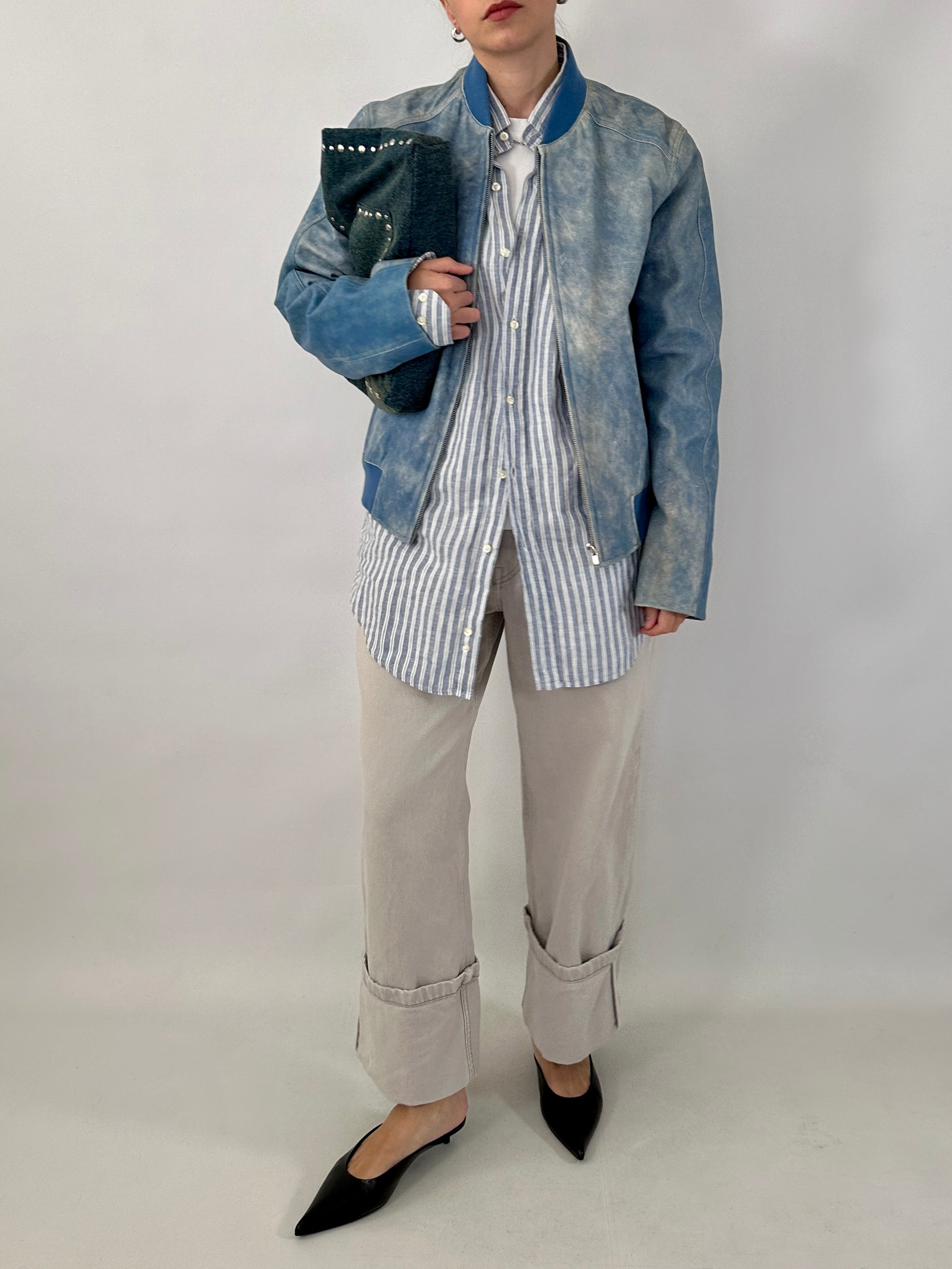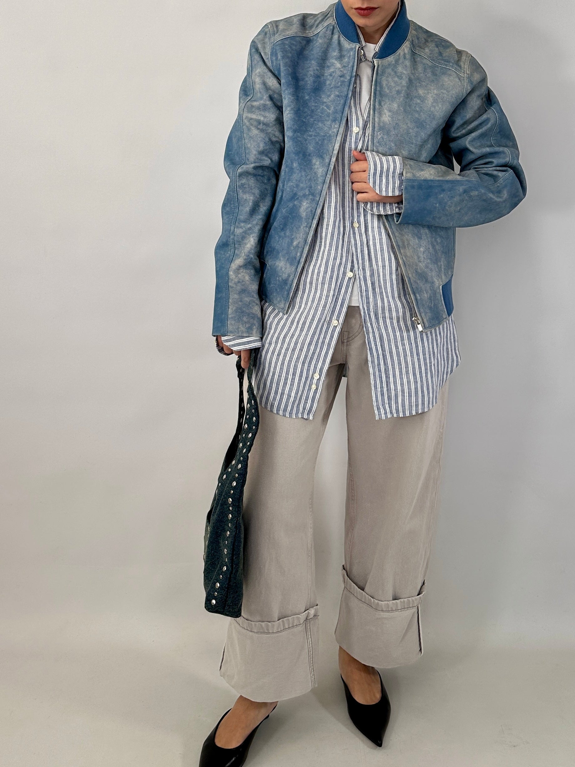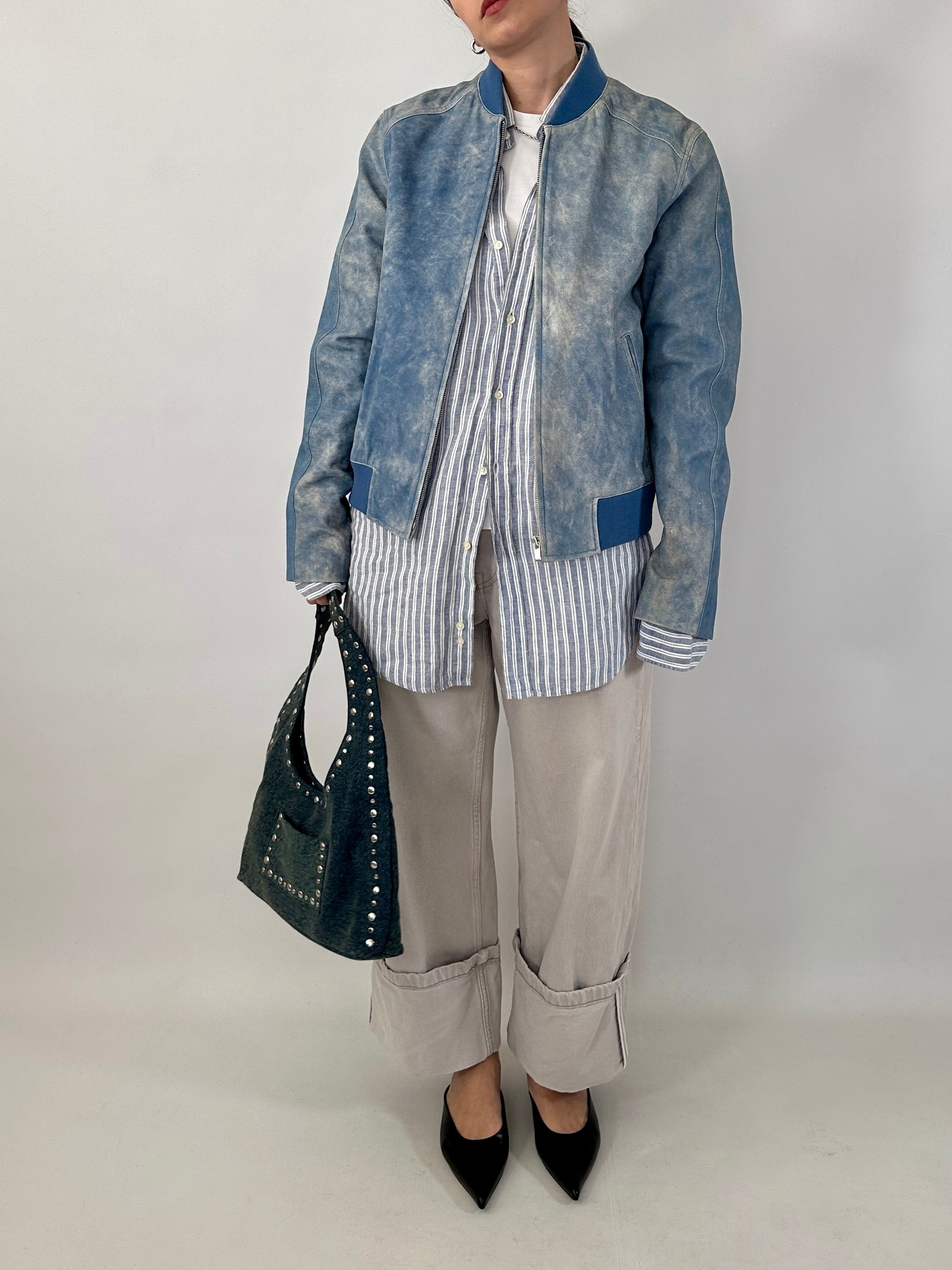 Bomber Hugo Boss in pregiata vera pelle d’agnello, effetto distressed nei toni dell’azzurro. Elastico su colletto e sul fondo. Rifinito con tasche interne in raso rosso.