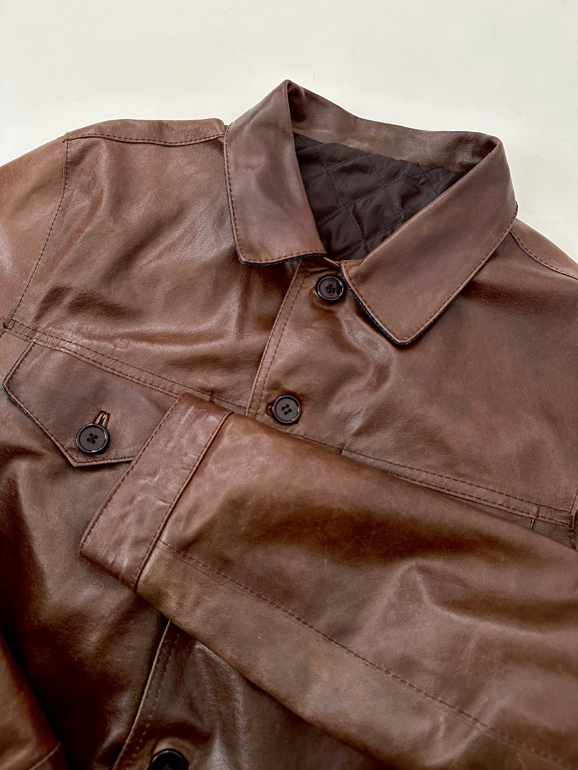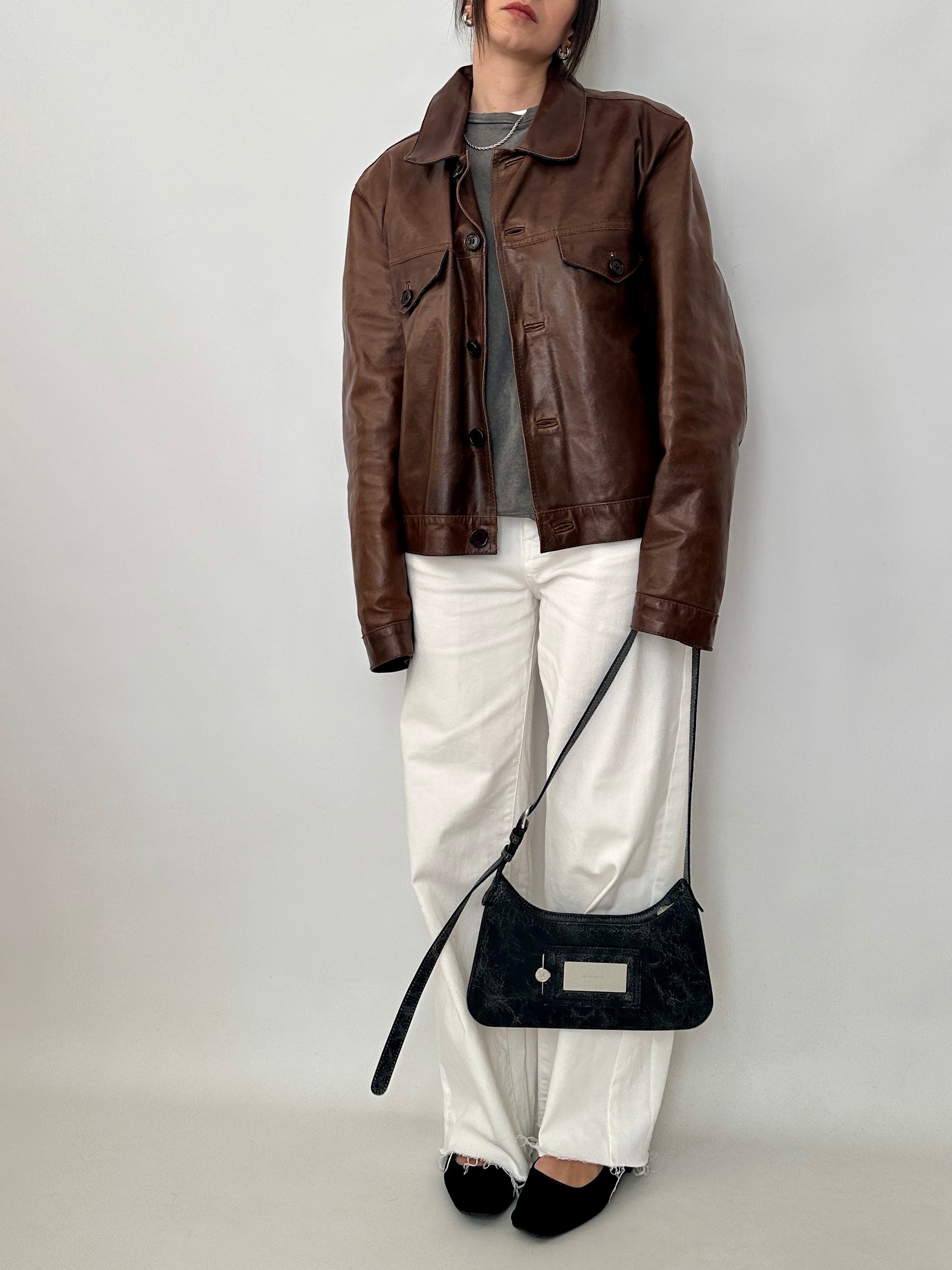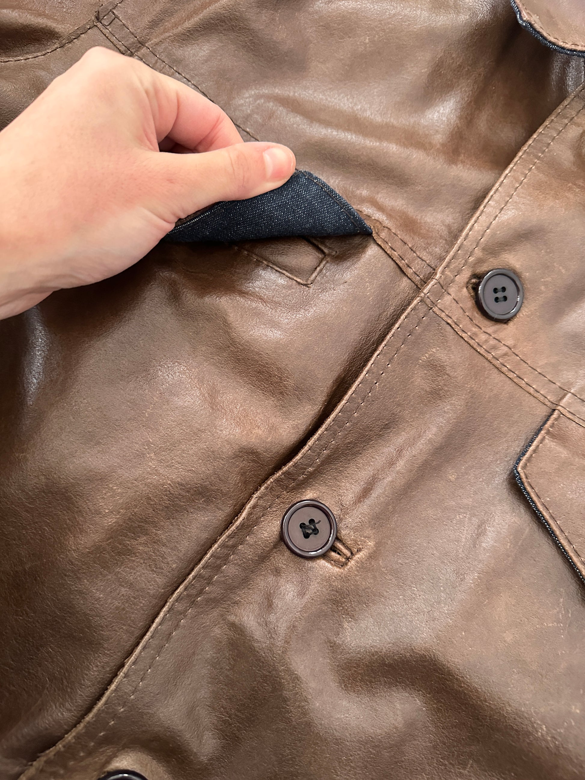 Giubbotto artigianale in vera pelle con dettagli in denim sotto al colletto e sotto la patta delle tasche.