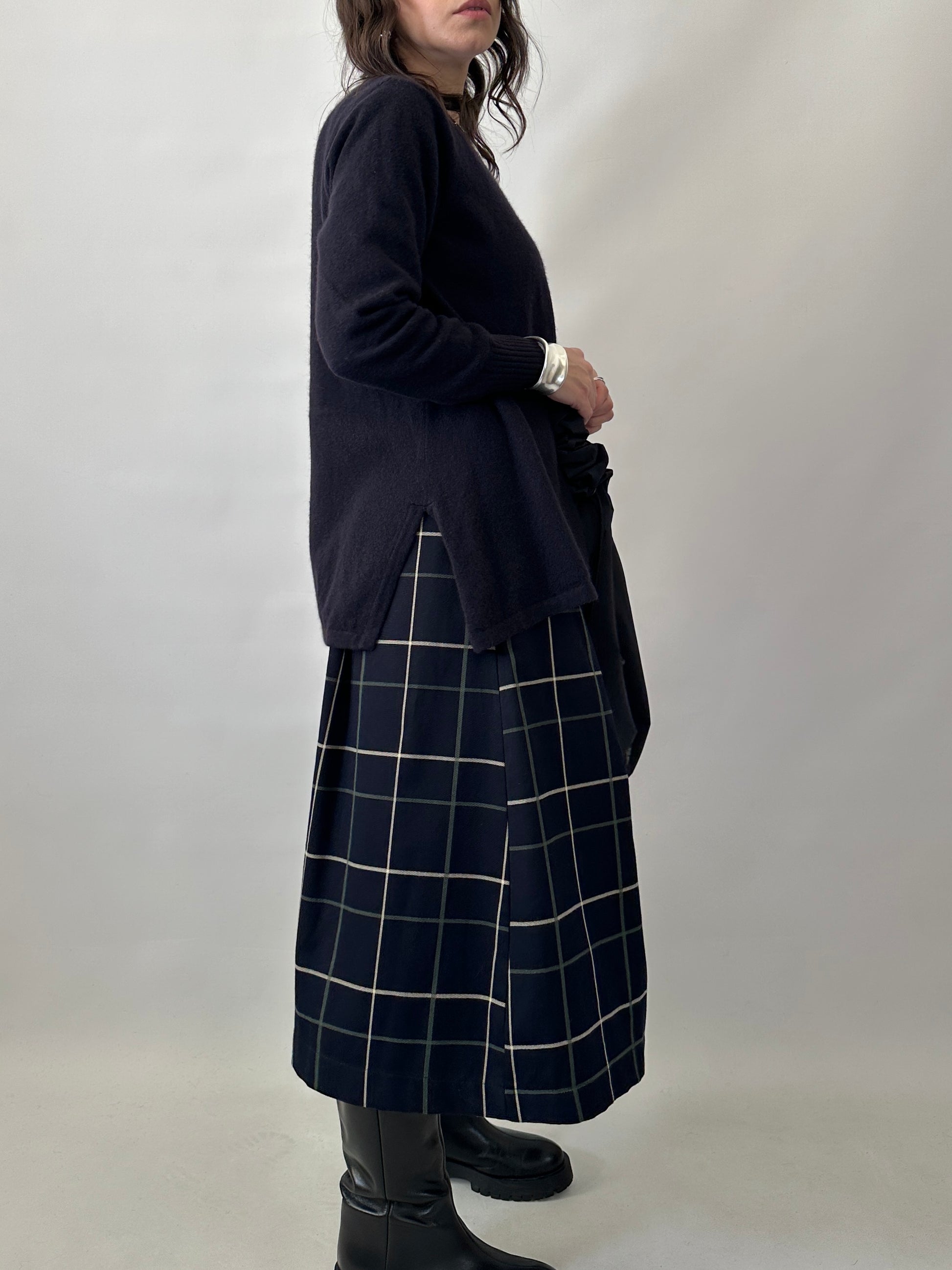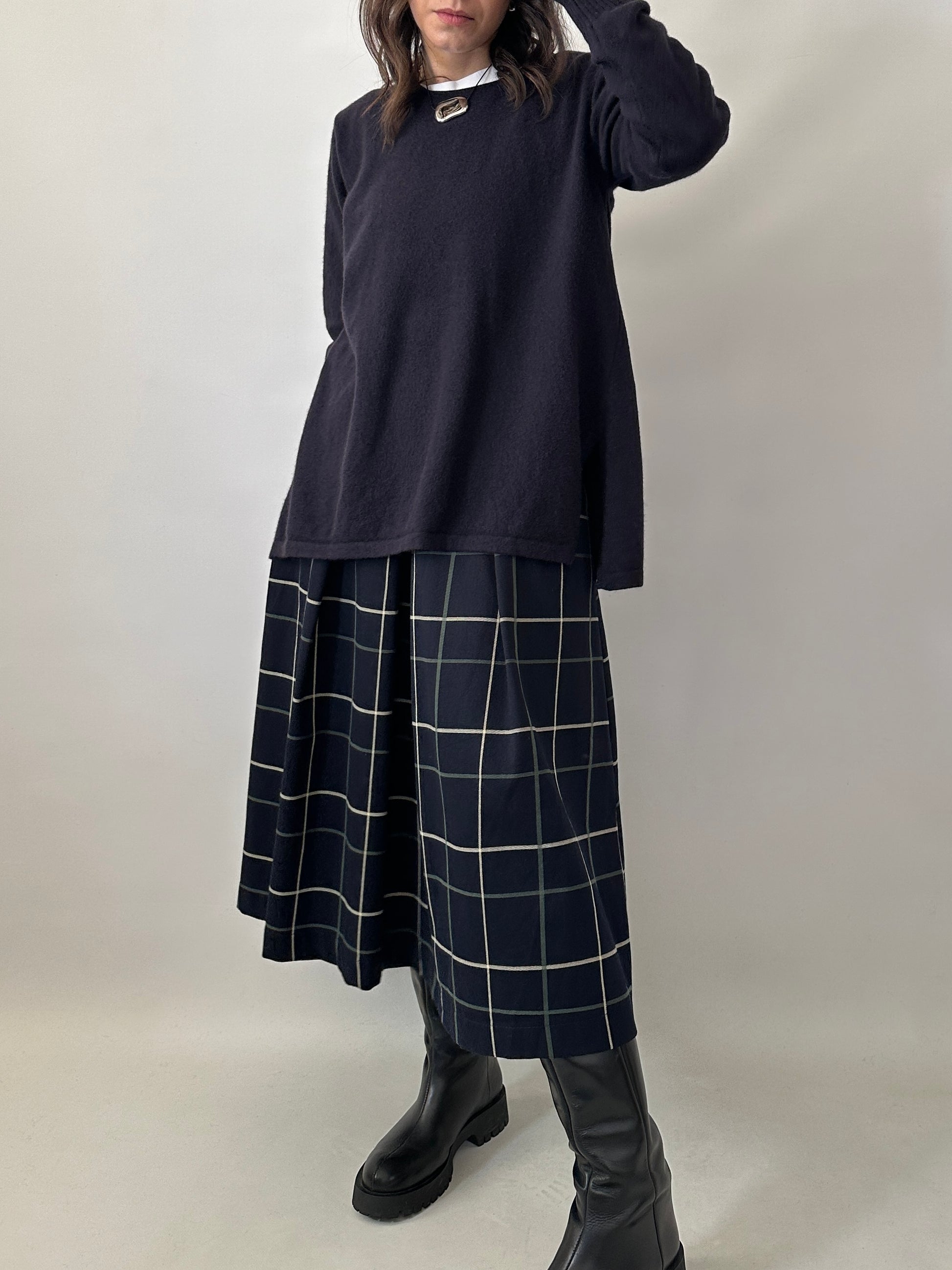 Maglione firmato Max Mara in lana e angora, color blu notte. Il filato è soffice e leggermente peloso tipico dell’angora, con una texture calda e avvolgente. Linea svasata e morbida, con spacchi laterali che donano movimento al capo e scollo rotondo pulito. Made in Italy. Un modello essenziale ma con una femminilità discreta, perfetto per chi ama l’eleganza rilassata e i volumi armoniosi tipici della maglieria Max Mara.