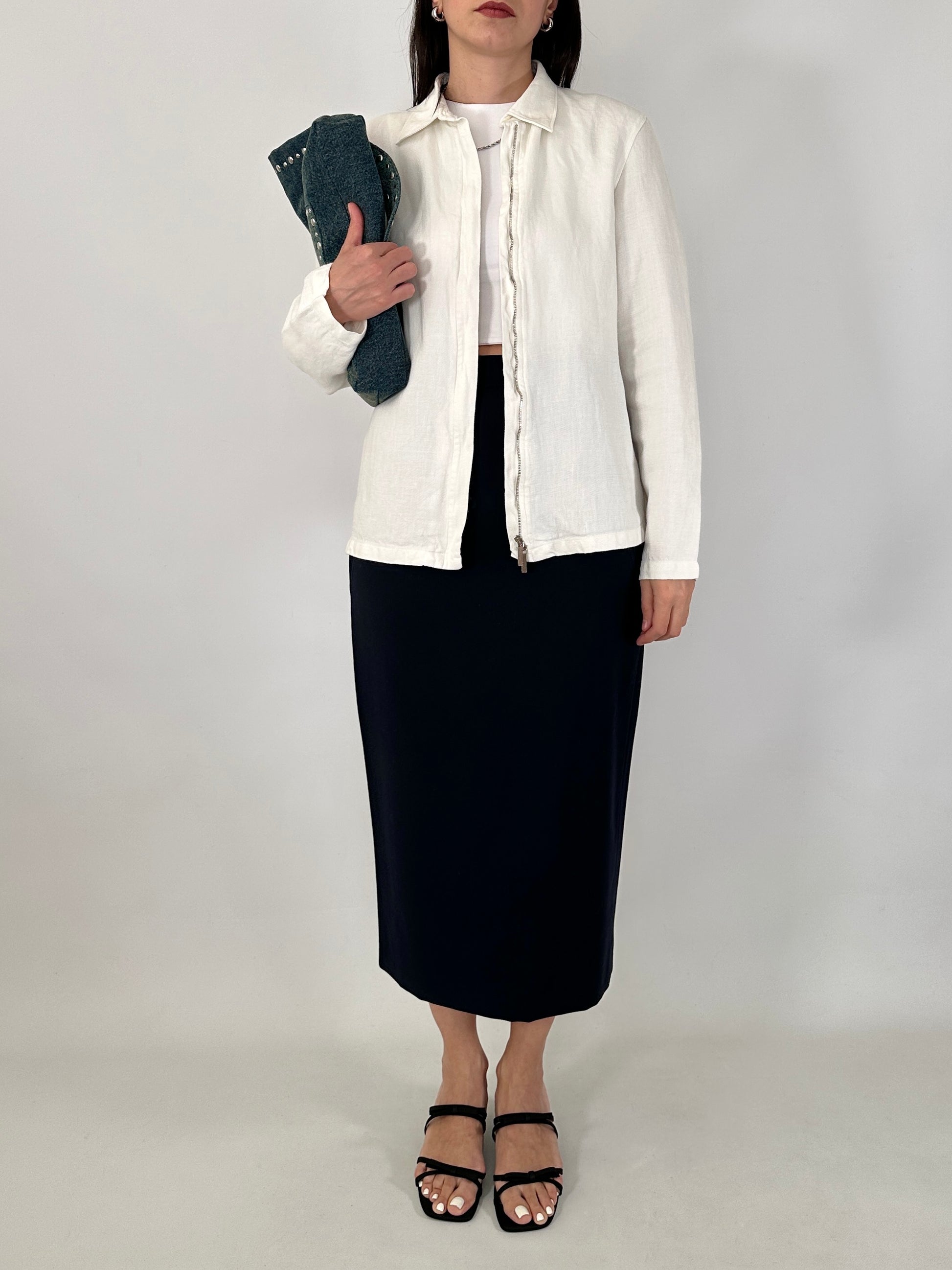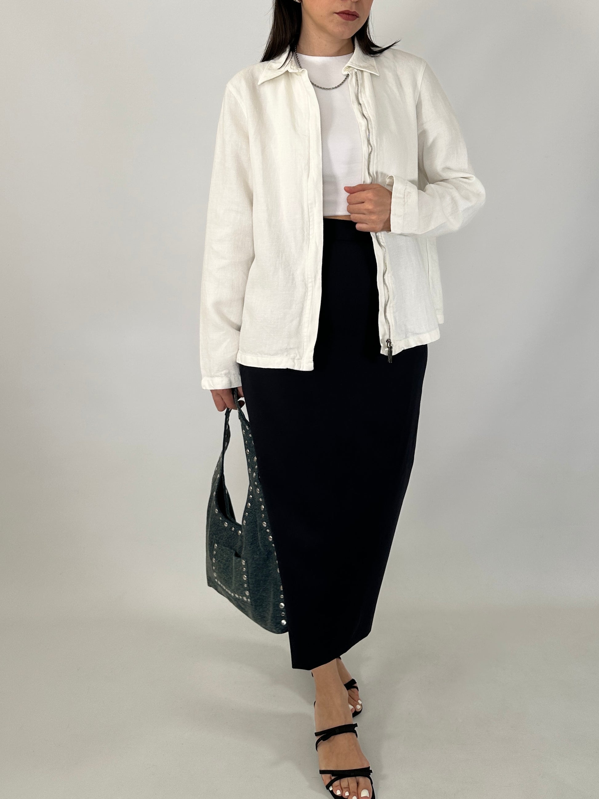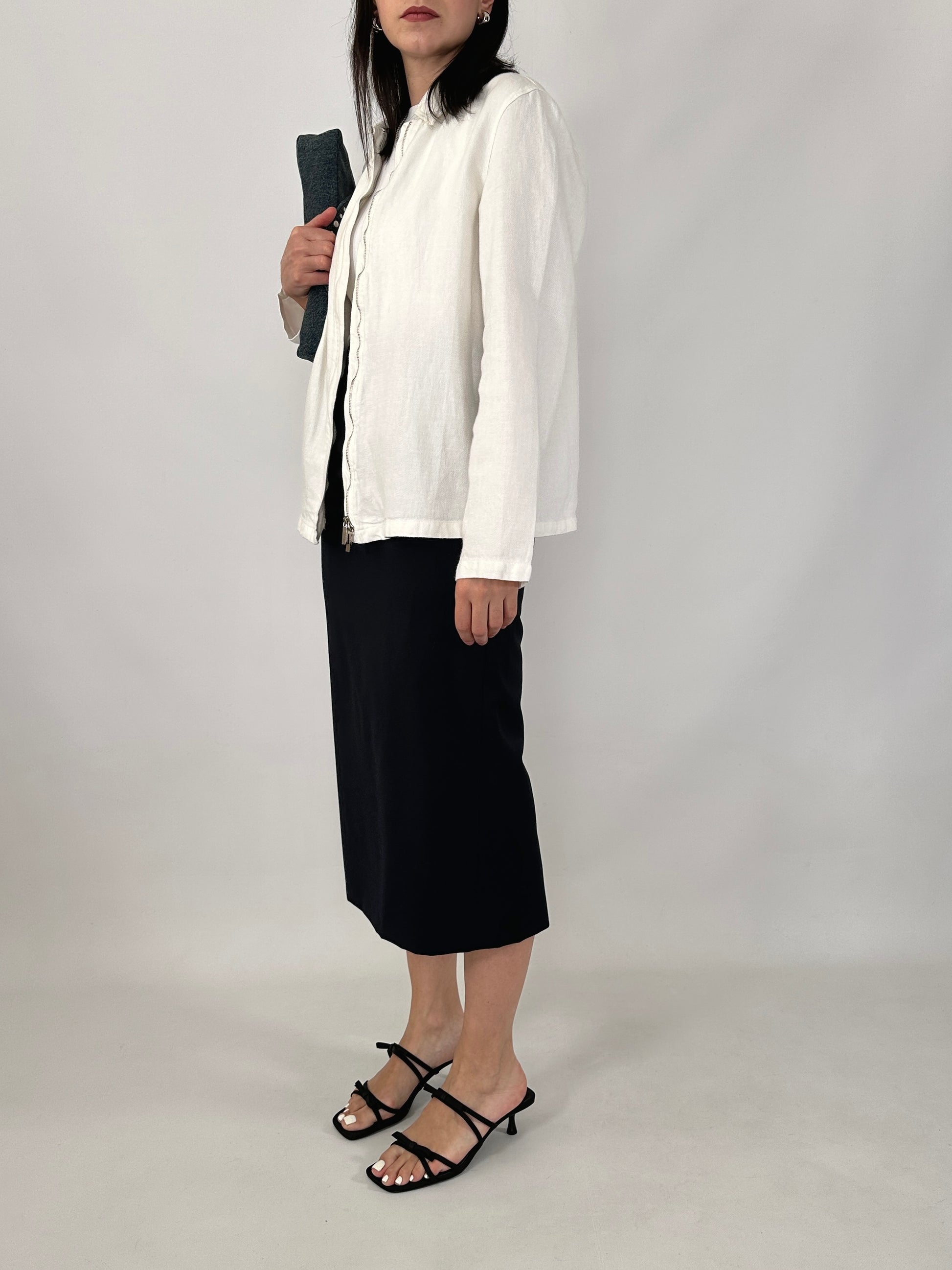 Giacca leggera S Max Mara in puro lino bianco. Colletto classico, zip centrale con doppio cursore, sfoderata. Vestibilità dritta.