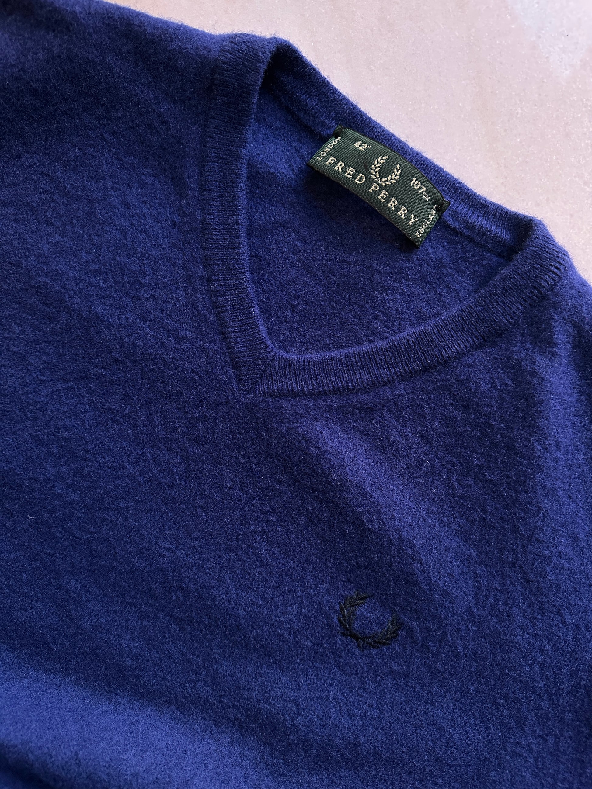 Maglione Fred Perry in lana blu intenso. Scollo a V, maniche lunghe, bordi a costine su polsini e fondo, logo Fred Perry ricamato sul petto lato cuore. Consistenza morbida e soffice con texture vaporosa. Un capo versatile, perfetto per creare look rilassati ma curati.