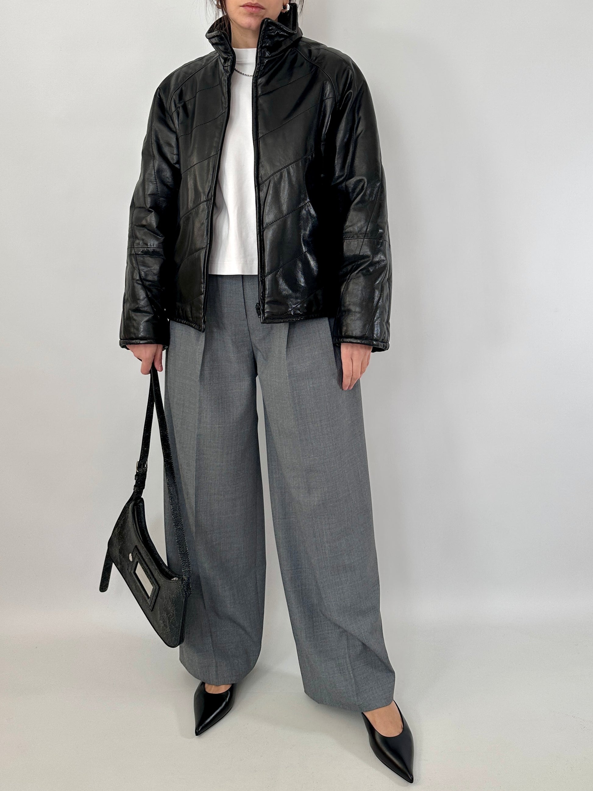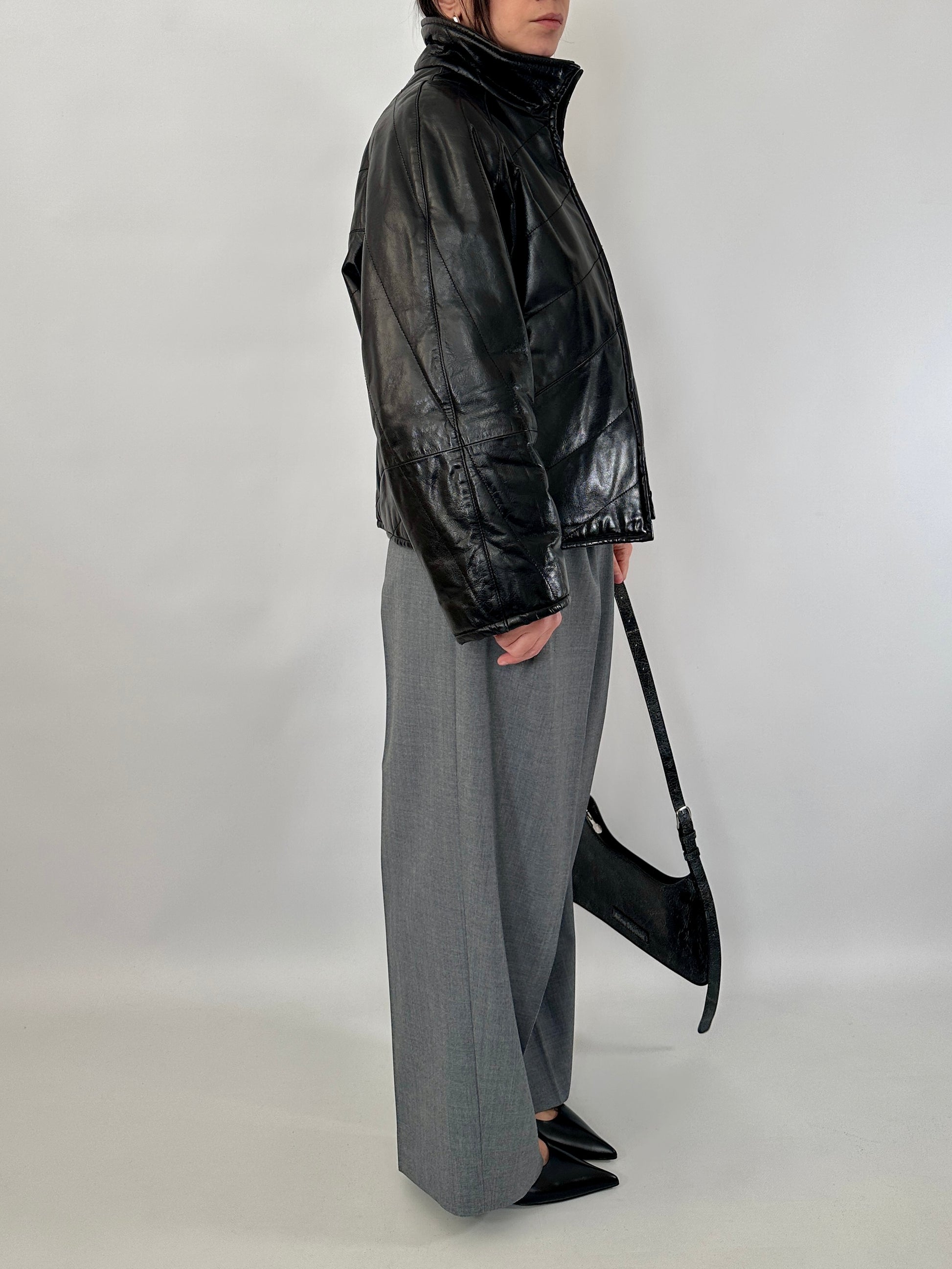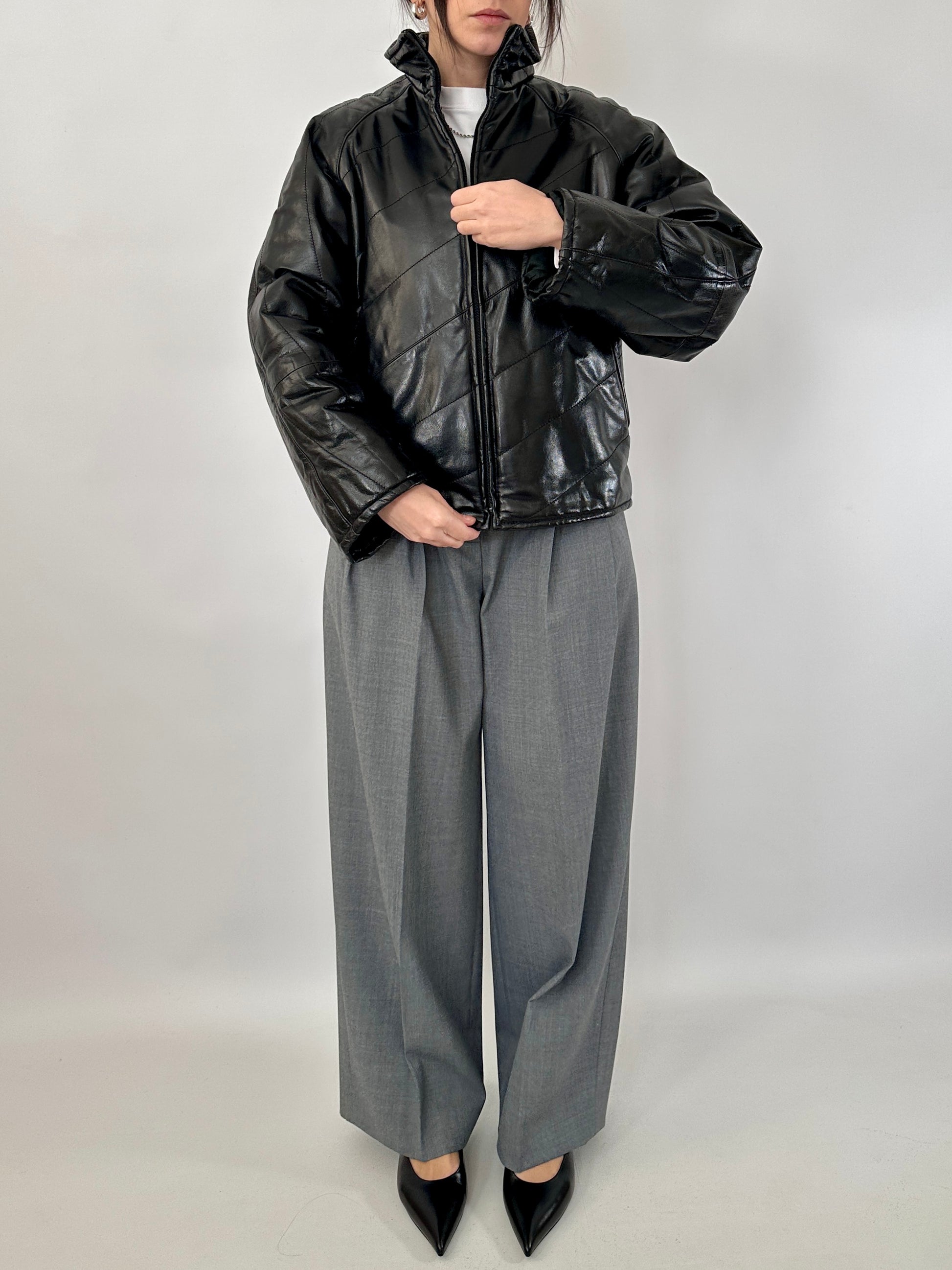 Giubbotto trapuntato in vera pelle dal finish lucido. Leggermente trapuntato, collo alto, chiusura con zip centrale, due tasche oblique.