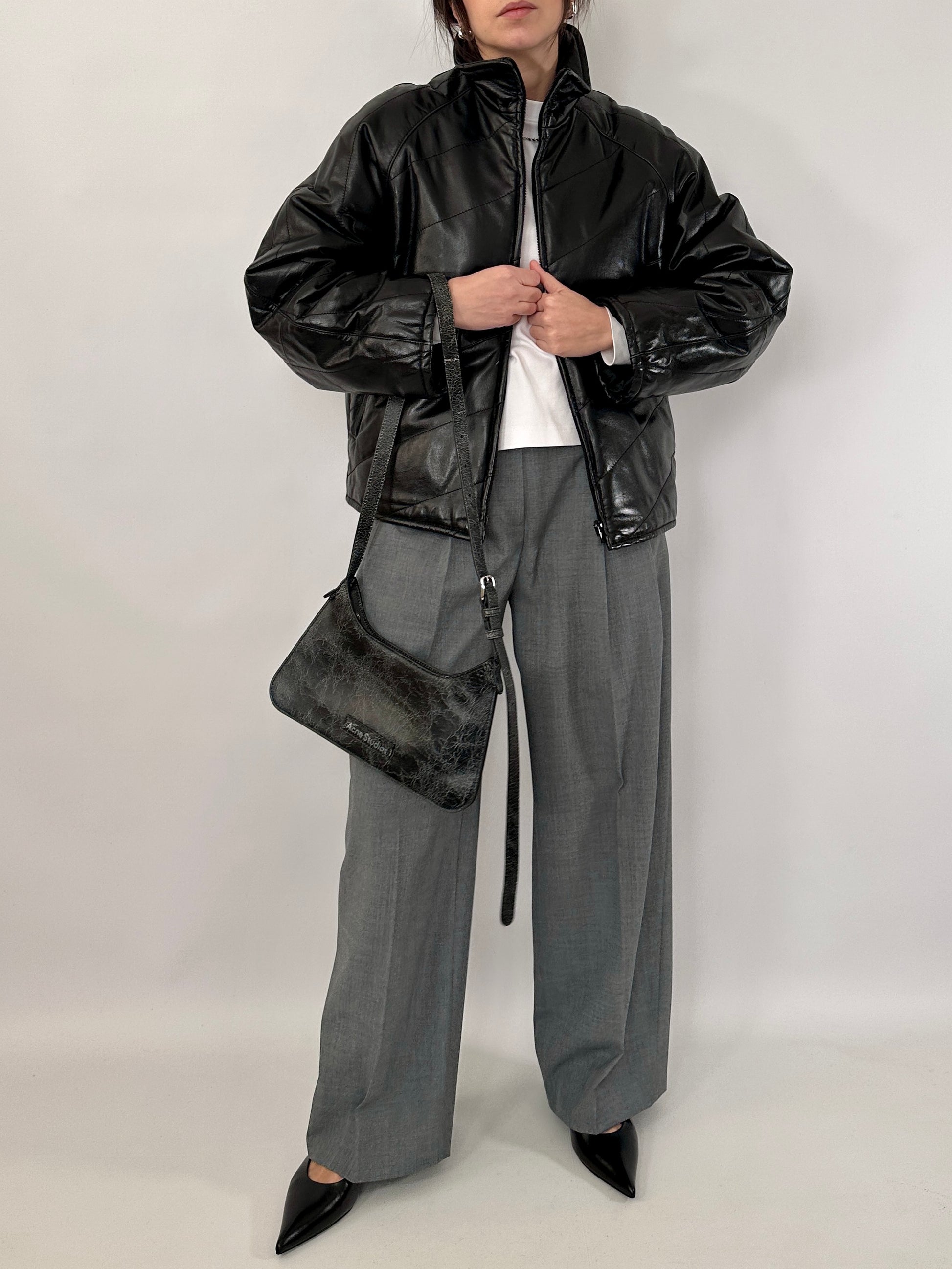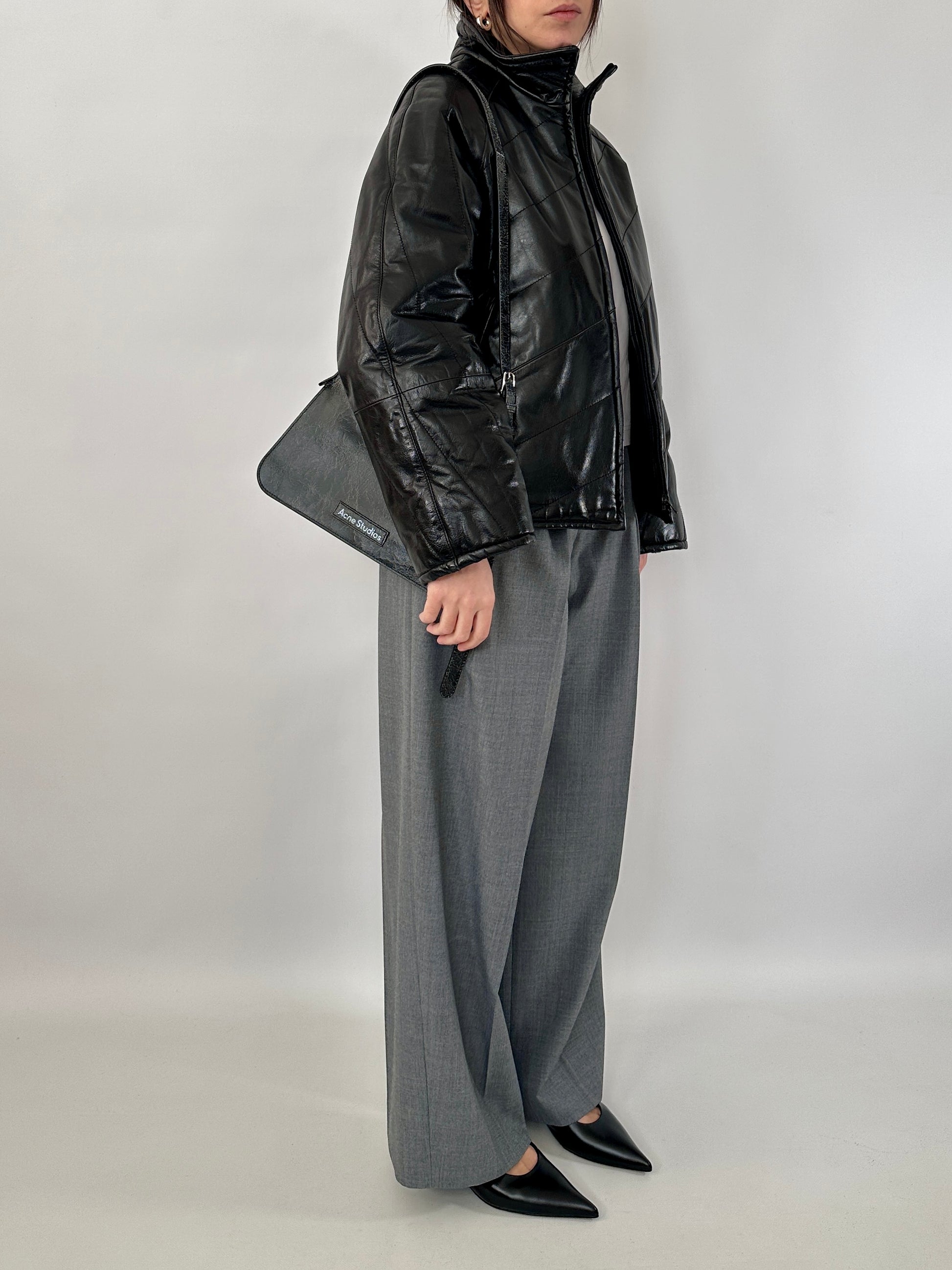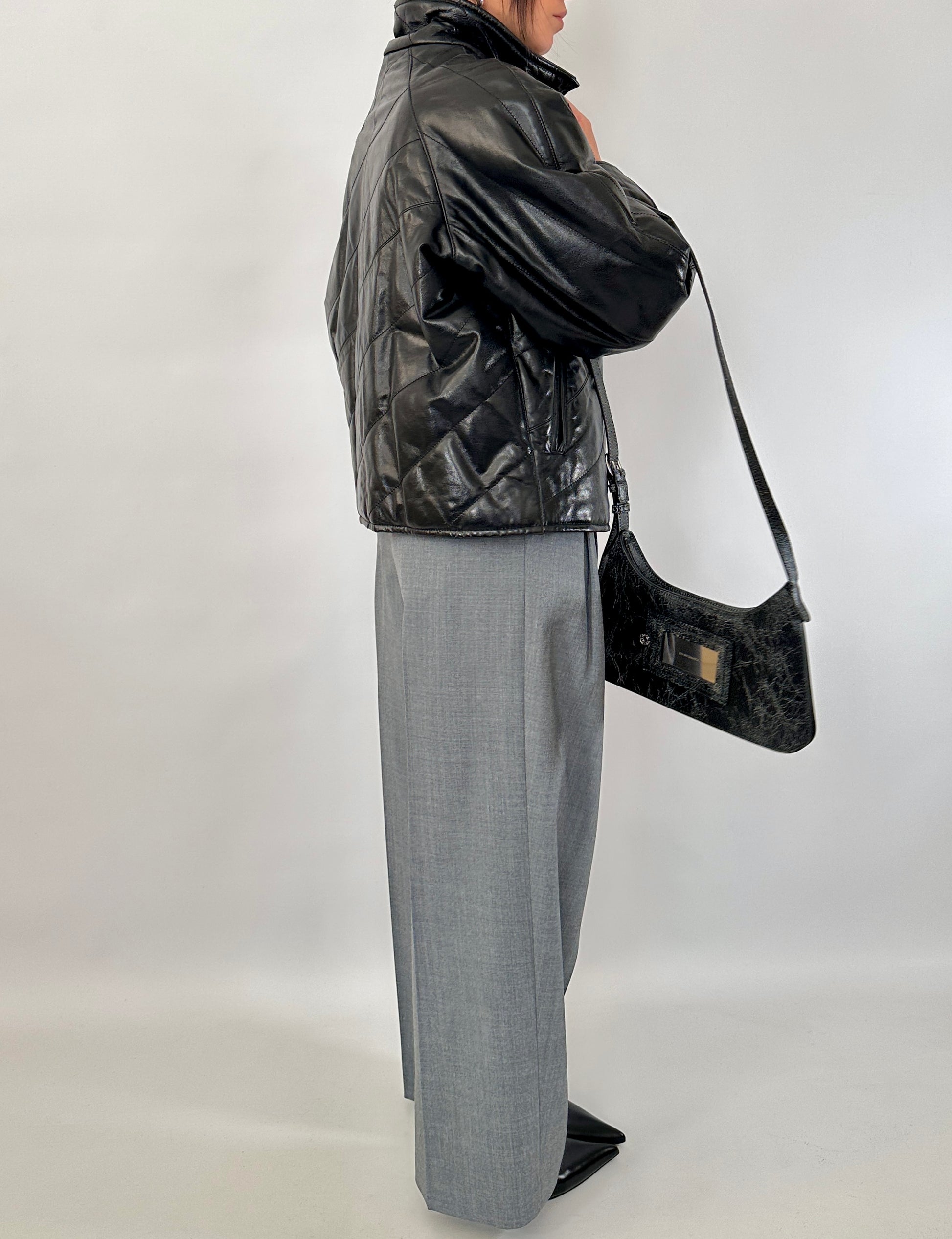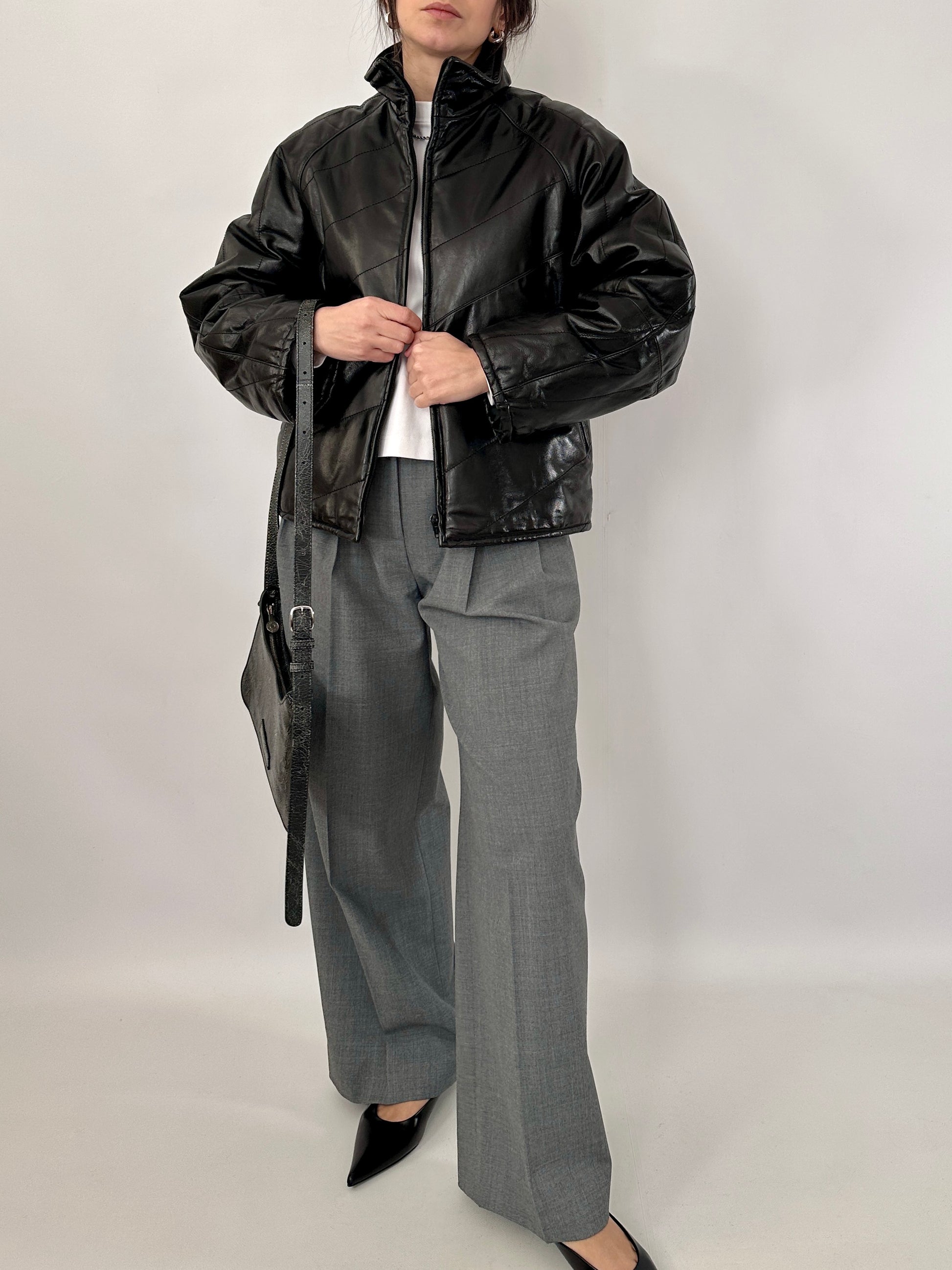 Giubbotto trapuntato in vera pelle dal finish lucido. Leggermente trapuntato, collo alto, chiusura con zip centrale, due tasche oblique.
