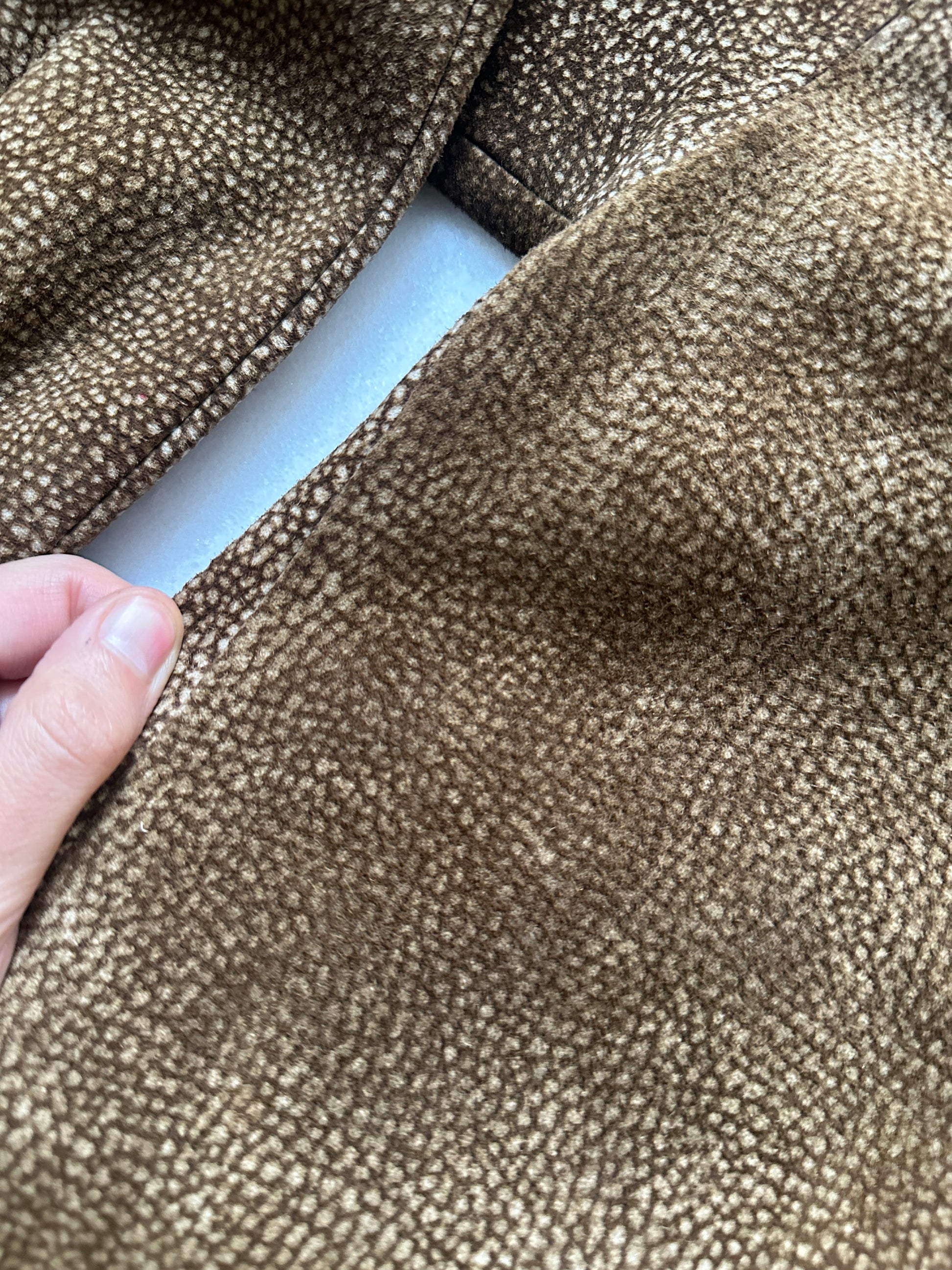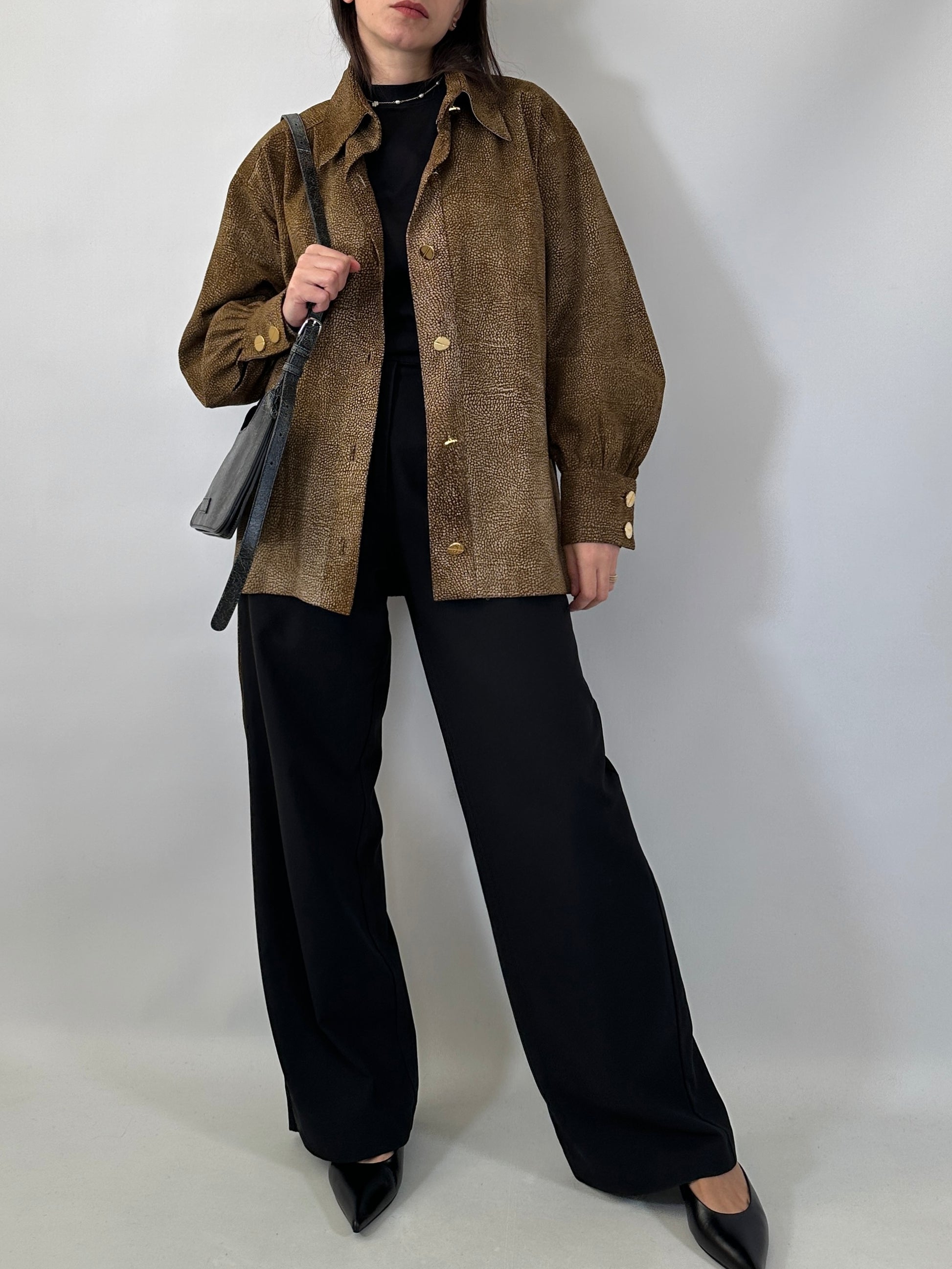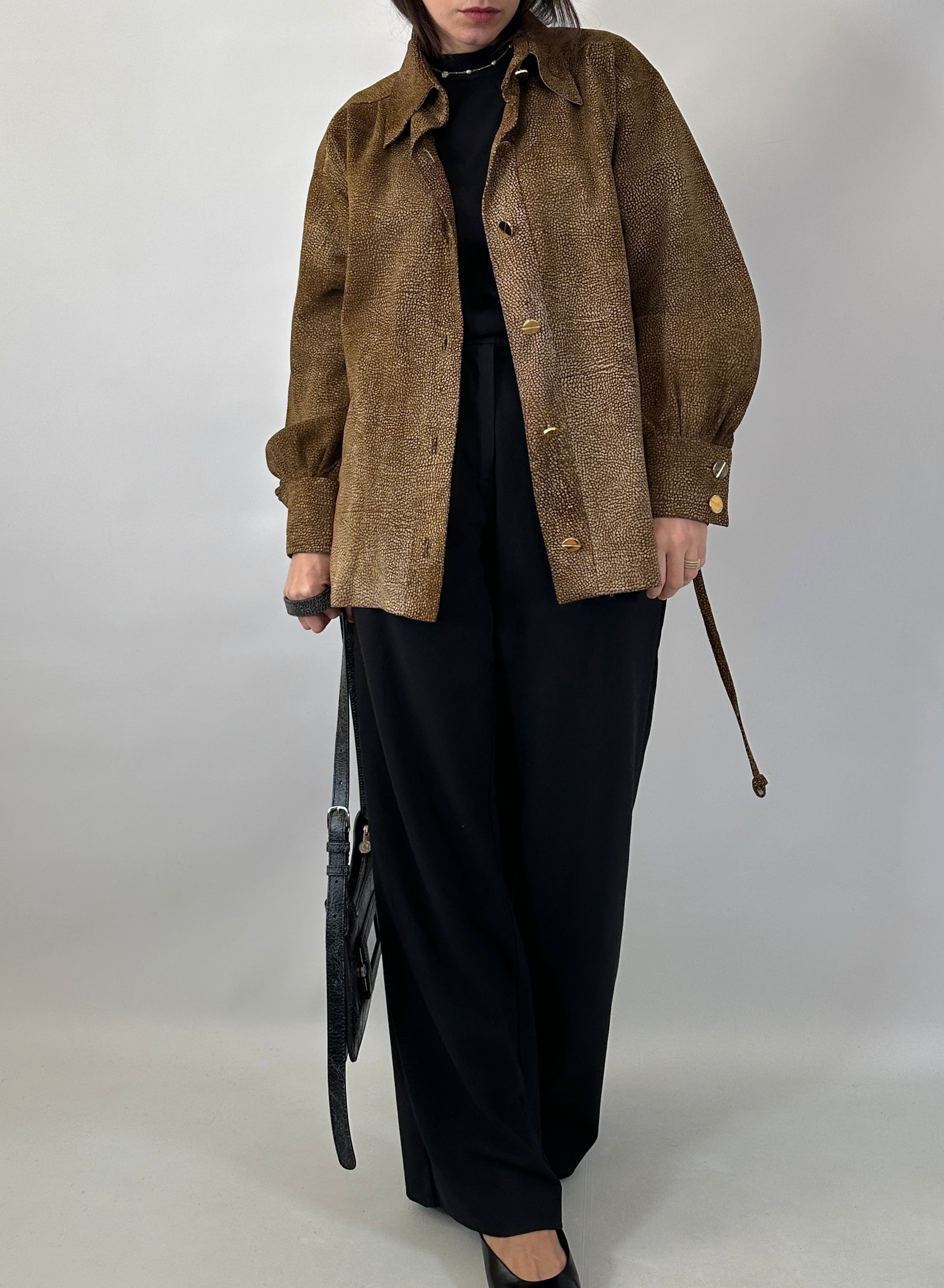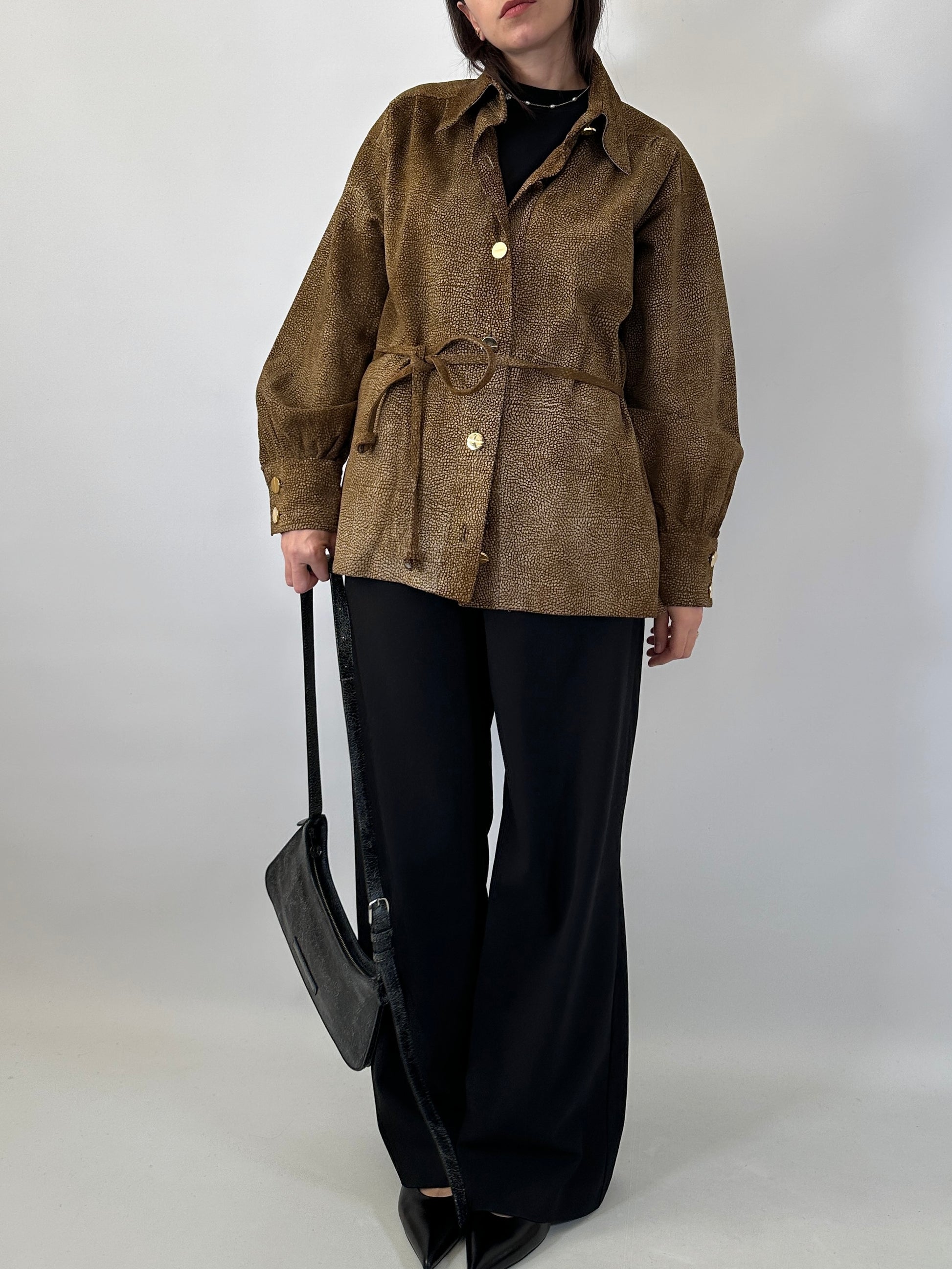 Giacca-camicia artigianale in vera pelle scamosciata con fantasia a rilievo nei toni del beige e del marrone che crea un effetto tridimensionale e raffinato.