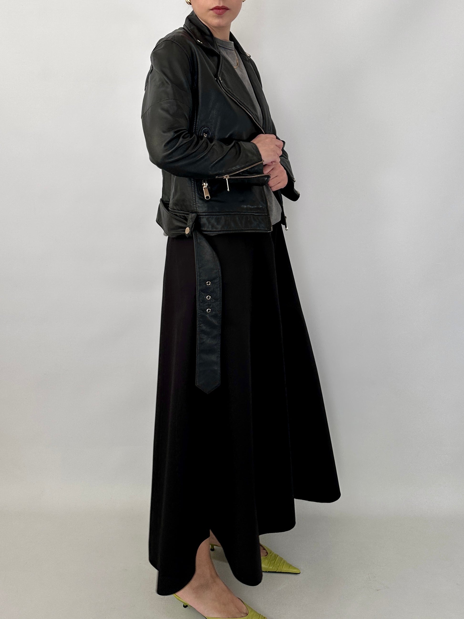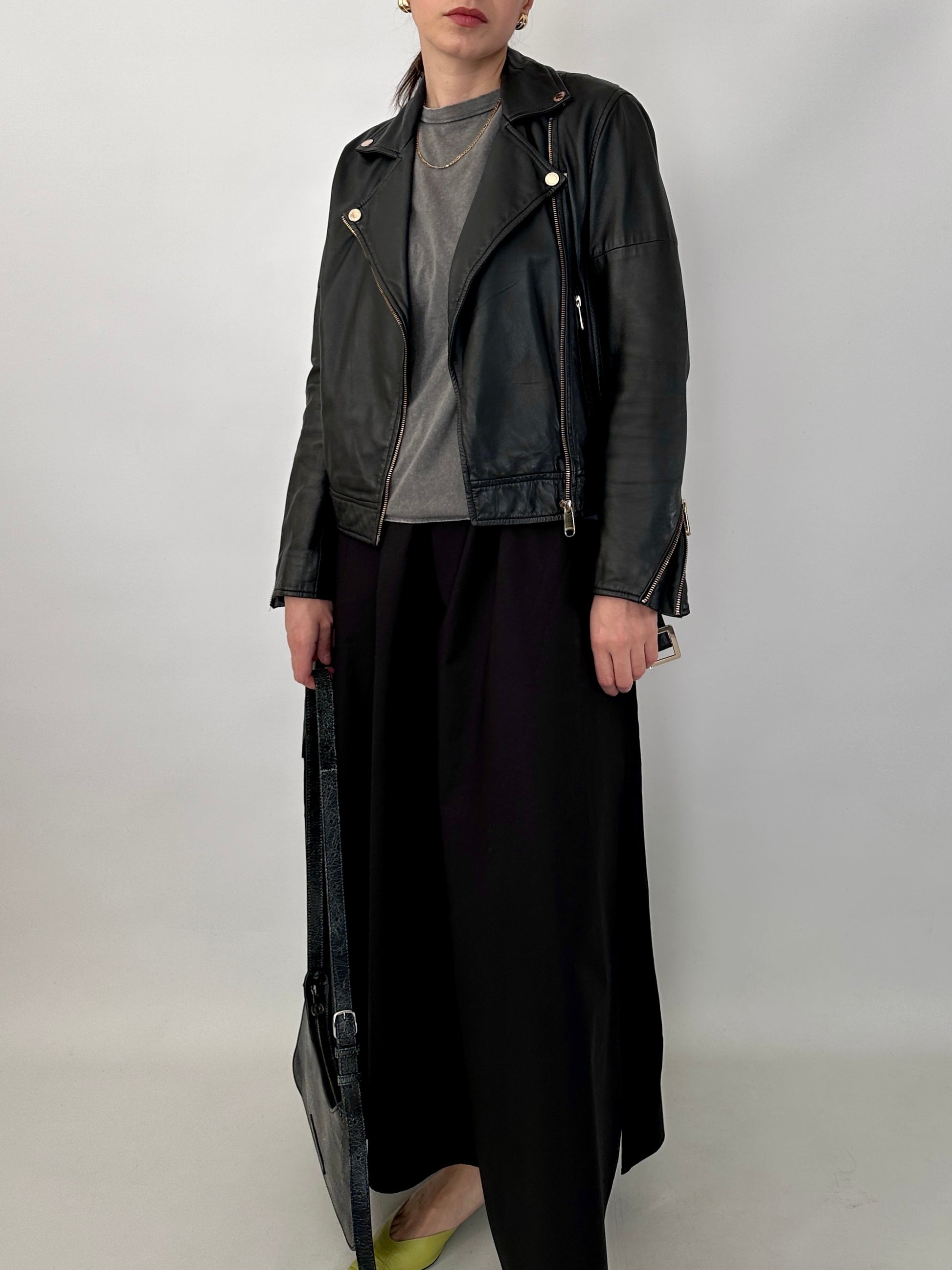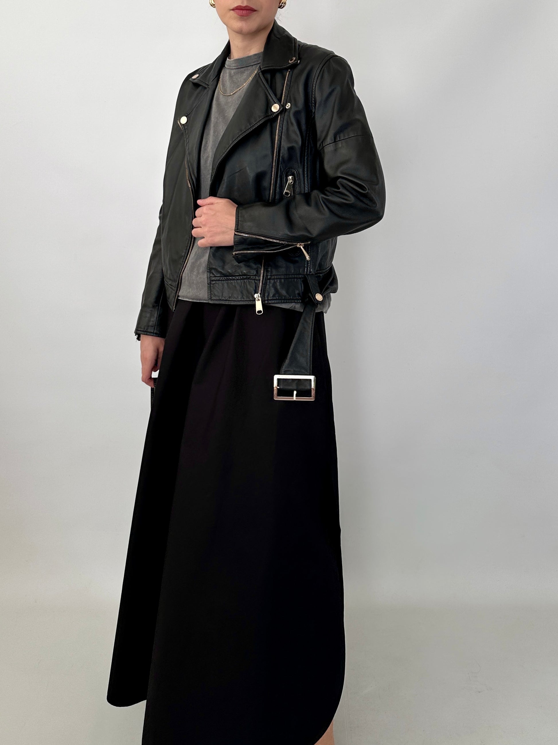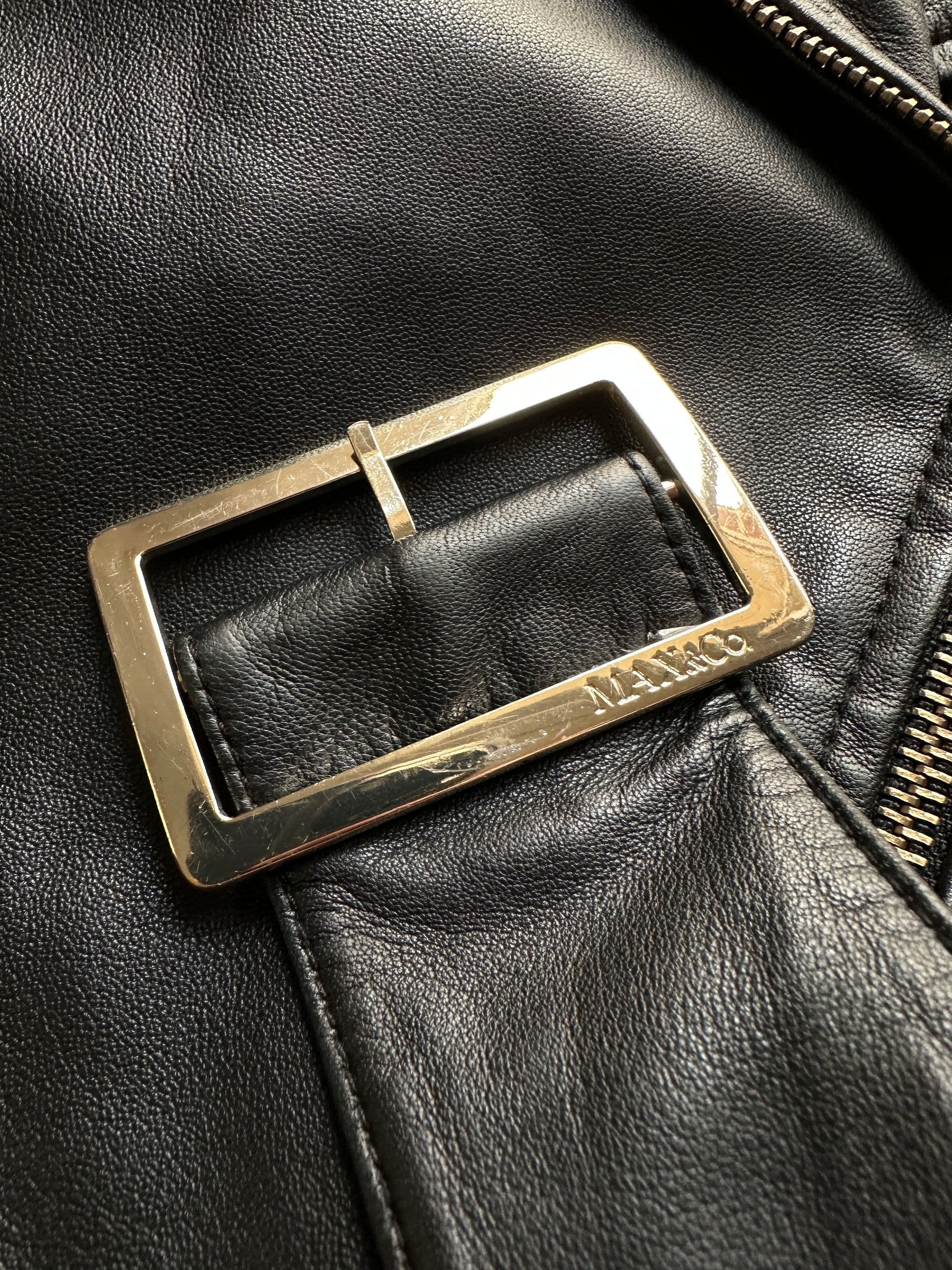 Chiodo second-hand Max&co, in morbidissima pelle ovina 100%. Colore nero con hardware oro. Ha tutti gli elementi del chiodo: zip diagonale, revers, cintura, zip sui polsini.
