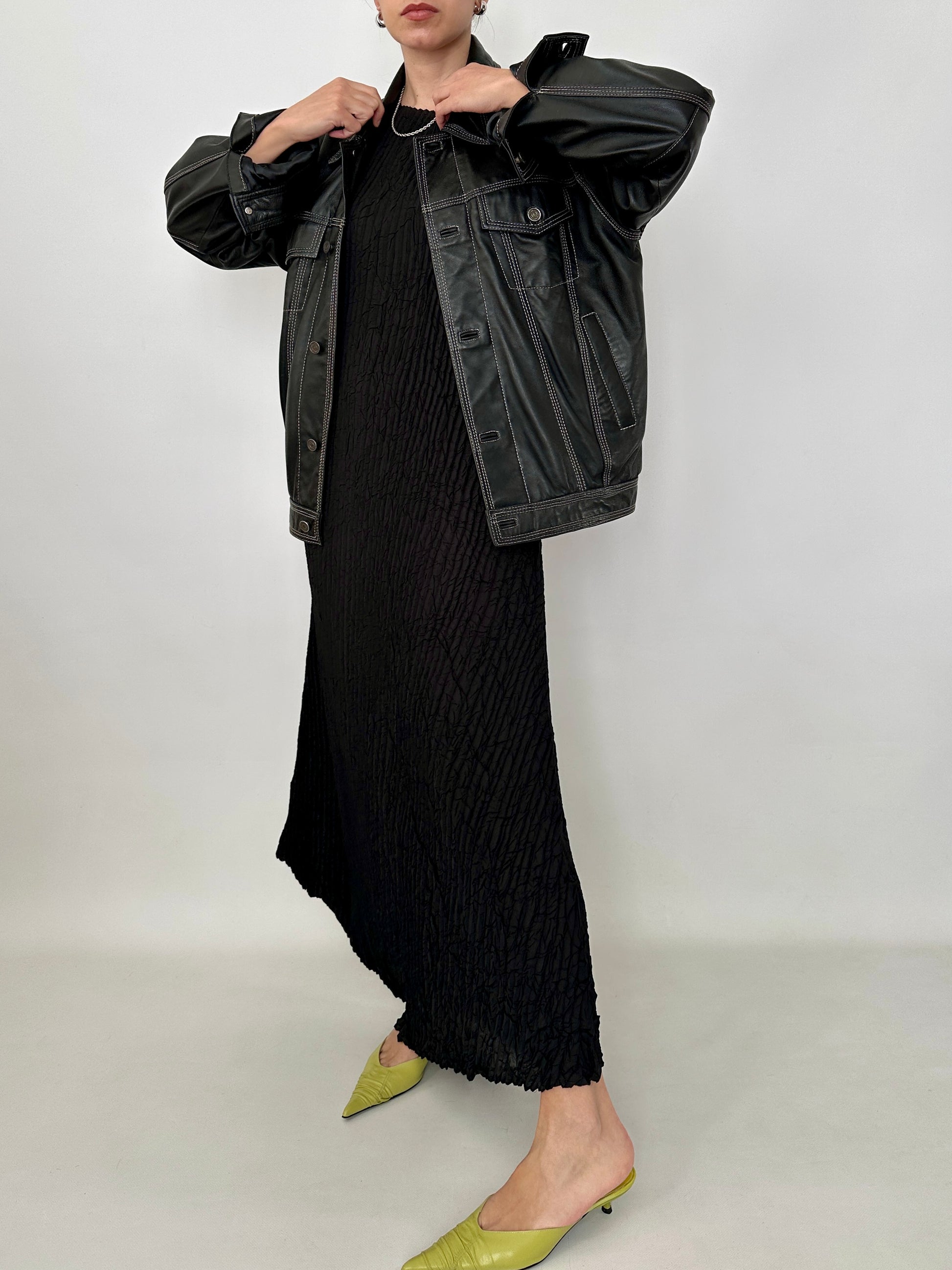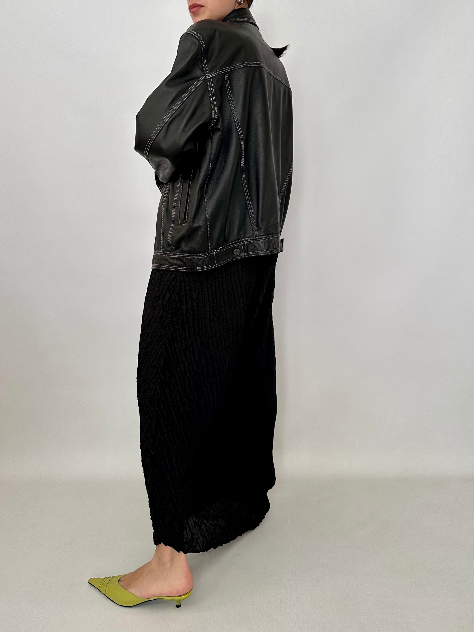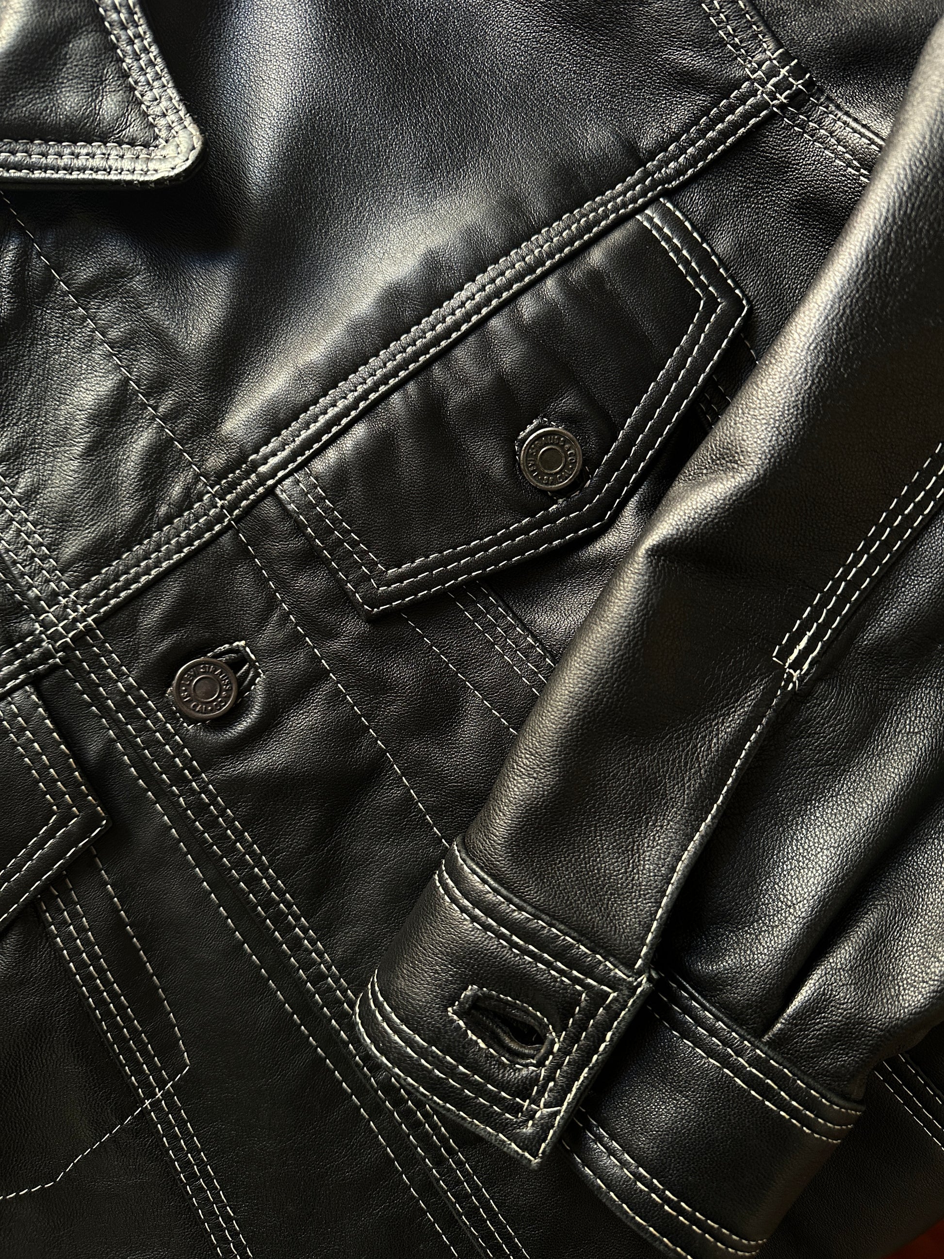 Giacca tipo trucker in vera pelle. Colore nero con impunture bianche a contrasto.