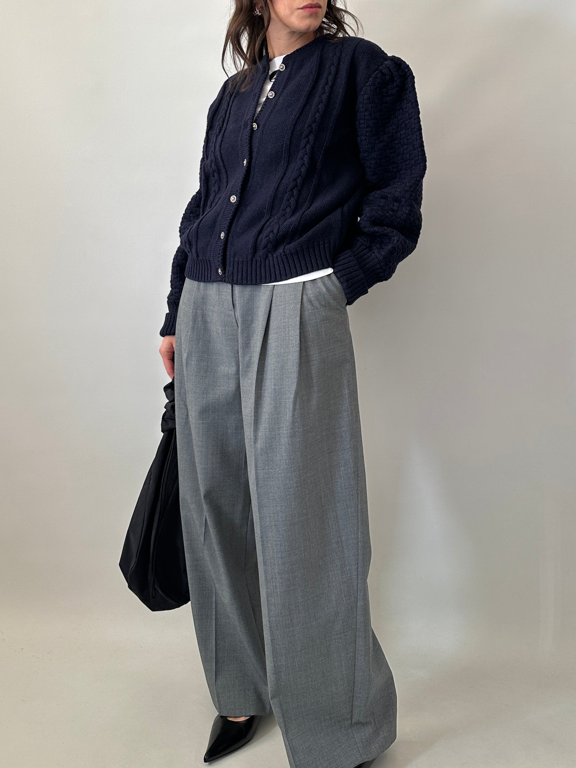 Cardigan vintage tirolese in lana, lavorato a maglia con motivi intrecciati e struttura tridimensionale. Il modello presenta maniche a sbuffo e linea morbida. La lavorazione alterna punti a treccia e texture a nido d’ape, creando un effetto ricco ma armonioso. Chiusura frontale con bottoni decorativi. Un capo caldo, solido e dall’eleganza romantica, ideale come cardigan per la stagione fredda, ma anche come giacca per le mezze stagioni.