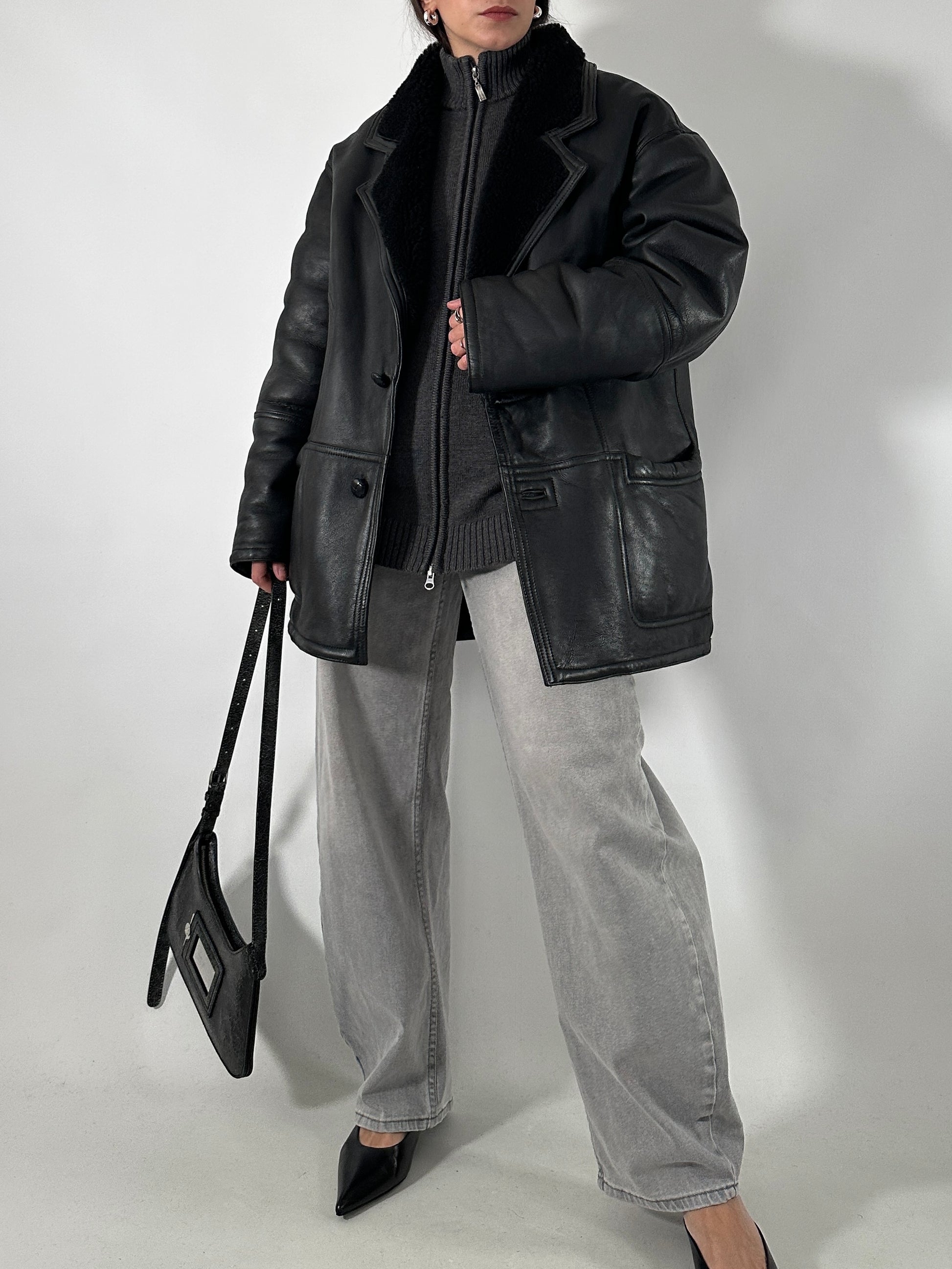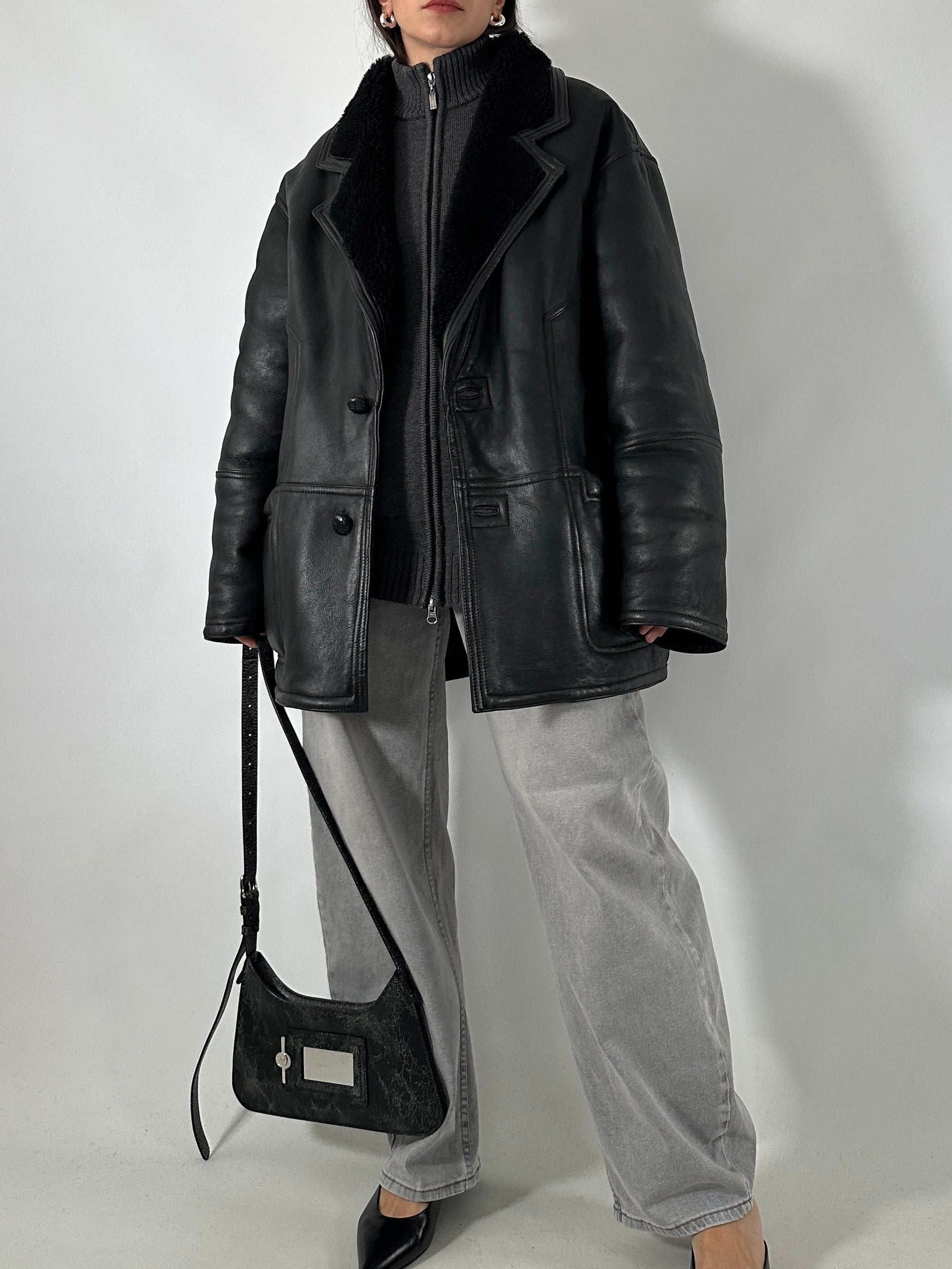 Styling tips: Perfetto con denim scuro e stivali a punta per un look deciso e attuale. Indossalo anche su maglieria pesante e pantaloni sartoriali per un outfit caldo e sofisticato. Il total black lo rende estremamente versatile e molto più moderno rispetto ai montoni tradizionali in beige o marrone.