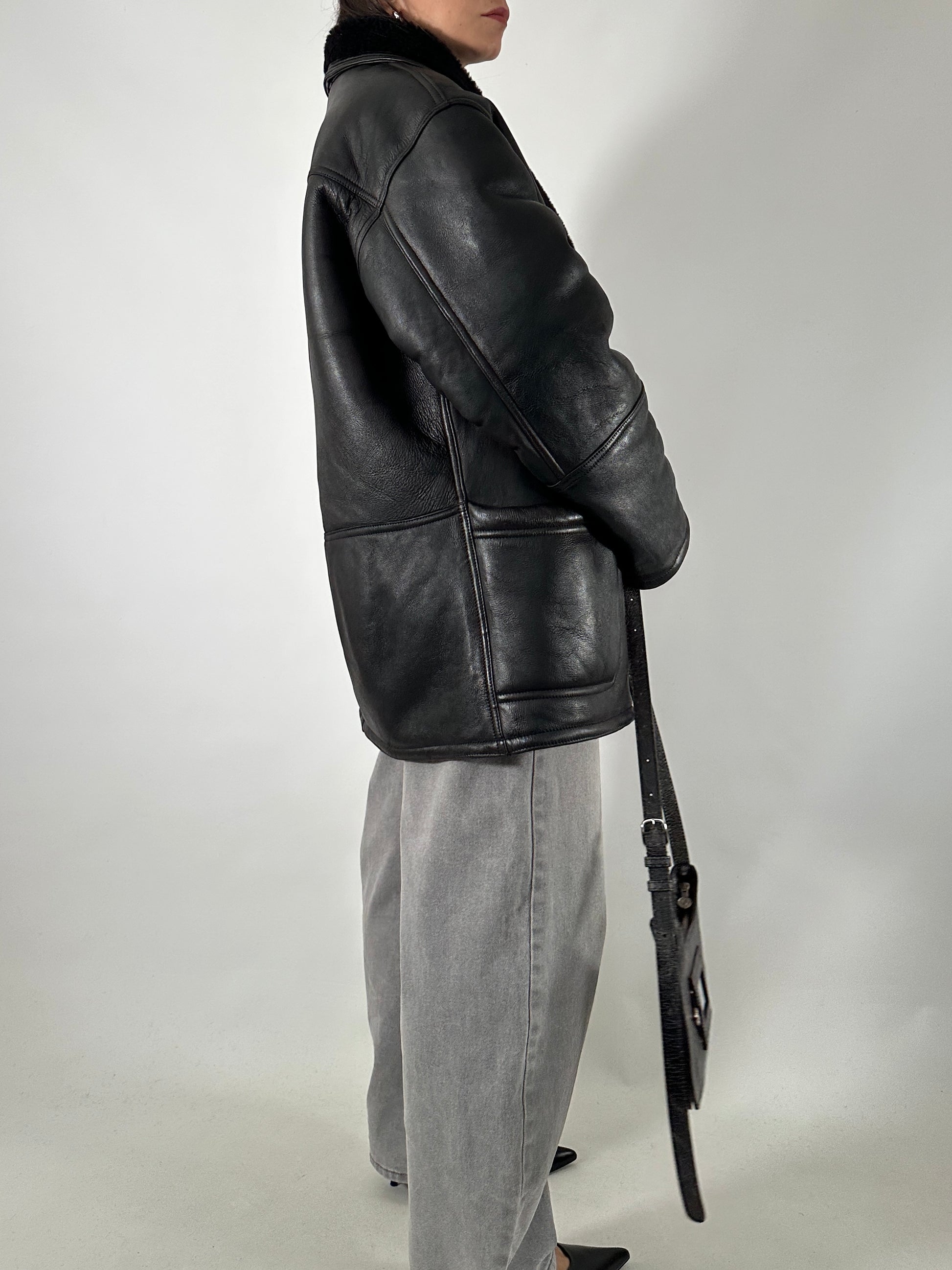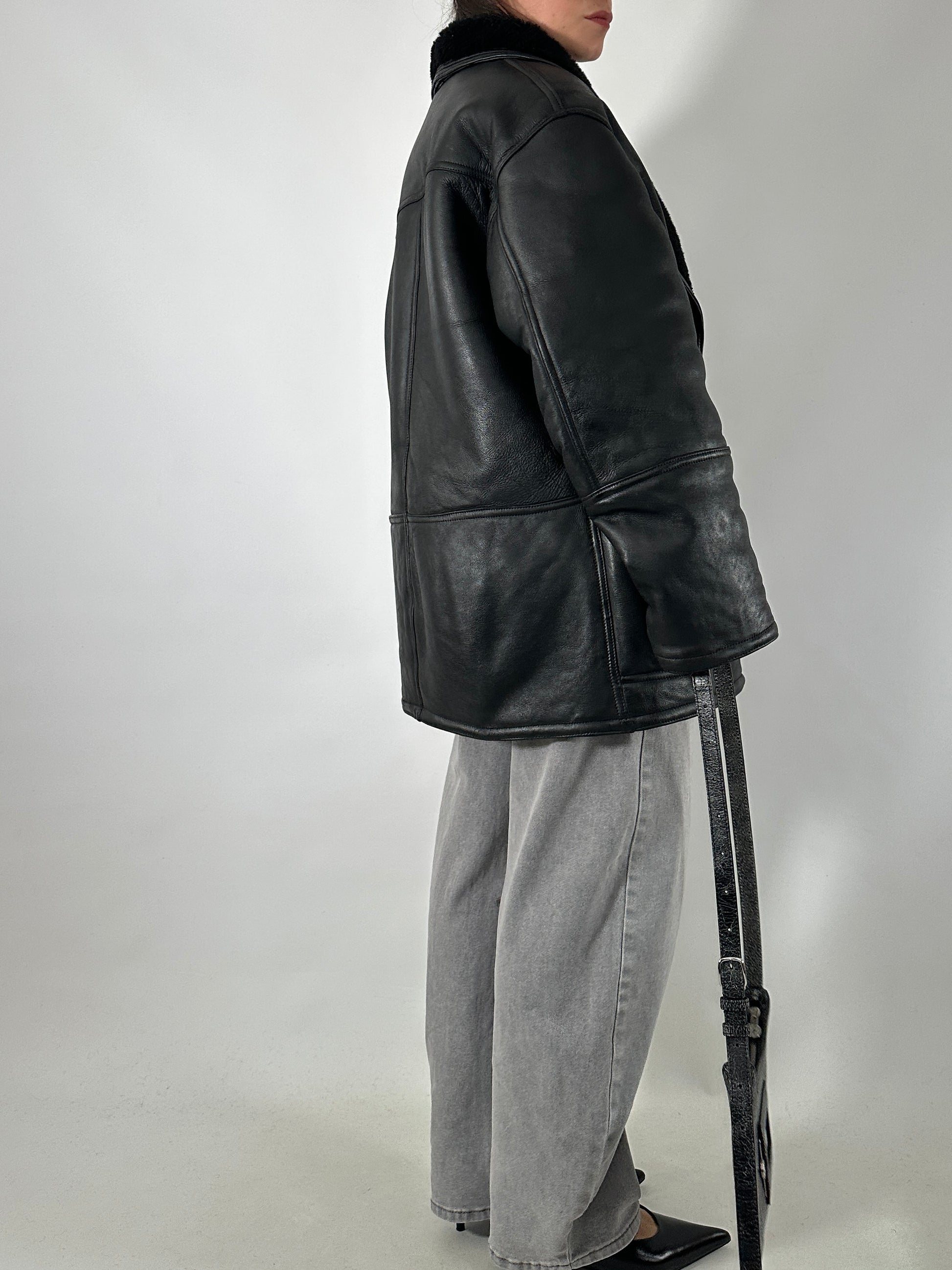Montone vintage originale in shearling completamente nero, una combinazione rara sia per colore che per costruzione. Il modello è monopetto, con rever classico e tasche laterali pulite, integrate nella linea del capo.