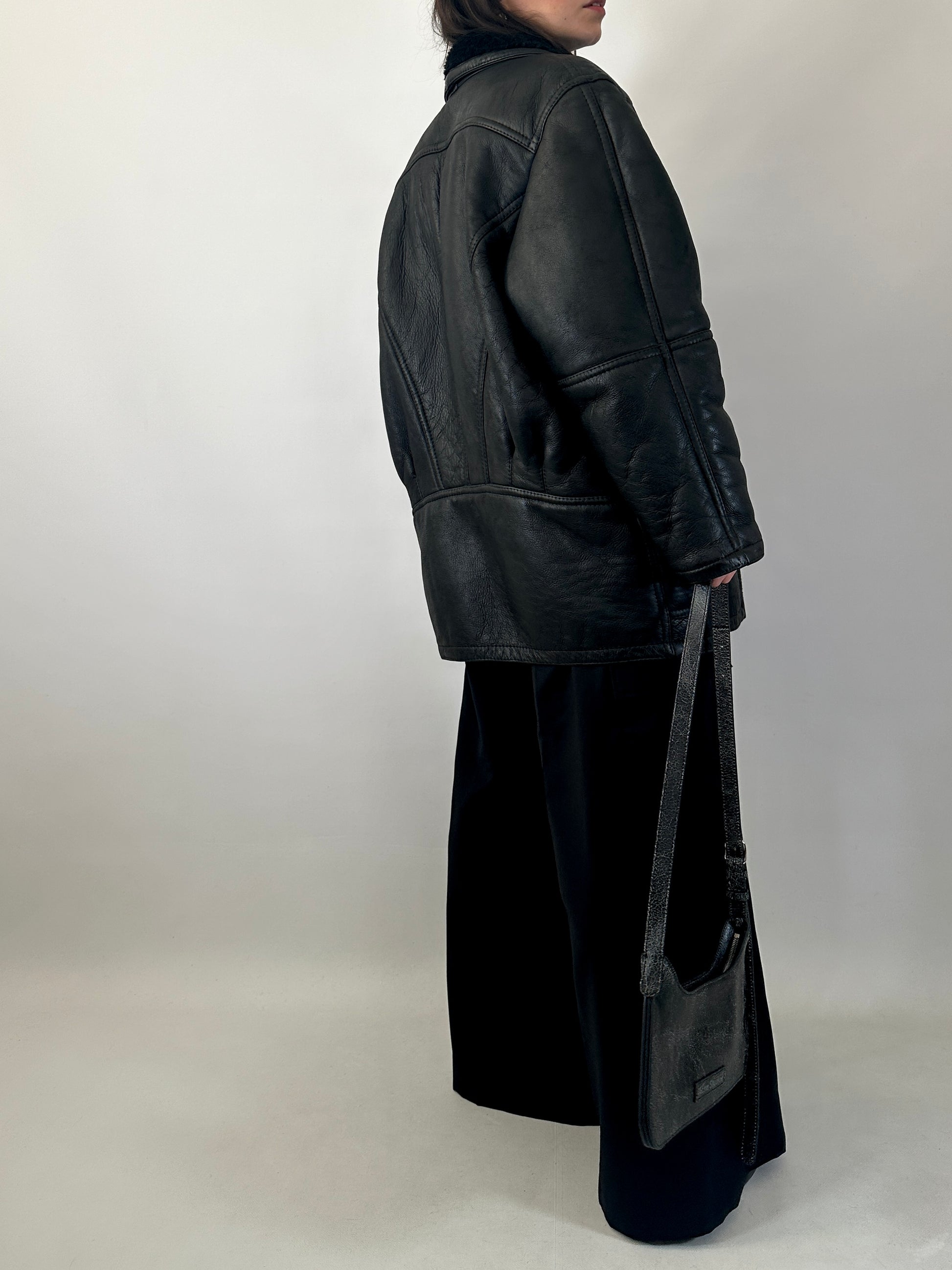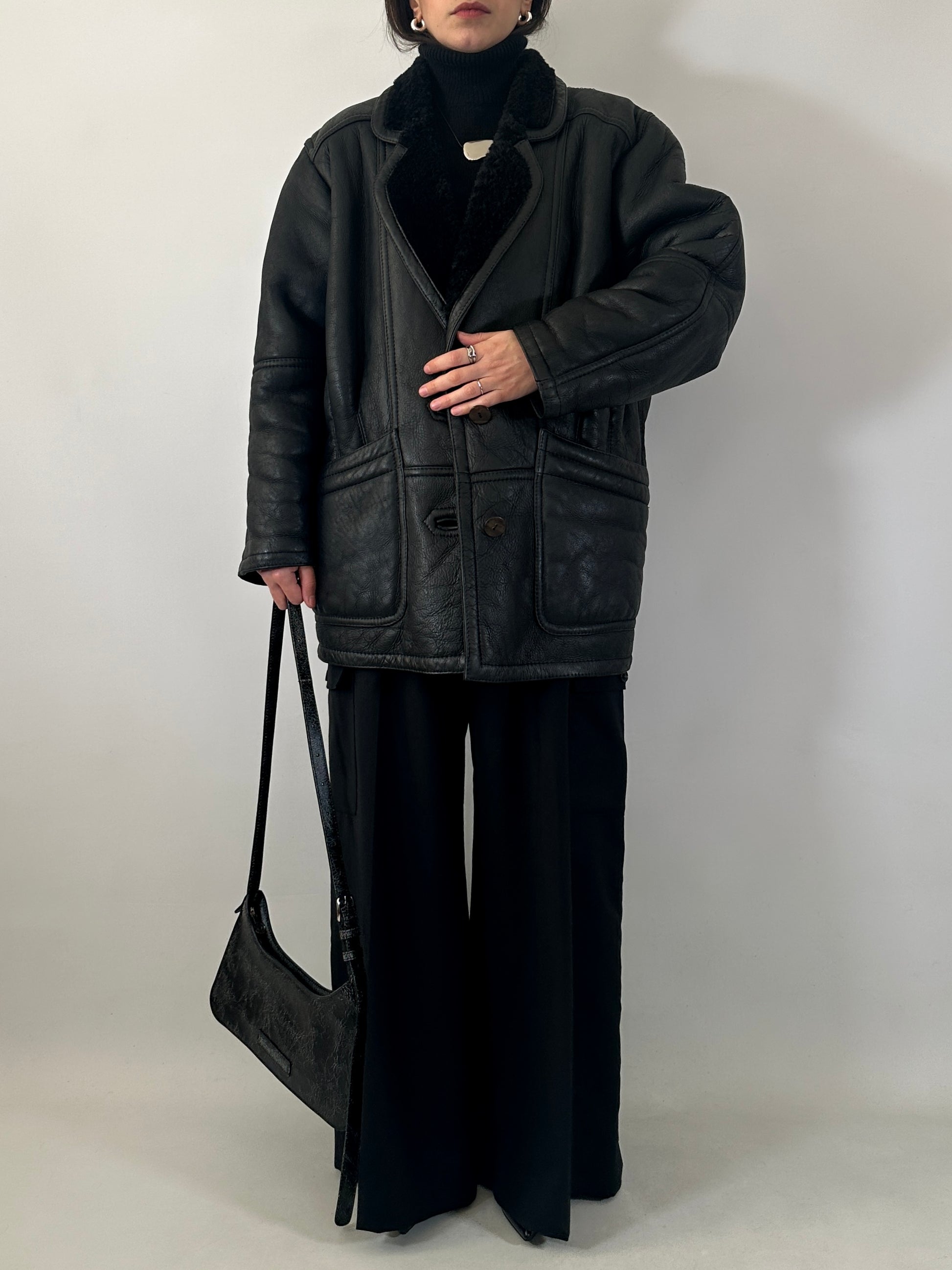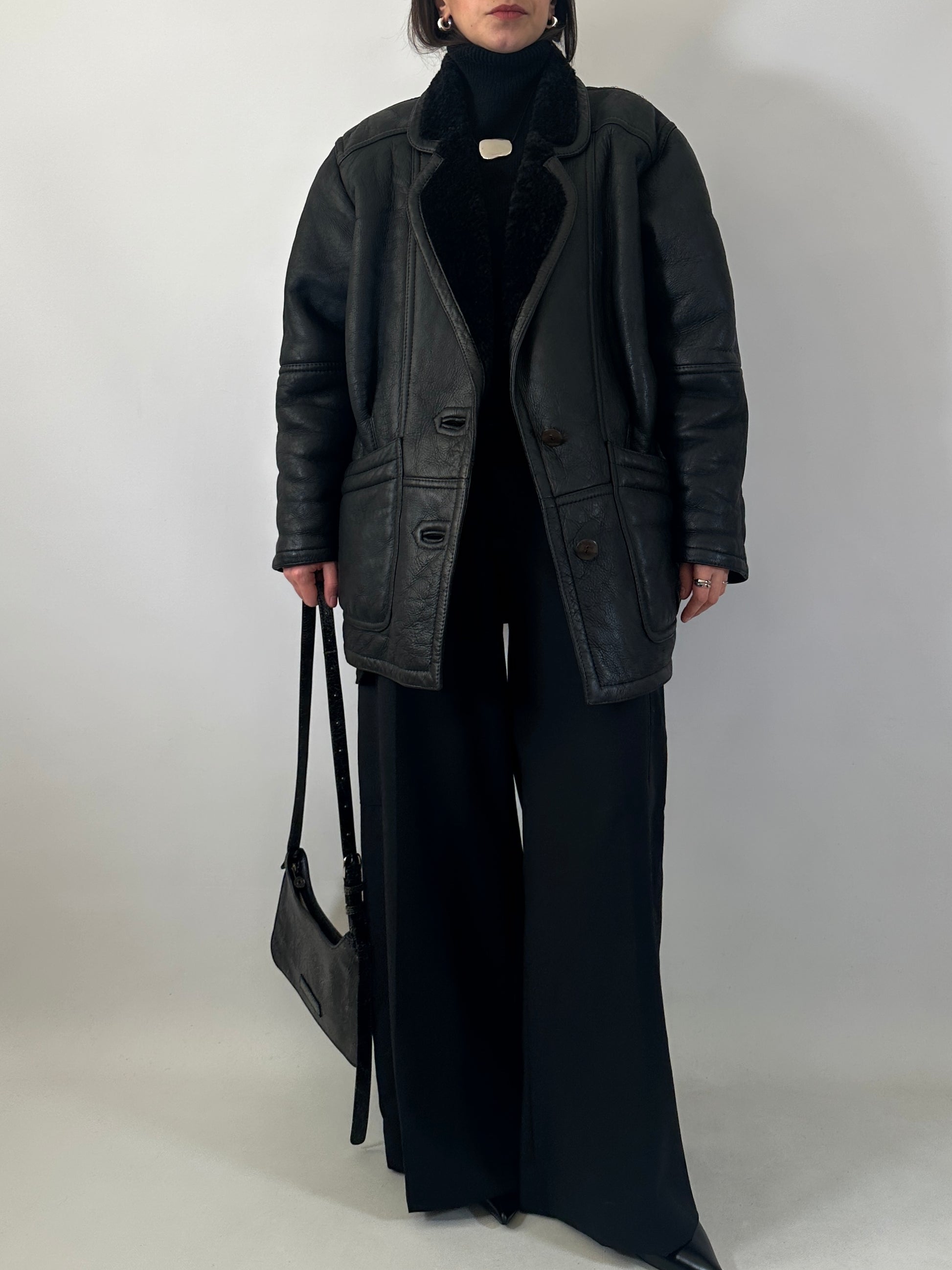 Original shearling vintage in vera pelle nera, con interno in pelliccia naturale tono su tono.