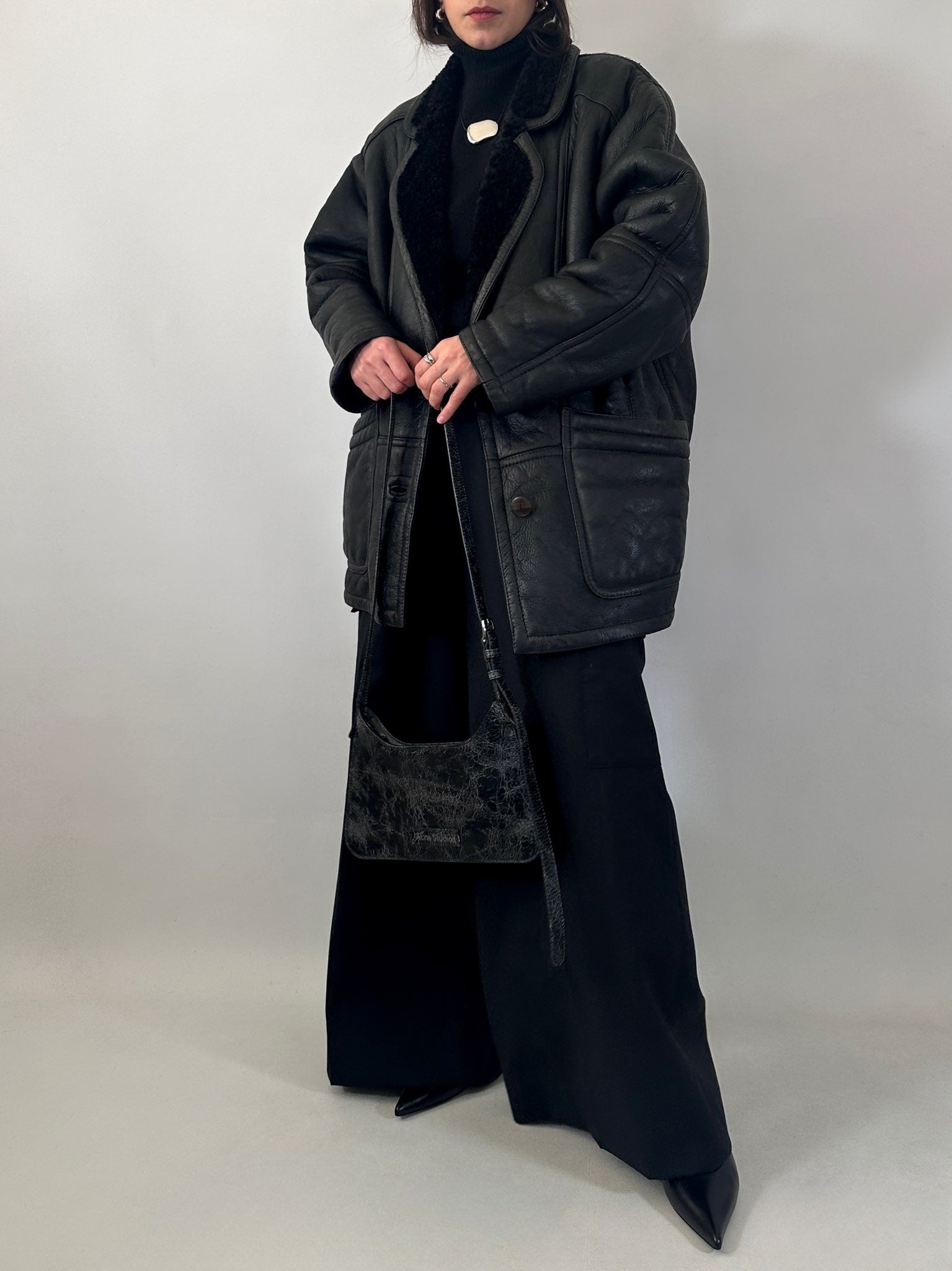 Styling tips: Si abbina perfettamente a total black, denim scuro o pantaloni sartoriali ampi. Il volume modellato dalle cuciture e la texture della pelle nera aggiungono carattere anche agli outfit più minimal.