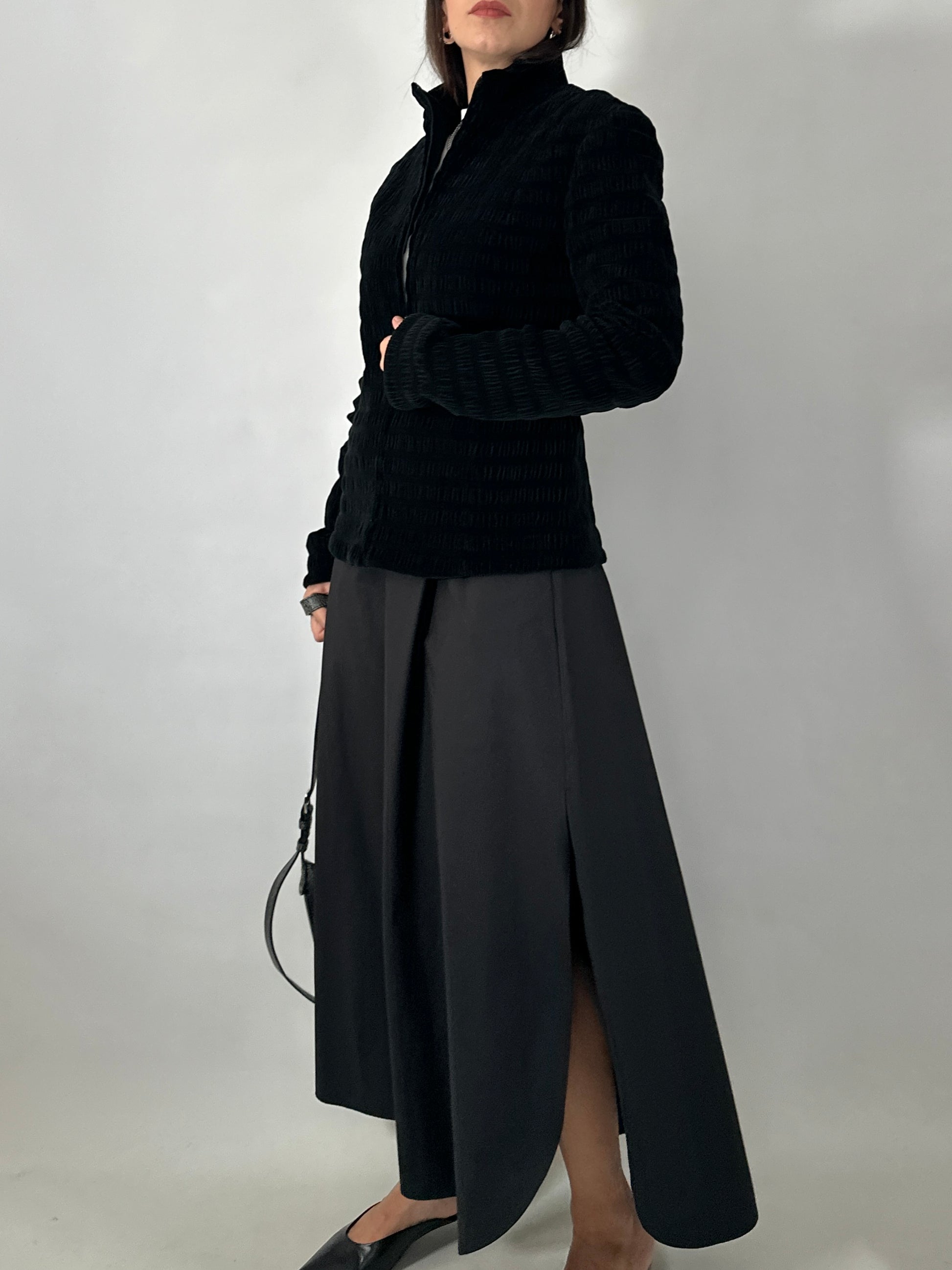 Giacca vintage Ferré Jeans anni ’90 in tessuto plissettato elasticizzato, dal design architettonico e minimalista.