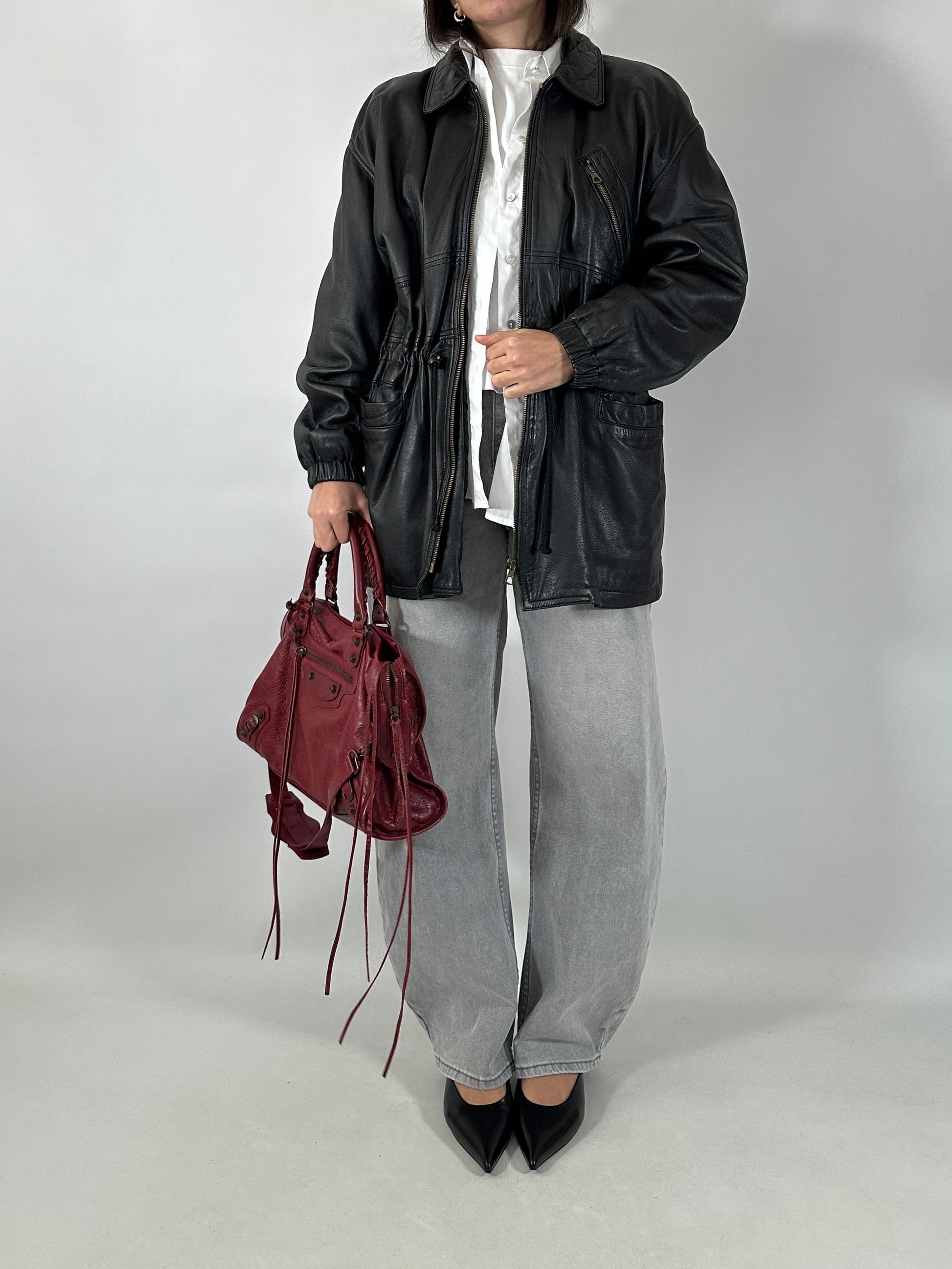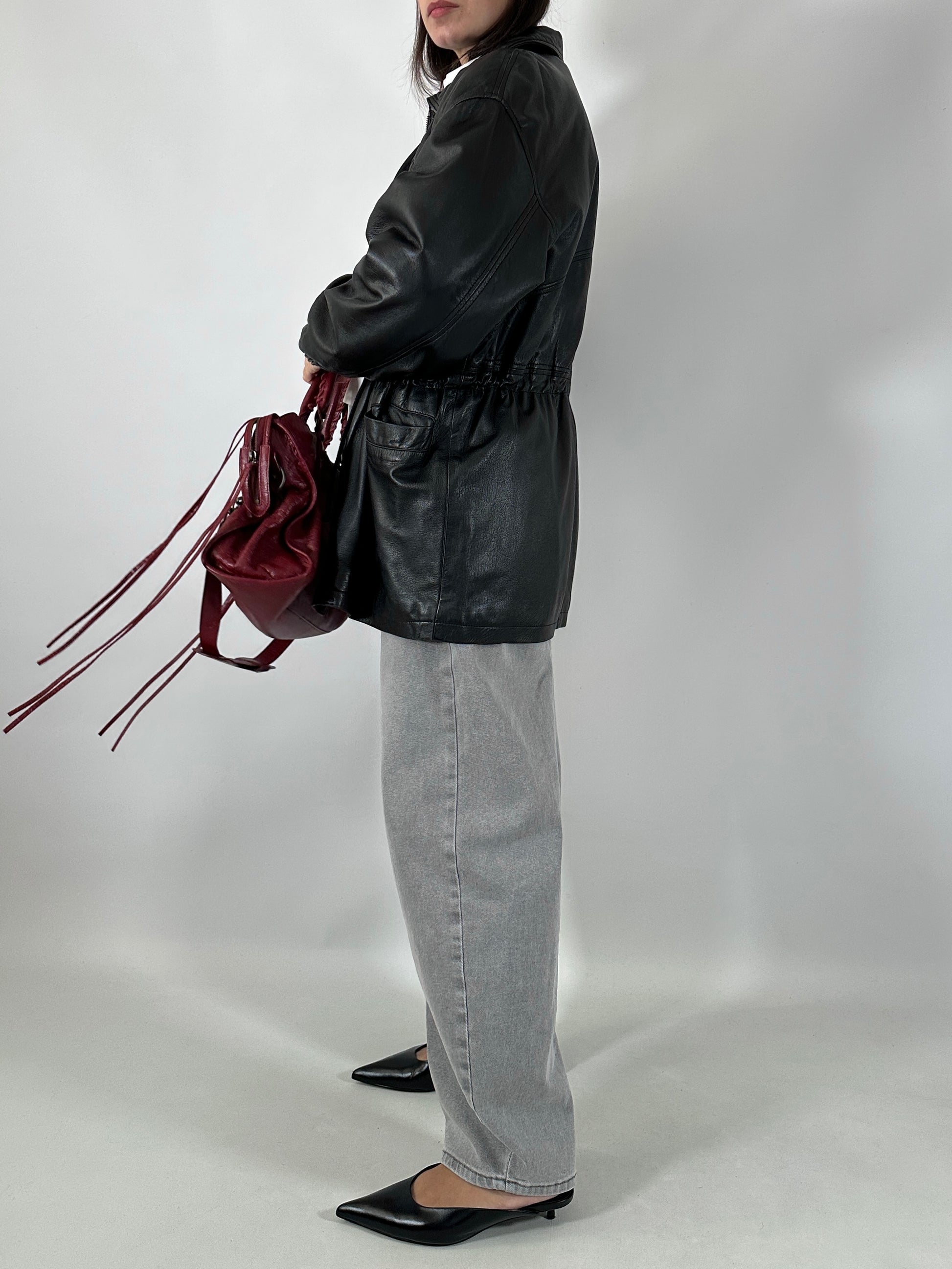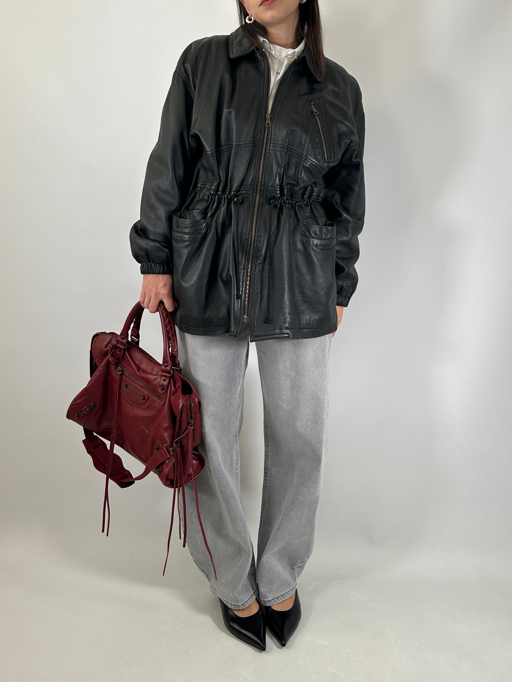 Giacca vintage in morbida vera pelle. Chiusura con zip centrale, colletto classico, elastico sui polsini, coulisse in vita che potete regolare per sagomare o meno la figura. Interno trapuntato con leggera imbottitura.