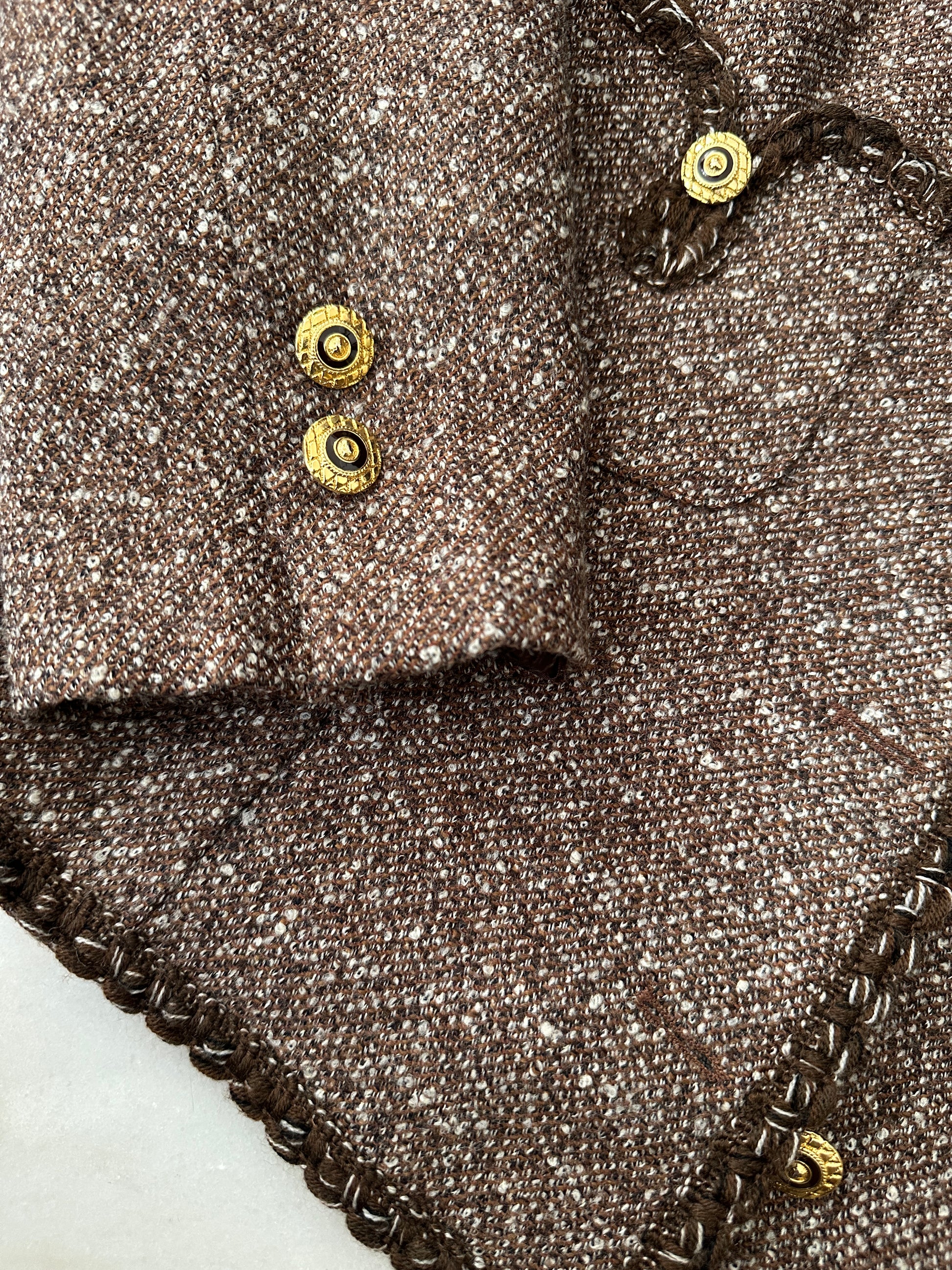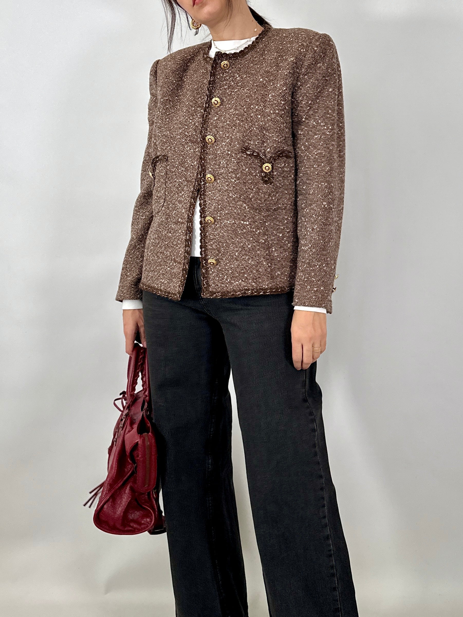 Giacca vintage Luisa Spagnoli in tweed mélange marrone. Spalle leggermente strutturate e linea dritta. Chiusura frontale con bottoni dorati decorativi, due taschine frontali con patta e bottone, e finiture con bordini tono su tono. Girocollo pulito e senza revers.