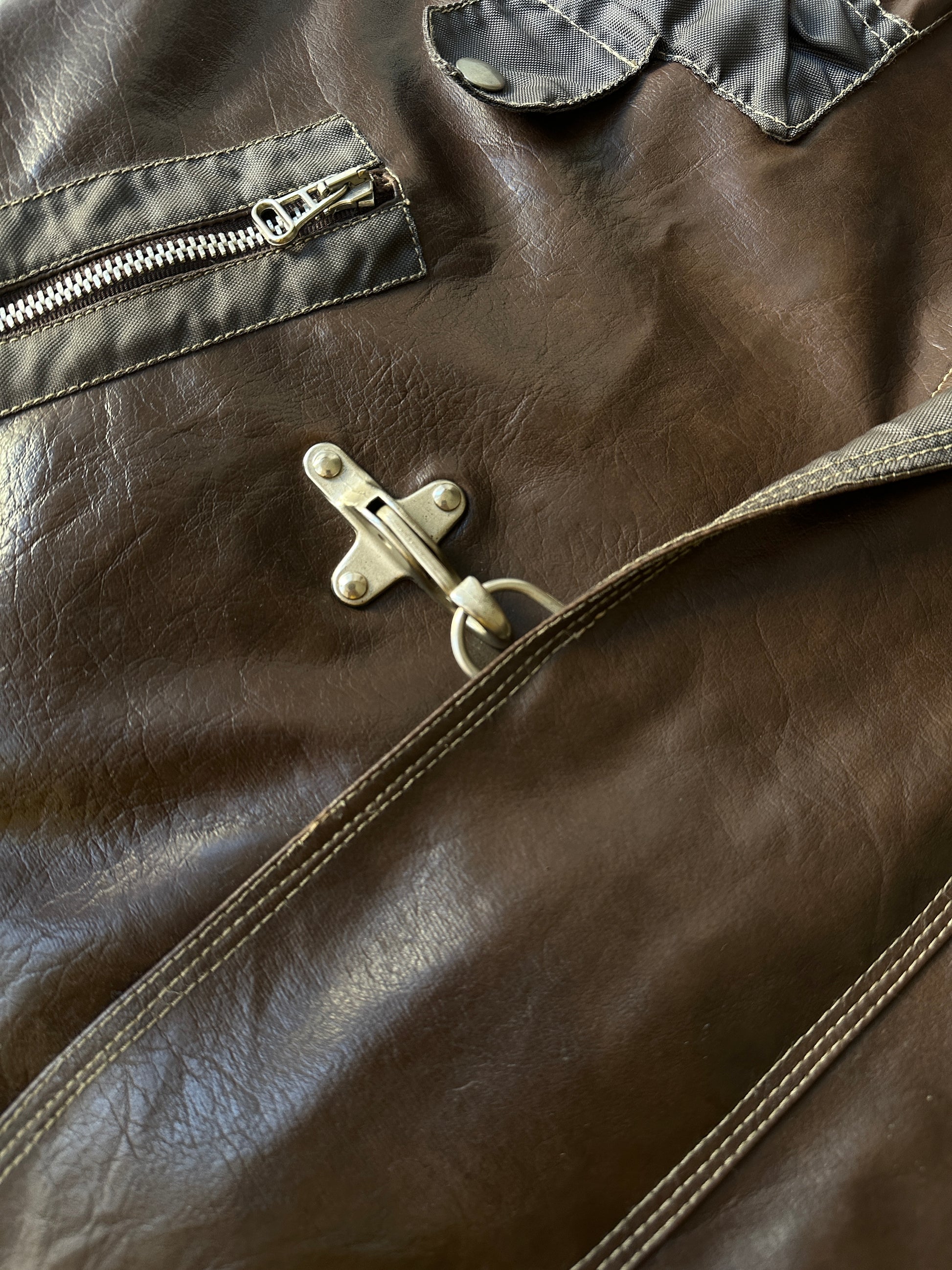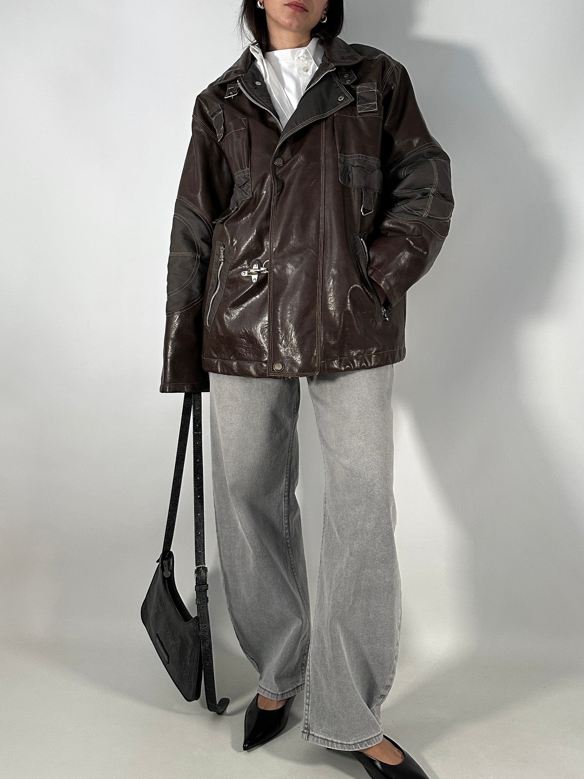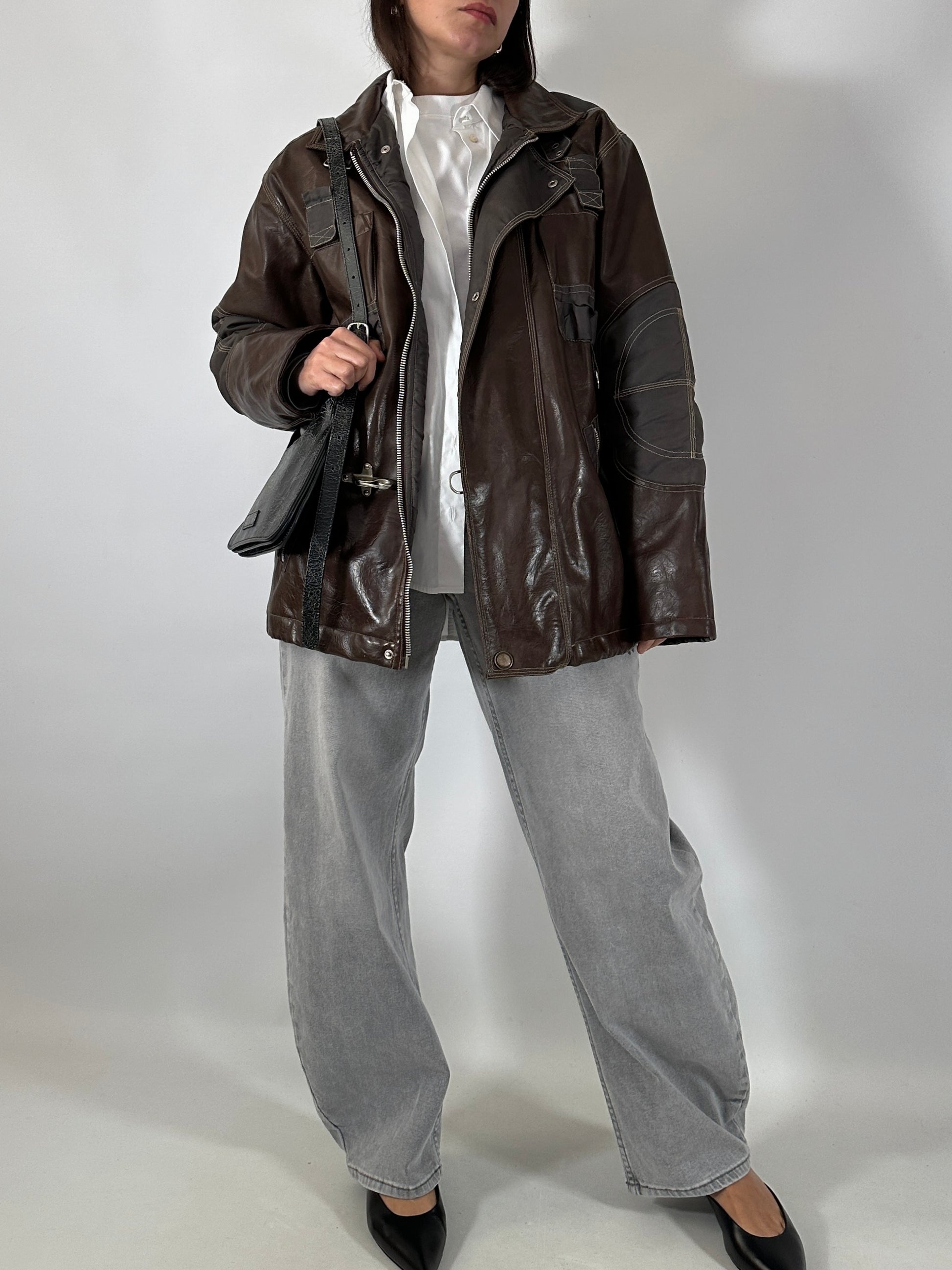 Giacca vintage in pelle marrone color cioccolato dal finish lucido. Inserti in tessuto tecnico tipo nylon, colore verde oliva(tonalità grigio-verde), e impunture decorative.