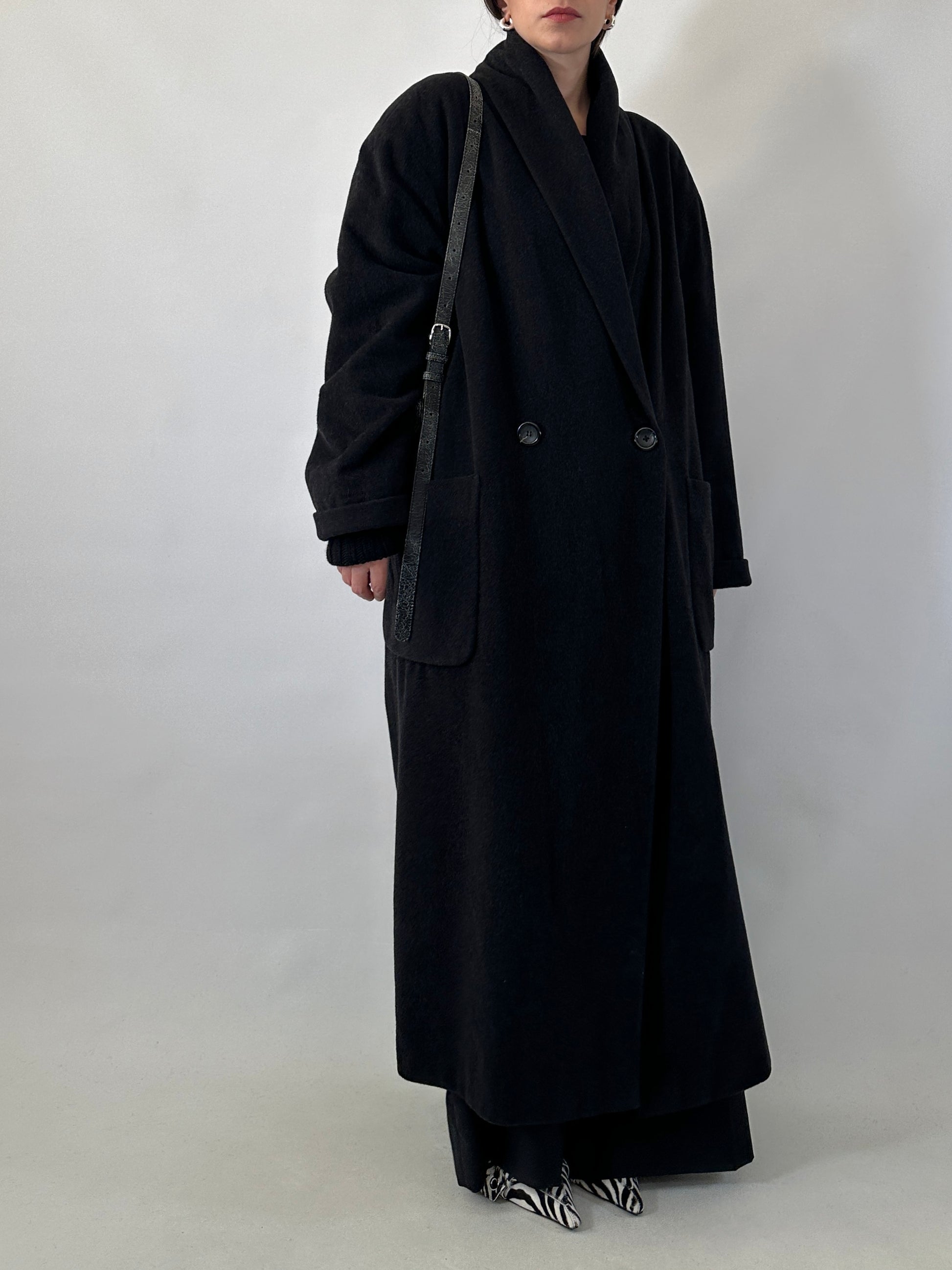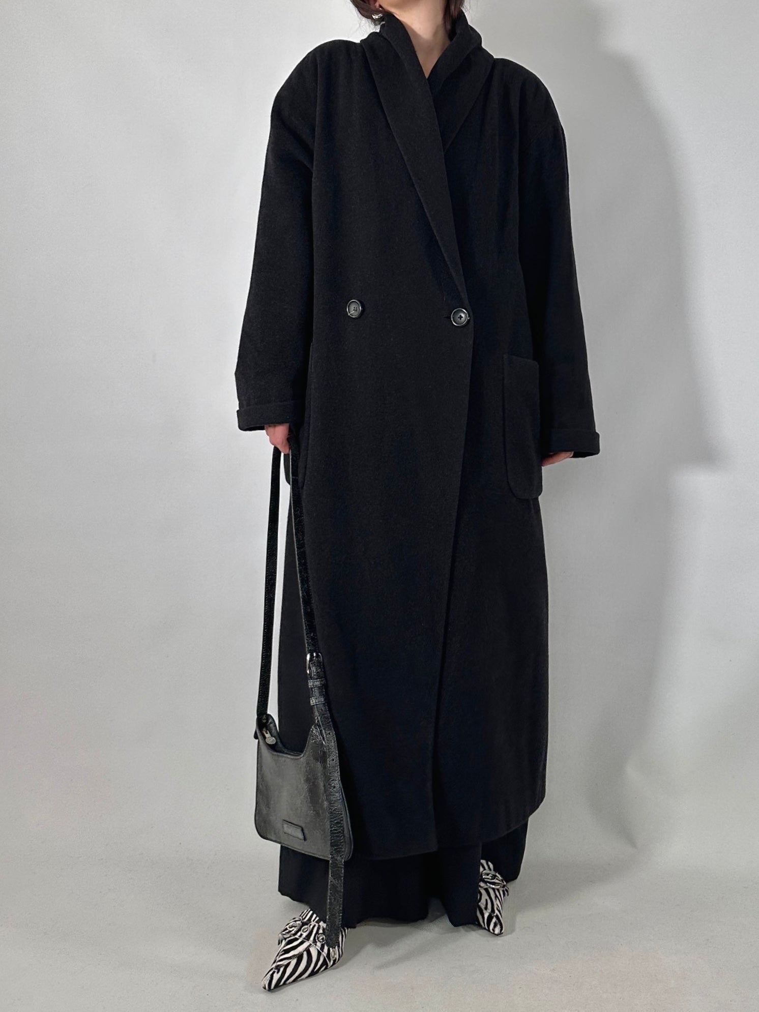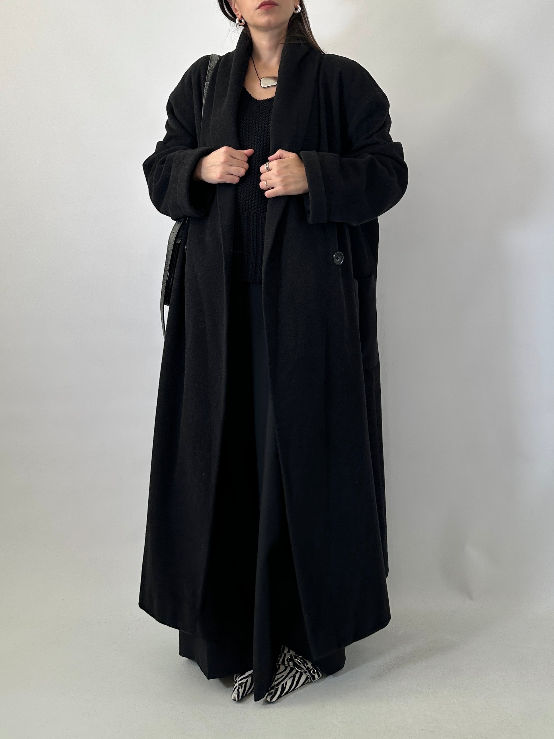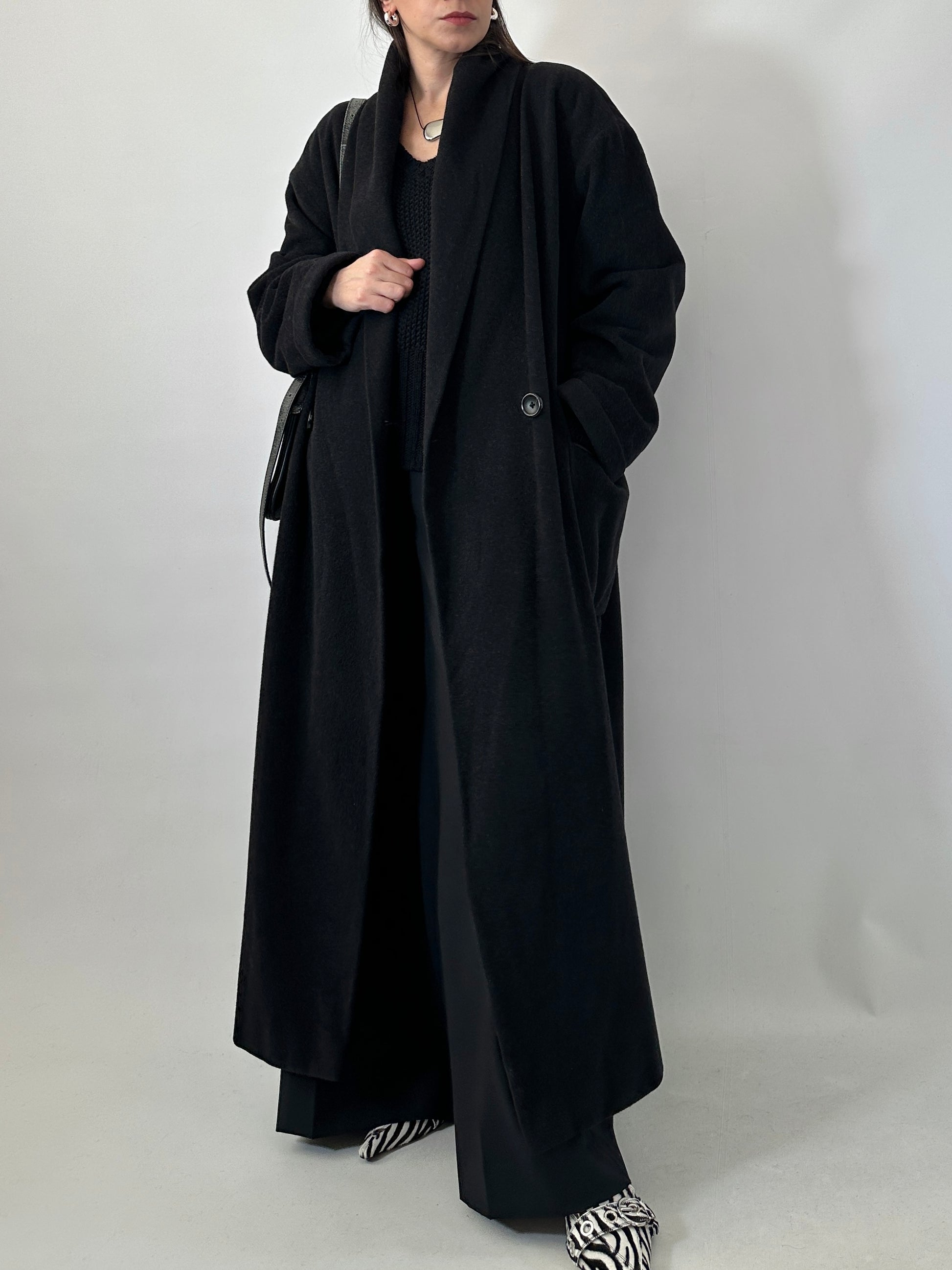 Cappotto vintage lungo in misto lana e cashmere grigio antracite, dalla linea essenziale e sofisticata. Il design è pulito e minimale, valorizzato dal collo sciallato ampio e avvolgente. Doppiopetto con due bottoni, tasche applicate frontali.
