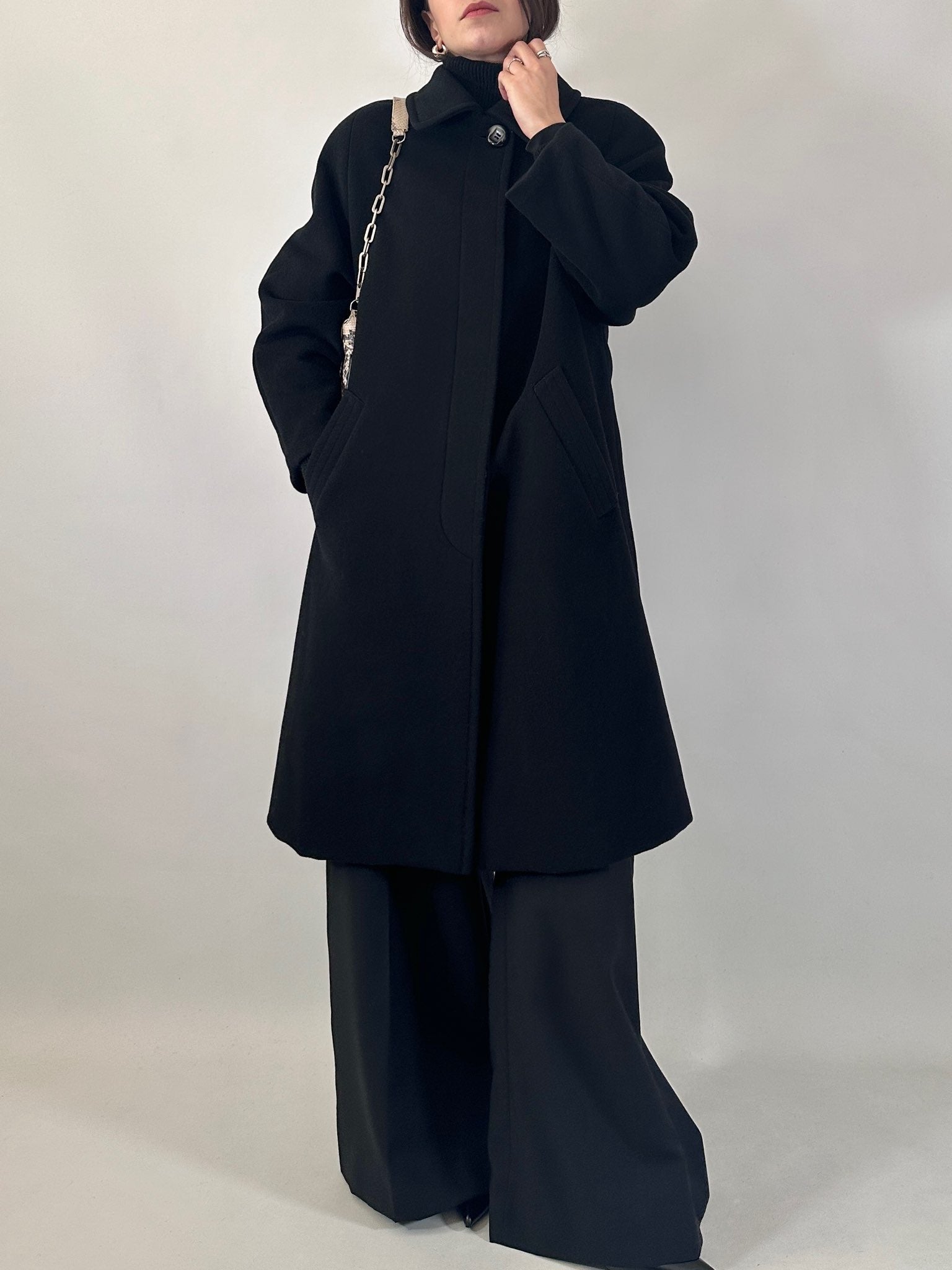 Il fit leggermente over e la lunghezza midi donano un’allure senza tempo, tipica dei cappotti sartoriali anni ’80.